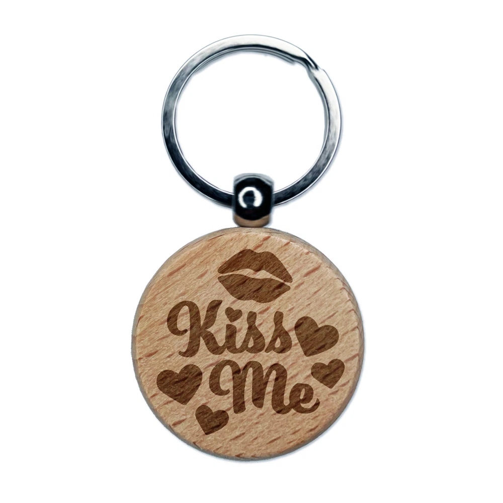 Dije llavero redondo grabado en madera para labios Kiss Me etiqueta