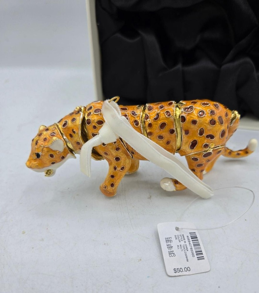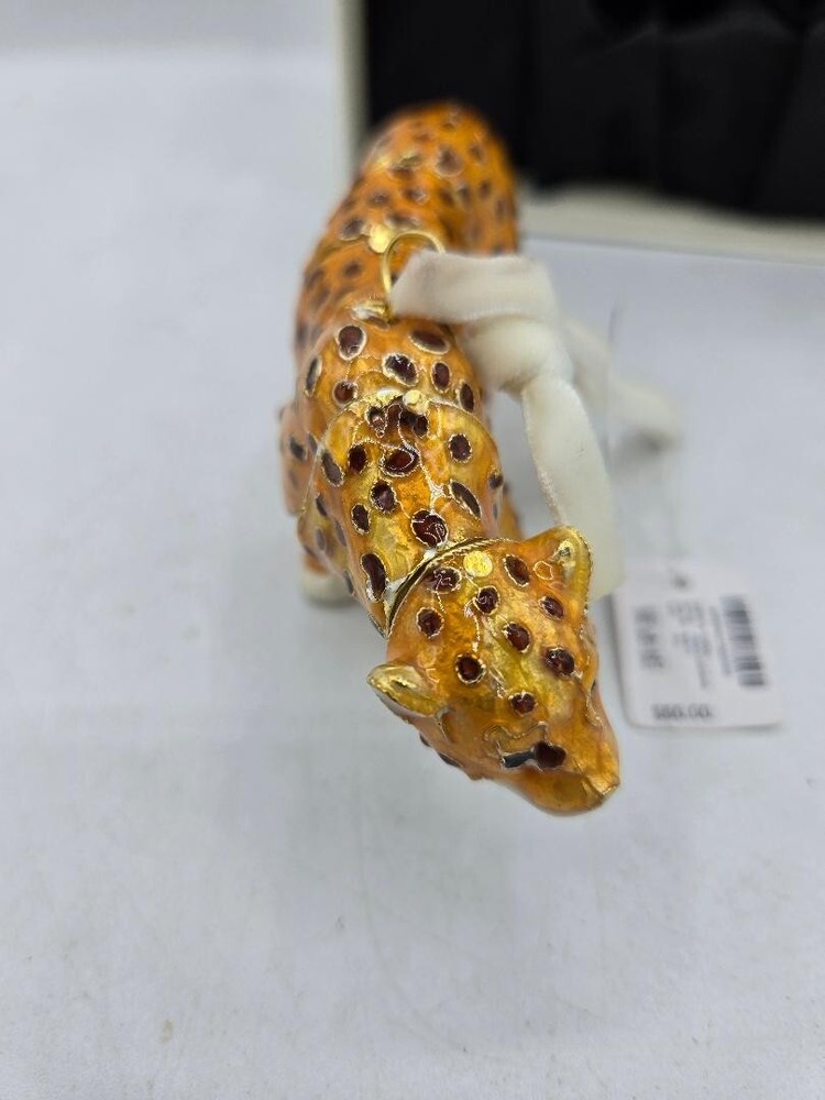The Dillard's Trimsetter Leopard Cloisonné Christmas Ornament is a stylish and eye-catching addition to any holiday decor. This collectible ornament features a leopard design crafted in cloisonné, a decorative metalworking technique. Made in China in 2020, this ornament is part of Dillard's ornament collection for the year and would make a unique and elegant accent for your Christmas tree or home decor. Room-K