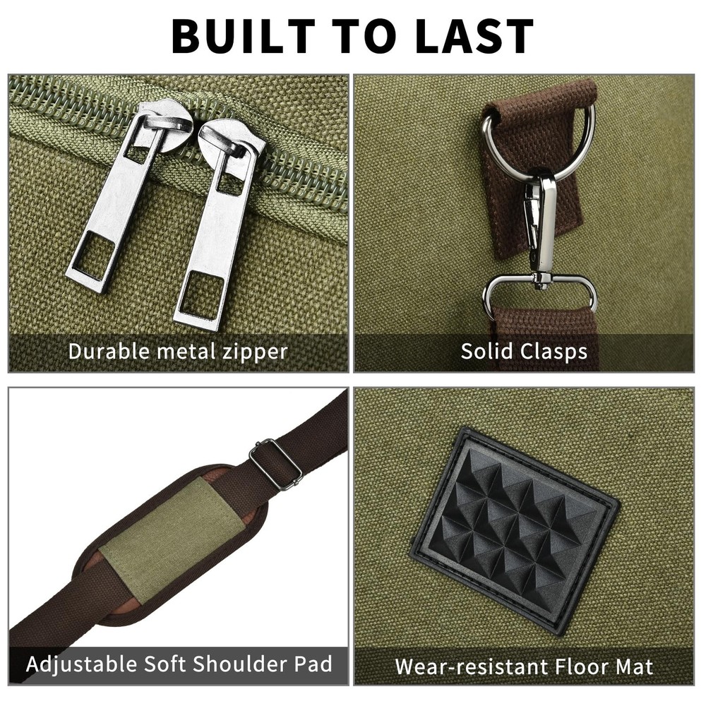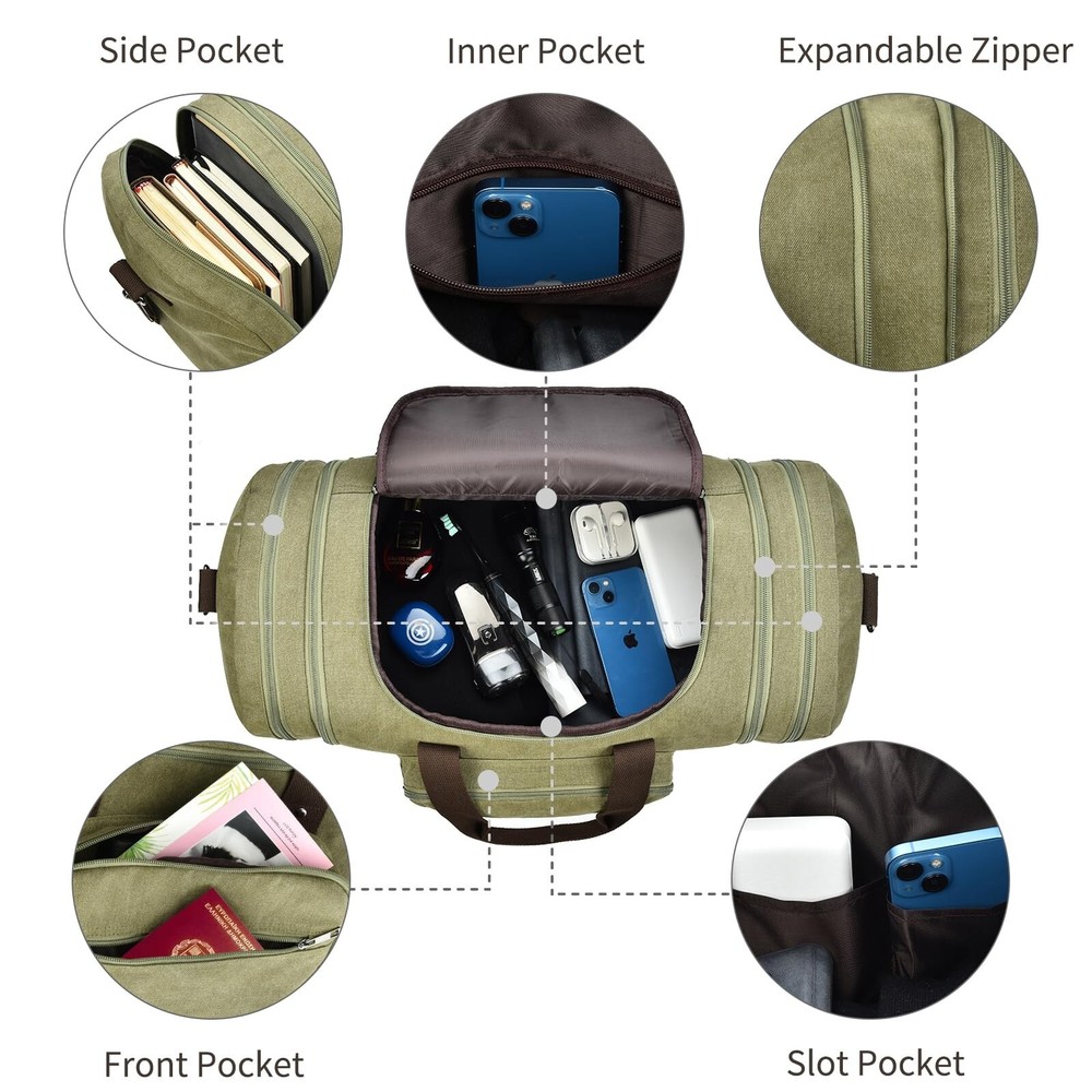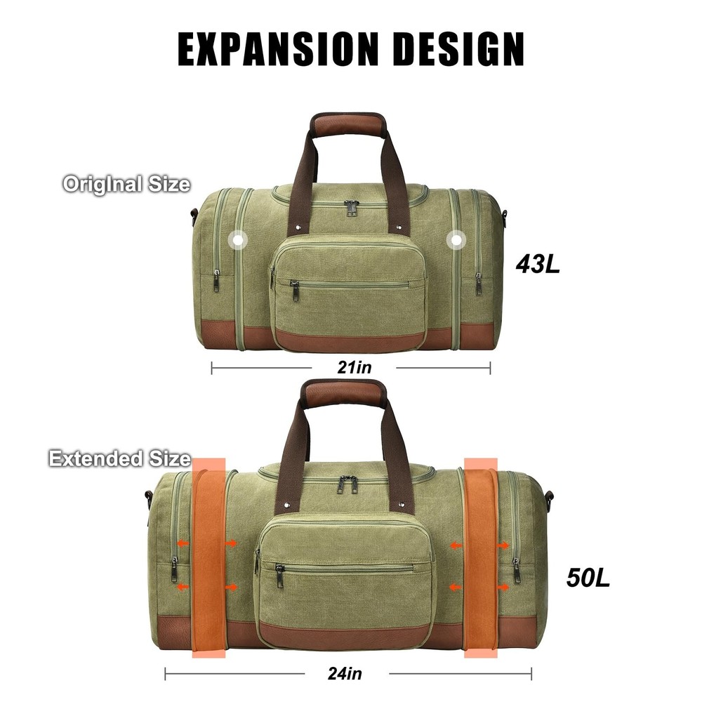 Dimayar Canvas Duffle Bag for Travel,Expandable Carry on Bag,Overnight Weekend Gym Bag Duffel Bag Mens Travel Bag (Army Green) Product Details Color: D Army Green Brand: Dimayar MPN: Does not apply UPC: Does not apply EAN: Does not apply Product Dimensions: 18 x 10 x 8 inches Item Weight: 2.53 pounds Department: Unisex Adult Manufacturer: Ensuite Double Country of Origin: China Number of Compartments: 1 Capacity Total: 50 Liters Expandable Design:The Canvas Travel Duffel Bag measures (L) 21 x (W) 12 x (H) 10.5 inches and can be extended to 24 inches with two side zippers. Large enough to store 5 or 7 days worth of necessities.The travel bag can be used as a carry-on flight bag. Material: 100% Brand New travel duffel bags made from high-density cotton canvas and classical bronze-tone hardware, with soft canvas lining, large & smooth zippers Large Capacity & Multi-Pockets: Duffle bag for travel Interior with 1 large main compartment,1 zippered pocket, and 3 small pockets. The exterior is equipped with two side zippered pockets and two front zippered pockets. With large capacity, the travel bags can accommodate 15 inch laptops, iPads, clothes, shoes, and other daily necessities Elaborate details: This duffel bag features a round stitched handle and a soft, adjustable, and detachable shoulder strap with three carrying options: hand-held, shoulder, or cross-body. It also has four high-quality plastic cushions at the bottom for durability and resistance to dirt Multipurpose: Suitable for both men and women, the Canvas Travel Duffel Bag can be used as a weekender bag, overnight bag, short-term travel bag, toiletry kit, camping bag, business bag, gym tote, carry-on luggage, or simply as an emergency bag