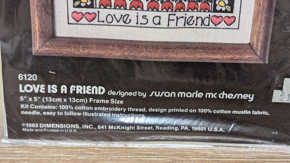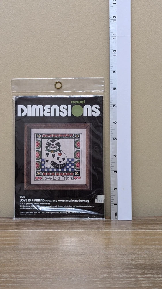 Dimensions Crewel Embroidery Kit #6120 LOVE IS A FRIEND 5x5 Cat Vintage 1983 **Designed by Susan Marie McChesney **SEE PHOTOS! This vintage item is New & Sealed in its original package! From a pet-free & smoke-free home. Shipped quickly and carefully from Kansas! Thank you for looking 😊 -------------------------