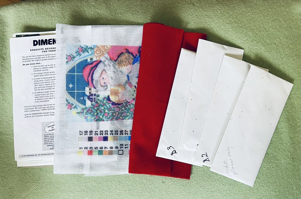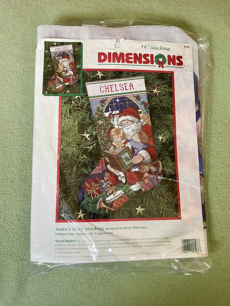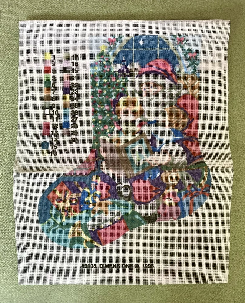 Dimensions Christmas Holiday Needlepoint Kit 9103 SANTA'S STORY STOCKING 1996. This kit is opened but hasn’t been started. It looks like the floss, yarn and filament has been sorted into 4 groups in 4 envelopes. See photos. Comes with 2 needles, canvas, instructions, felt backing, floss, in original packaging. Makes a 16” stocking. This is a lovely and rare stocking kit for that special someone. Comes with alphabet stitching guide for personalization. What a wonderful project and a labor of love to give to someone special. Sold as-is. Thank you for looking.