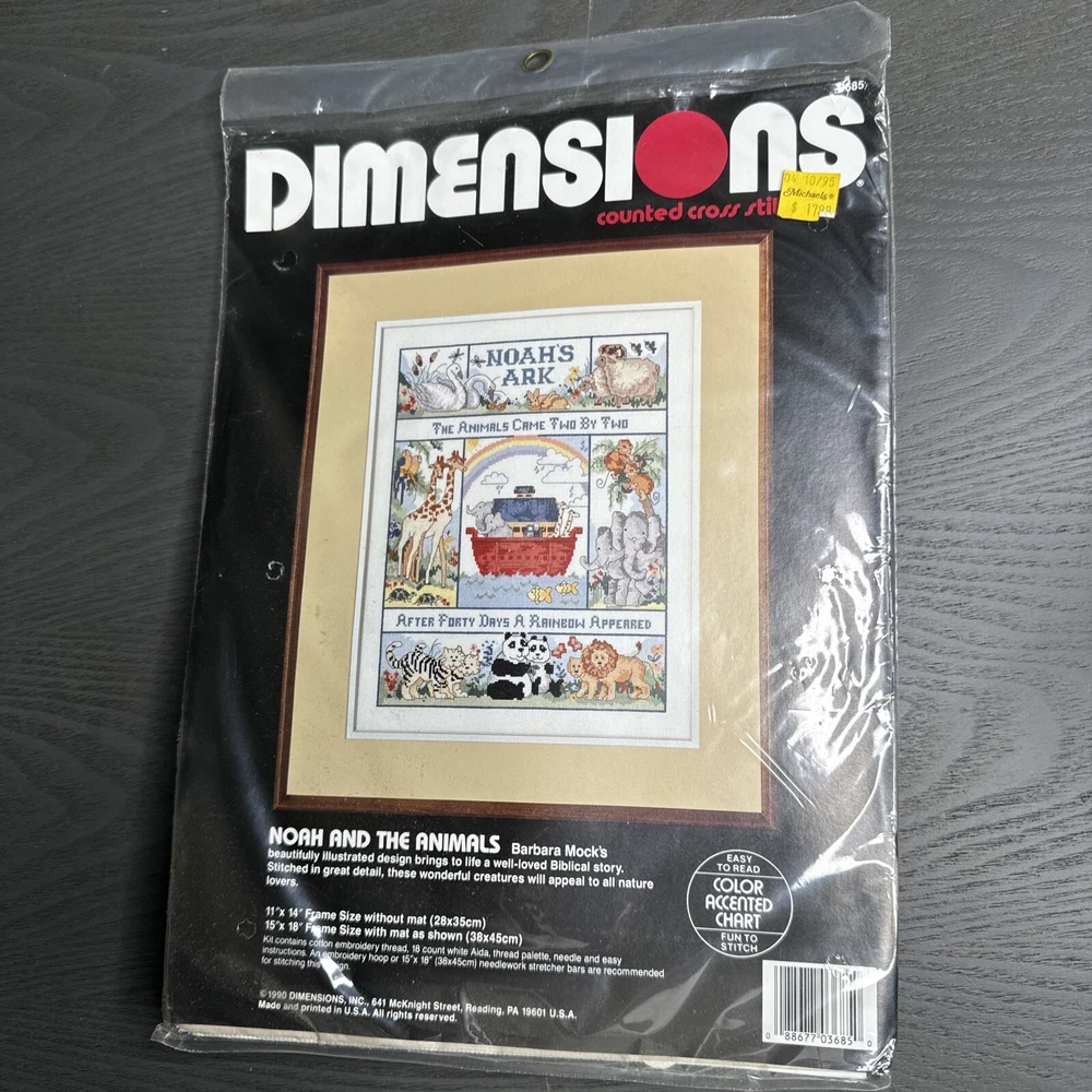 This Dimensions Noah and the Animals Counted Cross Stitch Kit (model 3685) is a perfect addition to your collection of antique and history-themed crafts. The kit includes embroidery floss and fabric/cloth bundled with everything you need to create a beautiful cross stitch piece. The style of this kit is a sampler, featuring a frame-free design that is perfect for any skill level. The kit is made in the United States and is ideal for those who love to work on cross stitch projects. The theme of this kit is Noah and the Animals, making it a perfect gift for anyone who loves animals or historical crafts. Add this kit to your collection today and start creating a beautiful piece of art that will last a lifetime.