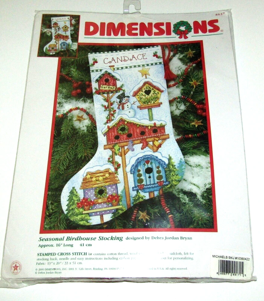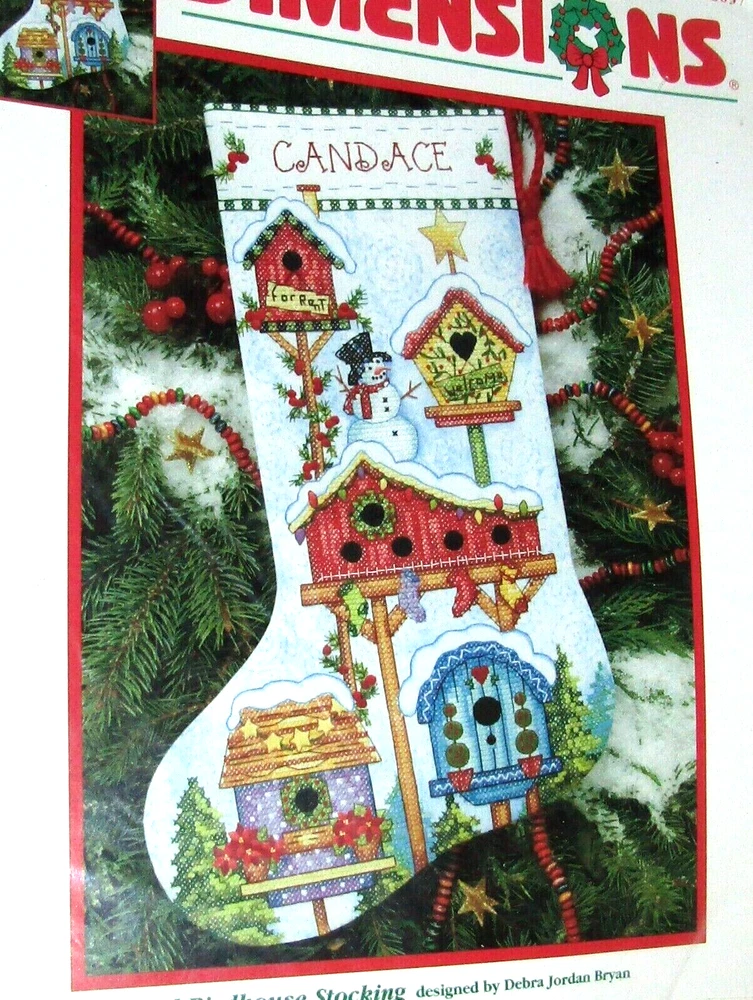 Dimensions Seasonal Birdhouse Stocking Stamped Cross Stitch Kit Kit includes: cotton thread, wool yarn, printed white sailcloth, felt, needle, and easy instructions with an alphabet Fabric: 13" x 20" Approximately 16" long when completed New