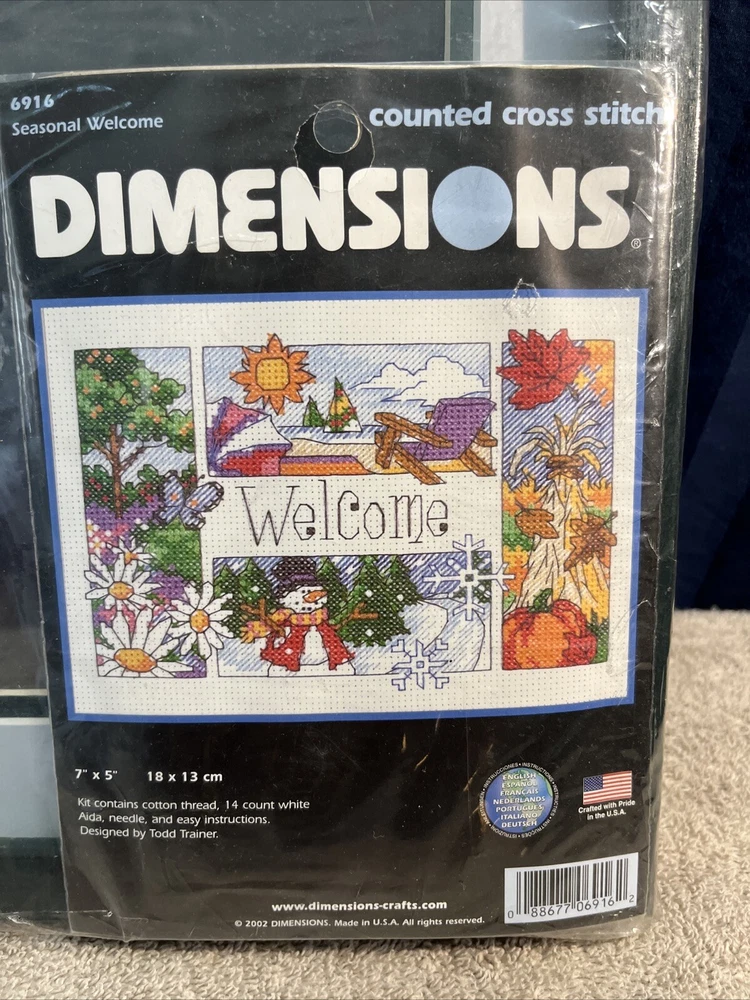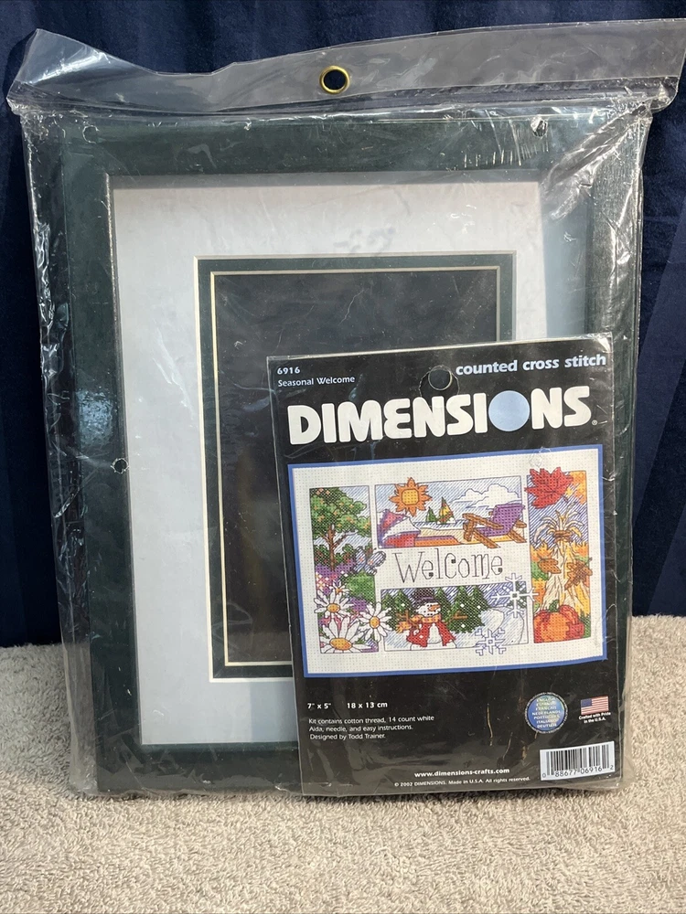 Dimensions Seasonal Welcome 6916 Counted Cross Stitch Kit 7 x 5 W/Frame C3 This cute sampler will look so cute when you get it done. It comes with a frame and mat, along with the sampler. Please see all the pictures before you purchase. Thank you for looking at our listings. We will combine shipping when possible. We will send this either by USPS or FED EX. Whichever is the cheapest way. If there is shipping over payment, we will refund you the difference. Feedback is appreciated. If you have any problems, please contact us before leaving feedback. We will do whatever we can to resolve issues. Have a great day.