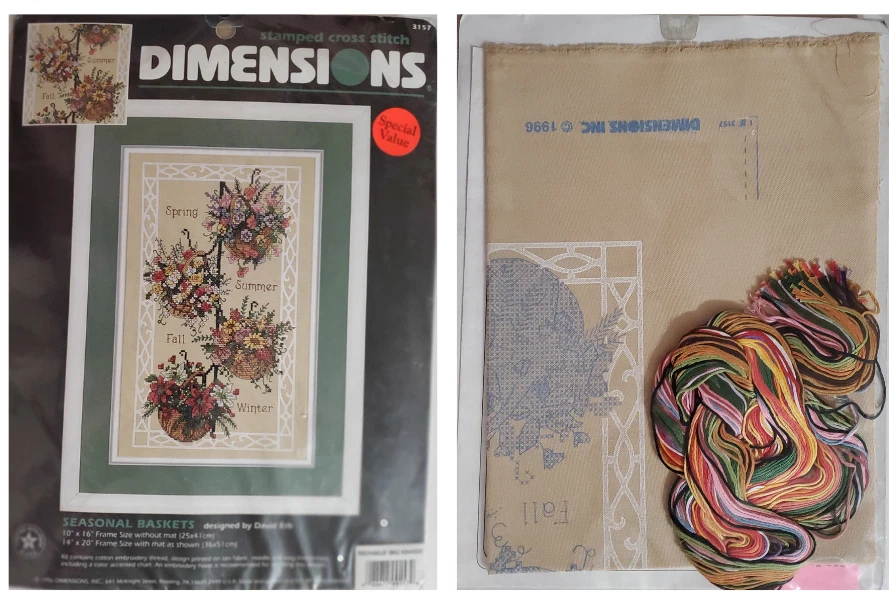 Dimensions Seasonal Baskets 3157 stamped cross stitch kit contains floss, printed tan fabric, needle and instructions. Finished size is 10 X 16 inches. Thank you for looking and happy stitching! Please see my other listings on TamiKay 2.