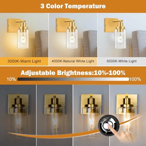 Dimmable Battery Operated Wall Sconce Set of 2, Gold Wireless Rechargeable Wa...