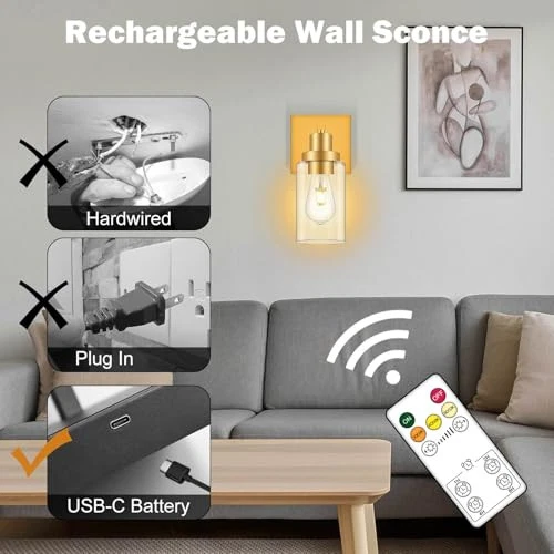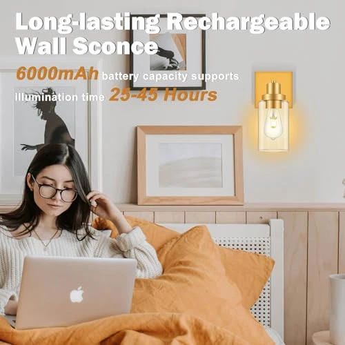 【10-100 % Stepless Dimming & Memory Function】Equipped with a sensitive touch button on the right side, this rechargeable wall sconce allows for effortlessly on/off with a gentle tap, and a long press can easily adjust the brightness from 10% to 100%, catering to your diverse lighting preferences. Furthermore, our wireless wall lantern boasts a highly practical memory function that retains the last set brightness level, ensuring the same lighting effect without the need for manual adjustment 【Easy Installation & Versatile Applications】The package includes all necessary accessories, making the installation process simple and quick. Within a few minutes, you can install our rechargeable wall lamp and have it ready for use at any time. At the same time, these wall light fixtures are suitable for various areas, such as porches, doorways, bedrooms, and living rooms, as well as places such as cafes and hotels 【6000mAh Battery】This battery powered wall sconce requires no wires to be connected and the wall sconce has a built-in 6000mAh battery that lasts up to 25-45 hours. The charging port on the right side of the wall sconce can be charged directly via Type-C if you are close to an outlet 【Remote Control Dimmable/Timabl】You can turn on the light or adjust the brightness of the light by remote control. When you are lying in bed and ready to sleep, you can turn off the light regularly (1hour/2hour/4hour/8hour) 【Stylish & Versatile Style】This rechargeable battery wall sconce has such a sleek design and with a unique aesthetic, that brightens and updates the space without being too bold looking. It also blends in with modern decor, and we think it could easily in most home styles as well