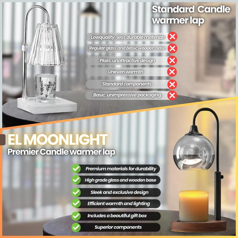 Candle Warmer Lamp Dimmable with Timer - Adjustable Height Electric Wax Melt Warmer for Candle Jars Room Decor - Special Occasions Product Details Base Material: Metal Product Dimensions: 1"D x 1"W x 1"H Item Weight: 1.7 Pounds Lamp Type: Table Lamp Shade Color: Black Product Dimensions : 1 x 1 x 1 inches; 1.67 Pounds Item model number : XX2405 Date First Available : April 20, 2024 Manufacturer : El Moonlight Country of Origin : China Customer Reviews: 4.9 4.9 out of 5 stars 28 ratings Base Material: Metal Product Dimensions: 1"D x 1"W x 1"H Item Weight: 1.7 Pounds Lamp Type: Table Lamp Shade Color: Black Shade Material: Stainless Steel Switch Type: Dimmer Style: Modern Brand: El Moonlight Color: Black Special Feature: Corded Light Source Type: Halogen Material: Iron Room Type: Bedroom Recommended Uses For Product: Decoration Power Source: Corded Electric Number of Light Sources: 1 Connectivity Technology: USB Included Components: Power Cable Mounting Type: Tabletop Number of Items: 1 Lighting Method: Dimmer Control Method: Touch Indoor/Outdoor Usage: Indoor Water Resistance Level: Not Water Resistant Number of Pieces: 1 Connectivity Protocol: Homeplug Is Cordless?: No UPC: 198168726440 Manufacturer: El Moonlight Part Number: El0002 Item Weight: 1.67 pounds Country of Origin: China Item model number: XX2405 Special Features: Corded Batteries Included?: No Batteries Required?: No Date First Available: April 20, 2024 FLAMELESS & SAFE FRAGRANCE DIFFUSION: Enjoy safe, flameless fragrance with our electric candle warmer. It melts wax, jar candles, and cubes, creating a cozy ambiance without open flames. Perfect for vintage home decor and home accents. DIMMABLE LIGHT & EXTENDED CANDLE LIFE: Set the perfect ambiance with adjustable dimmable light. Gentle, consistent heat melts wax and candles evenly, extending their life while enhancing your room decor. TIMER FUNCTION FOR CONVENIENCE: Our built-in timer allows you to set a shut-off time while you enjoy your favorite scents. Whether you use it as a bedroom nightlight, in your office, or as a functional home accent, it makes a great gift for moms, friends or your loved once on Christmas list. VINTAGE HOME DECOR: With its chic bronze finish, Our candle warmer blends seamlessly into modern or classic decor, adding a stylish touch to any room. PERFECT GIFTS FOR WOMEN: Ideal for women, moms, or young girls, this candle warmer makes the perfect gift for birthdays, Christmas, or housewarmings.
