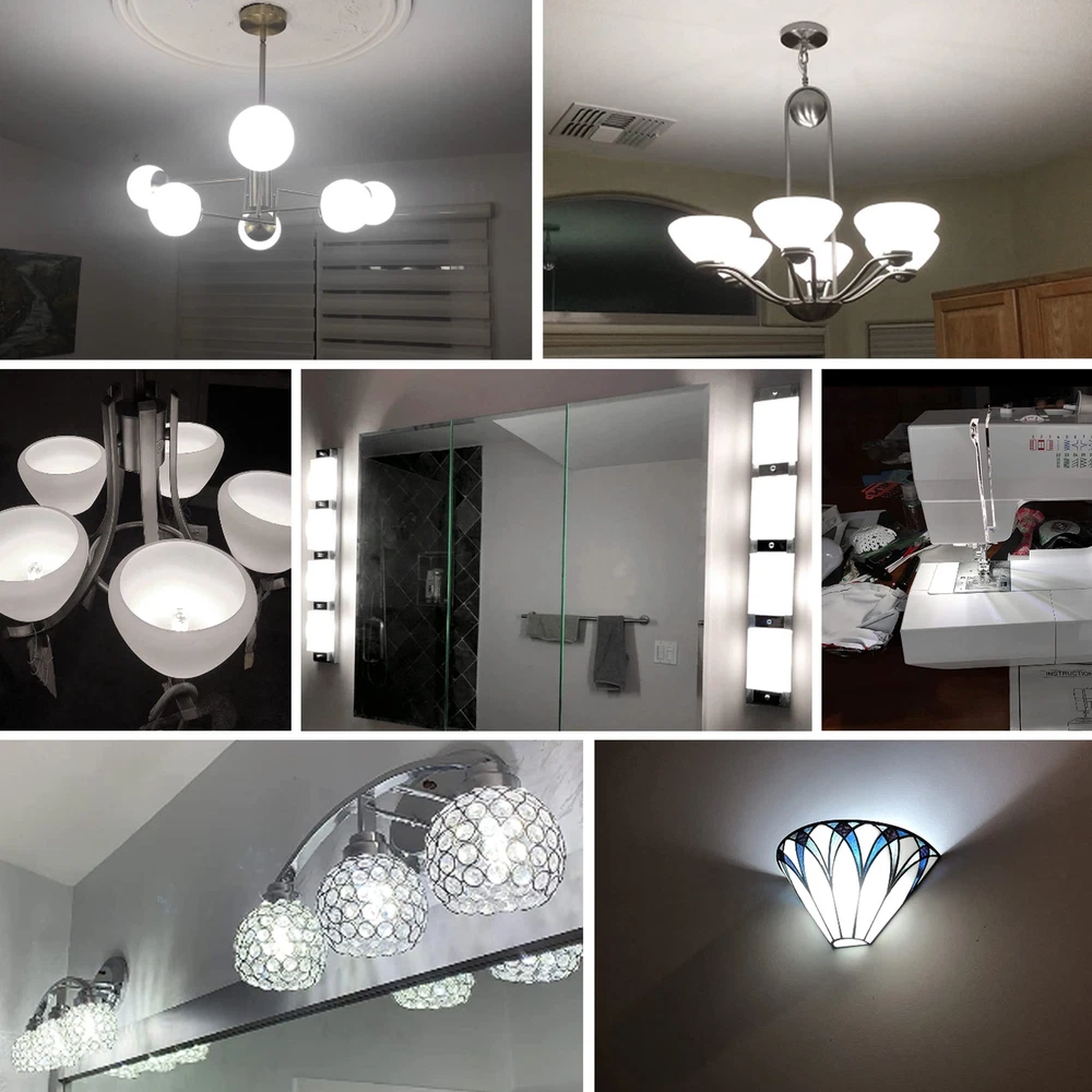 Small Size: E12 6000k daylight 5w dimmable led bulbs' size 0.65x 2.05inch Base: E12 candelabra edison screw socket,which means the diameter of the base is 12MM, NOT E11 Dimmable and No Flicker: Can adjust the E12 bulbs to be bright or dim, wider dimming range. Compatiable with most led dimmers,No flicker,No buzz,Not hot,they also can be used as non-dimmable bulbs Energy Saving: E12 dimmable led bulbs 5w is 450lm, bright enough to replace Kx 2000 E12 40 watt halogen,save your electricity bill.CRI over 80Ra, E12 6000k cool white provide very bright white high lumens Long lifespan: We use high quality driver brand led chips and good heat dissipation design for our E12 led bulbs to ensure 30,000 hours lifespan Widely applications: E12 led bulbs fit for ceiling fan light, chandelier, pendant lights, salt lamp, window lighting, wall sconce, desk lamps, porch lights, accent lighting, art galleries, hallway sconces,turkish lamp, exterior lantern lighting fixtures, perimeter lights and drive lights, persian lamp, dryer, driveway latern, typical night lights, porch lamp, outdoor Christmas display, outdoor sconces, bathroom vanity mirror, LED porch bulbs, overhead light, etc Important: LED bulbs are more sensitive to power fluctuations, if you find the bulbs flicker please try it on a different fixture. And one of our customers suggest" if bulbs flicker in ceiling fan, please try to turn on the wall switch firstly, they will not flicker unless another light on the same circuit was turned on"