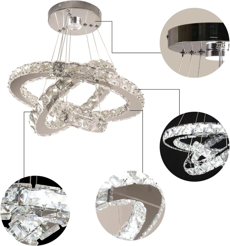 This stunning chandelier instantly elevates any room with its modern three-ring design and sparkling crystal accents. The dimmable LED lights create the perfect ambiance, while the remote control makes adjusting brightness effortless. The sleek stainless steel finish adds a luxurious touch, and the adjustable height ensures it fits beautifully in bedrooms or living rooms. Installation was straightforward, and the quality feels premium—definitely worth the investment for a stylish upgrade!