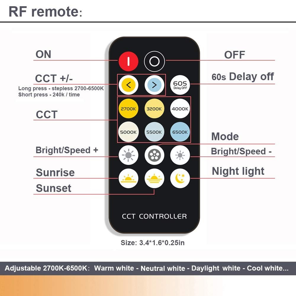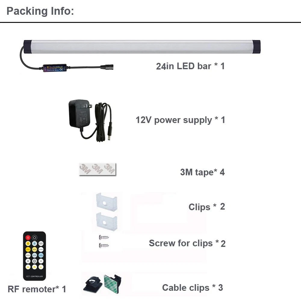 Features: Guarantee: "" All of our lamps come with a full 3-year warranty. Long life,low power consumption,low heat generation,released high intensity,Maintenance free,easy installation. High brightness,excellent quality,stable performance,and wide lighting angle. The aluminum profile is with nice coating treatment so it looks elegant. Specifications: Luminous Flux: 720-800Lm Wattage: 8W Emitting Color: Warm/Natural/Neutral/Daylight/Cool White Voltage: AC100~240V, DC12V Shell: U shape Aluminum alloy shell Waterproof: IP50 Size: 24 * 1.0 * 0.33inch (L*W*H) Individul/Group Control: The RF remote control factory set is one-to-one remote control mode. When you need a remote control to control multiple lights, please restart all the lights require to control at the same time (unplug the power and plug to restart) and then long press the red button of the remote control turn on the lights untill all the lights turn white, that means the simultaneously control multiple lights setting is successful. Package Included: 1PC - 24in LED Bar 1PC - 12V power supply 1PC - RF remote control 4pcs -3M tape 2pcs -Clips 3pcs -Screw for clips 3pcs -Cable clips Guarantee: If you are not satisfied for any reason, Please "Contact Seller" directly. We aim to provide best services and promise to reply all emails in 24 hours. No hassles, no delays, and no unnecessary questions asked! 【RF remote & CCT】The wireless remote control can control the color at any time within the effective distance(MAX 66ft) without failing due to obstacle blocking. Use the CCT shortcut key to select common lighting such as warm /natural/daylight/cool white etc or use the CCT +/- key to steplessly change the color temperature light between 2700-6500K. 【Dimming & Dynamic mode】Long press to get 1%-100% stepless dimming; short press for 7 level dimming. Built-in 6 dynamic: warm white/neutral white/Cool white fade & Jump. 【Memory function】It will stay on the brightness level/color/mode you set last time when power back on, Can work with Smart Plug or Timer. 【Durable & Safe 】Made of aluminum and plastic, low profile and light weighted, frosted PC cover makes the light softer for the eyes. The voltage of this light is DC12V that makes them safe to touch. 【Easy to Install】It can be installed by yourself in seconds. two flexible mounting ways: Double sided tape options(no damage to the cabinet ) or Simple screws method.