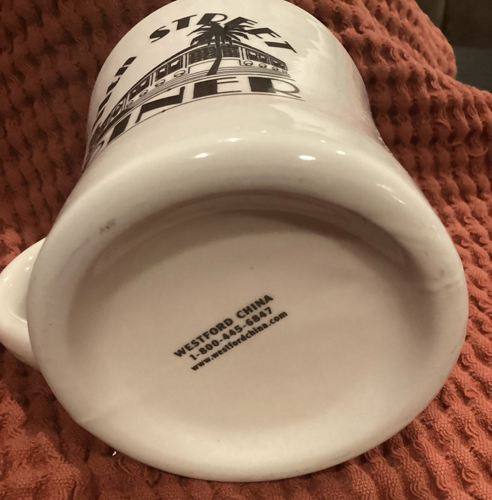 The Diner Mug from the 11th Street Diner in Miami Beach, Florida is a vintage collectible piece that doubles as a functional kitchen item. The white mug features a retro design inspired by classic diners, making it a charming addition to any home. Perfect for enjoying a cup of coffee or tea while reminiscing about the nostalgia of days gone by.perfect condition.