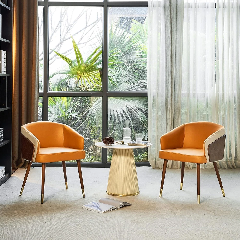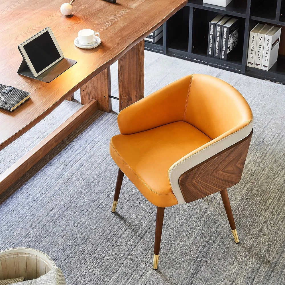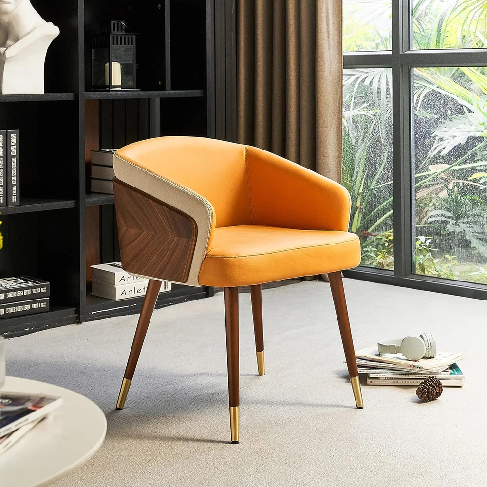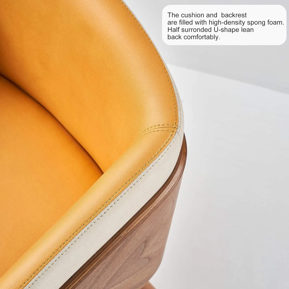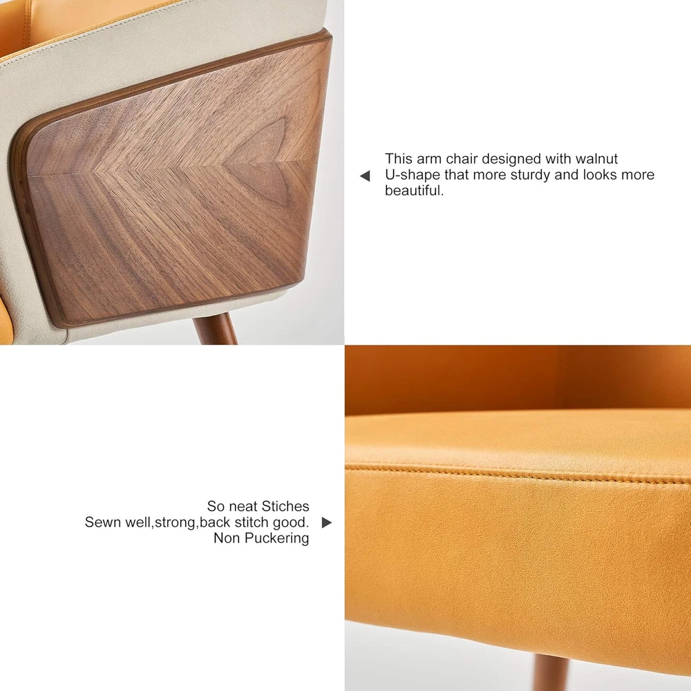 【Stylish Home Décor】:This guest room chair with exposed plywood arms, walnut wood finish of back side and with upholstery back of leathaire fabric upholstery seater is soft and comfortable,Walnut wooden legs and gold-plated foot cap,modern and fashion. 【Relax and Enjoy】:The half-wrapped of the arm chair back and cushioning with high density foam. The armrests and upholstery cushioned seat offer maximum comfort& cozy. Strong frim and well cushioned, It's nice for long conversation or work,.Pefect to be: dining chairs,home chairs, computer chairs,make up chairs, side chairs, reception chairs and club chairs. 【Stable & Durable】:The cafe arm chair holds over 280lbs with its lightweight and sturdy construction. With plastic plug to prevent floor from scratching with anti-slip effect for sensitive flooring. 【Multi-Purpose Use】:Modern style is perfect match most home decor, fit for your living room,,bedroom, dining room, study room, dorm,lobby, and widely use in reception and makeup vanity. 【Measurement】:Overall:21.7Dx21.3Wx28.7H inches;Seat : 18"W x 18.5"D;Seat height: 18.1". Easy assembly with 4 feet accessory only Product Description Product Description and Dimension Scene Graph ARTPLAN Dinning Room Accent Arm Chair by Leathaire for Kitchen Living Room Home Office Description: This chair has enough contemporary yet classic elements to blend in with your existing style. Clean lines, foam filling and fabric covering give this piece functionality as well as smart design, the wooden legs and slat arms are perfectly styled for the mid-century look. It will be suitable for those urban dwellers with limited space. Simplistic yet chic. Is a beautiful piece for the contemporary household. S uperior Features: With elegantly leathaire fabric accent multiple locations available design, it can not only provide a unique appearance, but also provide comfortable arm support. Bring a very stylish and Chic look to your home. Beech textured solid wood legs with gold-plated metal foot caps add a sense of luxury. It comes with plastic plug for the bottom so you without worrying about scratching up your floor. The cushion and backrest are filled with high-density spong foam, which provides excellent cushioning. The chair back is half surrounded , so you can lean back comfortably. Skin-friendly modern leathaire fabric, which is soft, attractive, and quite wear resistant. It’s rich and beautiful, to add brightness and modernity to living room. Chairs also used for dinning room ,kitchen and home office P roduct Details: Fabric:Leathaire Frame Material:Plywood、Beech Solid Wood Legs Foot caps Material: Zinc Alloy Overall size: 22.5"W x 21.7"D x 27.5"H; Seat size: 18.8"W x 18.5"D; Seat height: 18.1" Back Height:11.8" Product Include: - 1 * Accent Chair - Assembly Hardware - Assembly Manualr Product details part 1 Elegant U-shape design The cushion and backrest are filled with high-density spong foam. Half surrounded U-shape lean back comfortably. Double-layer back design in arc shape,providing you a better back support.Sit closer,feel more. Sturdy plywood and walnut Sturdy plywood inner layer with walnut outer that modern, fashion, designer gives you more all new upgraded. Natural walnut wood is petty good and beautiful. Surrounded all backrest from left to right, let is stronger and safely. Reinforced stiches Faux leather with strong sewn to be a high quality chair. Cut & Sewn good, the stiches are straight. Full seater, neat details for this chair and do by good density foam. Product details part 2 A reasonably good fit Texture natural wood grain. Cut & Sewn good, well combined with plywood frame. Clear layers , color matching is so good that could be a great chair. Fashion modern and beautiful foots Beech wood legs that more sturdy and looks more beautiful. Textured solid beech wood legs with gold-plated metal foot caps add a sense of luxury. Even comes with plastic plug to prevent floor from scratching with anti-slip effect for sensitive flooring. Modern technology leathaire fabric Faux leather has many important specifications. Wear resistant. Hydrolysis. High colorfastness. Environmental. Quality period for a long time. Elegant Armchair accent chair for living room conversation area home office bedroom,that is a perfect for a tasteful choice. ARTPLAN Always offer more comfort and unique features to outdoor living. Fashional, high-quality, kinds of patio cushions,tufted cushions and any others seat pad. Available indoor furnitures too. We offer Indoor/Outdoor Cushions Chairs and Sofas for inddor or outdoor Ottoman/Stool Woven Furniture Tasteful life from ARTPLAN Many technical benefits of details for this chair, whether materials or product process, it is a good and high quality chair Armchair Features: Walnut Beech wood legs Each install Leathaire modern fabric gold-plated metal foot caps Used for many places like living room,bedroom, kitchen room, conversation,desk. Scene Graph Armchair designed a U-shape could be surround your body feel more comfortable Says this accent chair used for living room/dinning room/kitchen/bedroom/home office/conversation area . Elegant armchair should be gives you a leisure life,perfect for a tasteful choice. Scene graph Armchair designed a U-shape could be surround your body feel more comfortable . Says this Accent chair used for living room/dinning room/bedroom/home office/conversation area . Elegant armchair should be gives you a leisure life,perfect for a tasteful choice. Scene graph Armchair designed a U-shape could be surround your body feel more comfortable . Says this Accent chair used for living room/dinning room/bedroom/home office/conversation area . Elegant armchair should be gives you a leisure life,perfect for a tasteful choice. Scene graph Armchair designed a U-shape could be surround your body feel more comfortable . Says this Accent chair used for living room/dinning room/bedroom/home office/conversation area . Elegant armchair should be giv