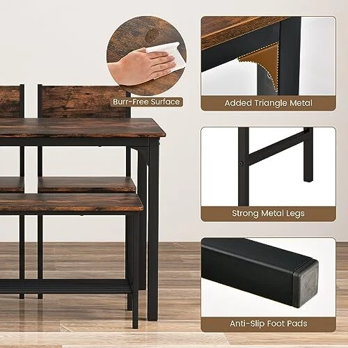 Return Policy Fast Delivery Trusted seller Dining Table Set for 4, Kitchen Table and 2 Chairs for 4 with Bench, 4 Piece Dining Table Set for Small Space, Apartment Product Description REINFORCED CONSTRUCTION: Crafted from solid metal and thick board, our table set boasts a heavy-duty metal frame capable of supporting up to 200 lbs for the table, 330 lbs for each chair, and 660 lbs for the bench. This industrial dining set ensures exceptional durability and sturdiness. PERFECTLY FOR SMALL SPACE: Chairs and bench are able to be stored underneath the dining table to save space while it is not in use. It is very easy to keep everything in order and tidy once owning this 4 piece dining set with bench at home, kitchen, living room and dining room. AMPLE STORAGE SPACE: The 4 Person Dining Table Set includes storage shelves on the benches to maximize space in your home. This feature allows you to store items that you need for regular meals, keeping them easily accessible. VERSATILE USAGE: Our 4-person dinette is versatile and ideal for various occasions, serving as a modern and stylish dining table in your home or can also function as a practical desk, catering to your everyday needs. EASY ASSEMBLY & MAINTENANCE: Assembly is a breeze with all parts included and detailed instructions provided. The smooth bottom feet prevent floor scratches, and the waterproof tabletop is easy to maintain by wiping clean with a damp towel. Shipping Returns Payment Shipping Shipping is FREE to all addresses other than APO/PO boxes in the lower 48 states. All our stock ships from US-based warehouses. Shipped via USPS or UPS (depending on location and package weight) Unless stated otherwise, all orders will ship within 24-72 hours of your payment being processed. Check our feedback to see the great reviews of FAST shipping we offer. Returns Seller does not accept returns Payment We currently accept payment via eBay managed payments only. Once payment is cleared, we will dispatch your shipment within 1-3 business days. Please refer to the "Shipping" tab for more information regarding shipping speed to your destination.
