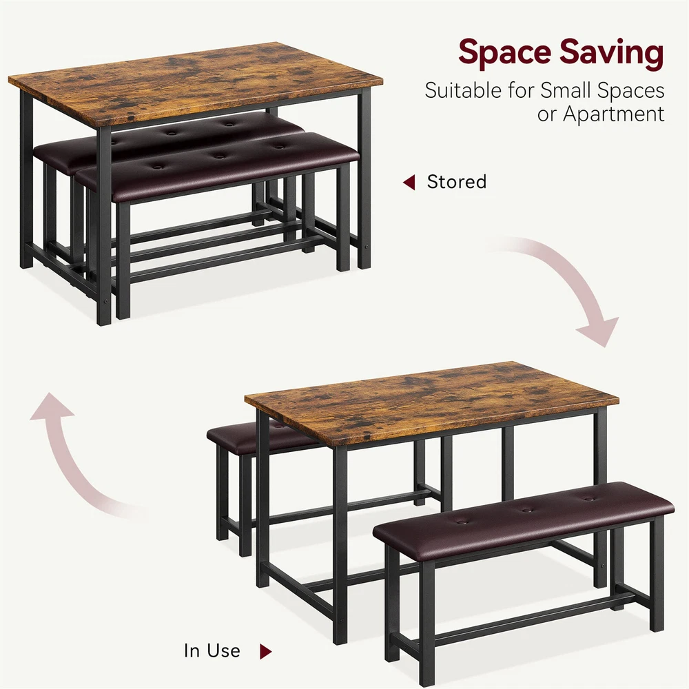 About this item COZY UPHOLSTERED BENCHES: This dining table set of 4 is made of premium MDF board and solid steel, which features a sturdy frame for a long lifespan. The use of metal pipes with a larger diameter makes the kitchen bench more stable and comfortable than other products. The Upgraded Dining Bench seats are padded with thick cushions, keeping you comfortable all dining time. More comfortable than a traditional wooden Bench. PREMIUM & STURDY CONSTRUCTION: This retro gray kitchen table set with a metal frame, which offers a longer service life and more excellent stability. With the premium thickening MDF Board top, the overall durability would be significantly increased. Protective steel plates have been added to the four corners of the desktop, making it more stable to use. The H-shaped frame of the base makes this kitchen bench and table more sturdy and durable. Bench load-bearing reaches 400 lbs. EASY TO MAINTAIN: The surface of the dining table set of 4 is a waterproof and anti-corrosive coating, you can easily wipe soup, sauce, and dust clean, and the surface will not be hurt, and is sturdy for long-term use. SPACE-SAVING DESIGN: 2 kitchen benches can be hidden under the kitchen table to save space and create a tidy atmosphere. It is an excellent solution for small spaces, such as condos, kitchens, studios, or apartments. EASY TO ASSEMBLE: All the assembly hardware and tools come with this dining table set. With illustrated instructions, this table and bench table dining set can be assembled within 40 min without effort. Dimensions: Table Size 44.49” L*27.59” W*29.59” H, Bench Size 38.59” L*10.69” W*18.59” H. Product Description Fancihabor Dining Table Set for 4, Kitchen Table with 2 Upholstered Benches, Rectangular Dining Room Table Set, 3 Piece Kitchen Table Set 1. A beautiful rustic kitchen table set for the living room, dining room, and kitchen, that will fit perfectly into a variety of décor styles.ral strength and durability. 2. A beautiful rustic kitchen table set for the living room, dining room, and kitchen, that will fit perfectly into a variety of décor styles. 3. Sturdy and Durable Frame: Constructed of high-grade MDF board and thickened steel frame and pipe wall, this small kitchen table with 2 benches is long-lasting and you can count on it to be a favorite for years to come. The seat panels of the chair can load over 400 lbs. Additional Steel Pipe, More Durable 2 Cozy Upholstered Seat Large Sturdy Tabletop Specification Color Retro Grey Weight 54.5 LBS Material Metal/MDF Board/Artificial Leather Dimensions Table Size 44.48” L*27.58” W*29.58” H, Bench Size 38.58” L*10.68” W*18.58” H. Max. Load Capacity Table 150 LBS / Bench 400 LBS Package Includes 1 x Dining Table, 2 x Benches, 1 x Instruction, 1 x Accessory Bag Payment Delivery details Terms of sales About us Contact us Payment We accept payment either via PayPal or any of the following credit cards; Visa, MasterCard, Discover, and American Express. Wishing you a happy life! Delivery details We will provide you with the tracking number on the same day or the next day, and transport your package through UPS, DHL, FedEx and other courier methods. If you have any questions, please feel free to contact me and I will do my best to help you solve the problem. Wishing you a happy life! Terms of sales We offer a one month free return and exchange service, and you don't have to bear any losses. We will provide multiple solutions for you to choose from. If you have any questions, please feel free to contact me and I will do my best to help you solve them. We offer a two-year warranty period. If you have any quality issues with the product you purchased within two years, please feel free to contact me. I will provide you with a free replacement service. If you have any questions, please feel free to contact me. I will do my best to help you solve the problem. Wishing you a happy life! About us We are committed to becoming the best eBay seller, with high-quality suppliers, providing the most sincere service, including pre-sales and after-sales service, to give you a satisfactory shopping experience. If you have any questions, please feel free to contact me, and I will do my best to help you solve the problem. Wishing you a happy life! Contact us If you encounter any problems, please contact me by email at the first time, I will provide you with a solution as fast as possible so that I can give you a satisfactory shopping experience, wish you a happy life! Brand Fancihabor Number of Items in Set 3 Set Includes Dining Table, Chairs Room Dining Room, Kitchen, Living Room Seating Capacity 4 Style Retro Item Weight 66.6 pounds Manufacturer Warranty 5 Years Item dimensions L x W x H 44.49 x 27.59 x 29.59 inches Material Engineered Wood Mounting Freestanding