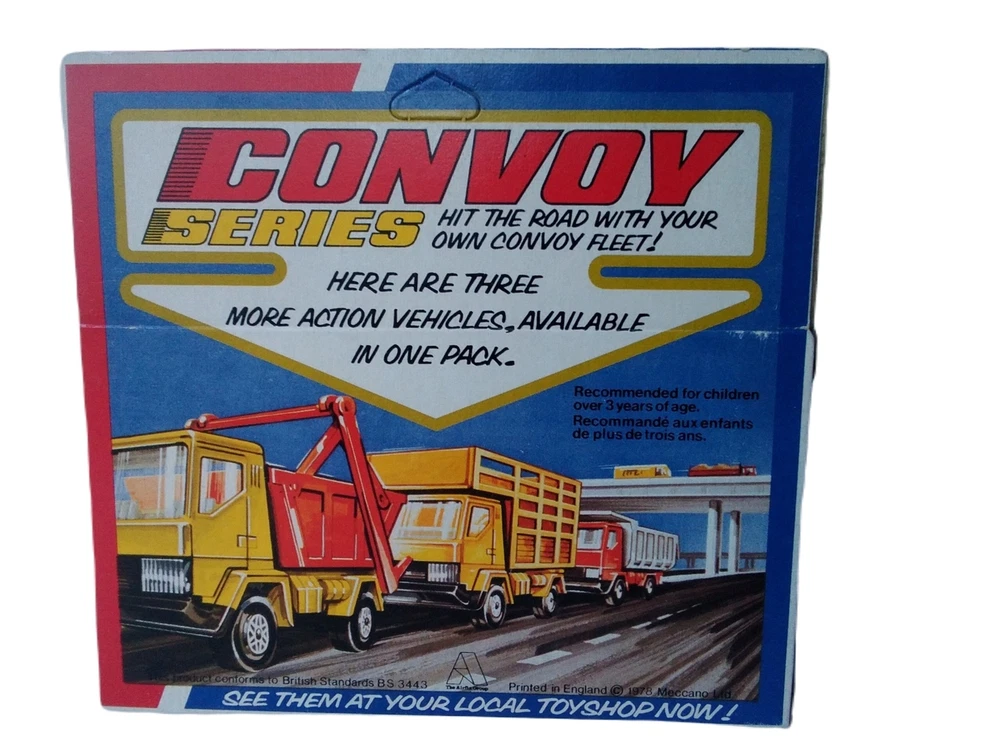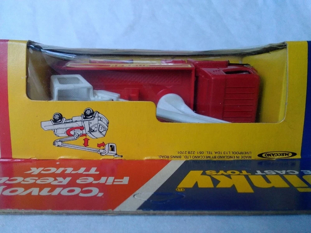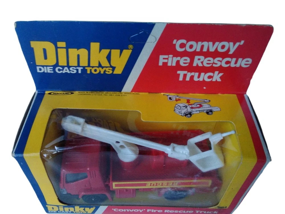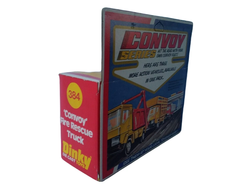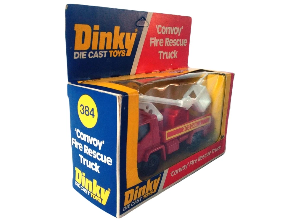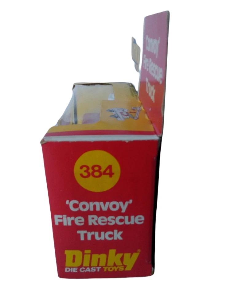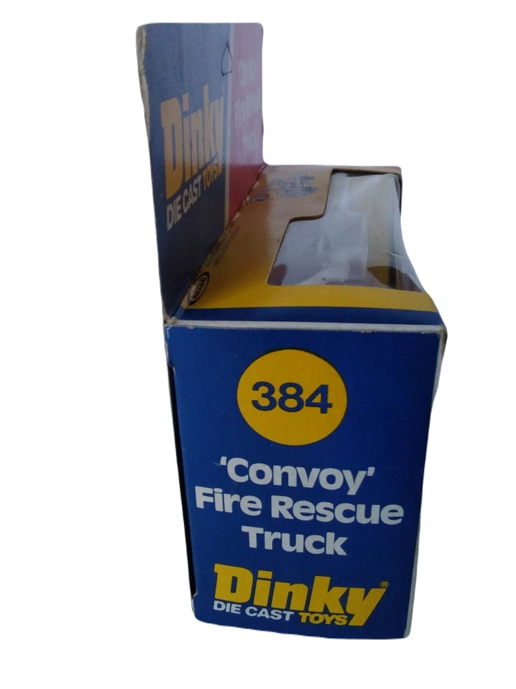 Dinky Convoy Fire Rescue Truck #384 Diecast Model Firetruck Vintage item circa 1970's Factory error - "Rescue" decal is upside down on side of truck Has extremely small amount of feathering/curling at corners and a few rough edges; slight scuffing and denting along with adhesive residue from price tag on plastic Overall great condition with solid box construction, unyellowed and unbroken plastic, bright and vibrant colors, clear and crisp graphics, and mint contents The error makes it a hard to find rarity Will make a great addition to your collection!