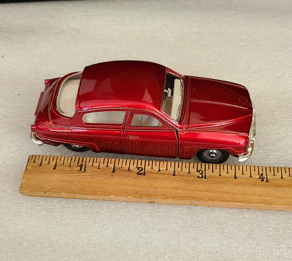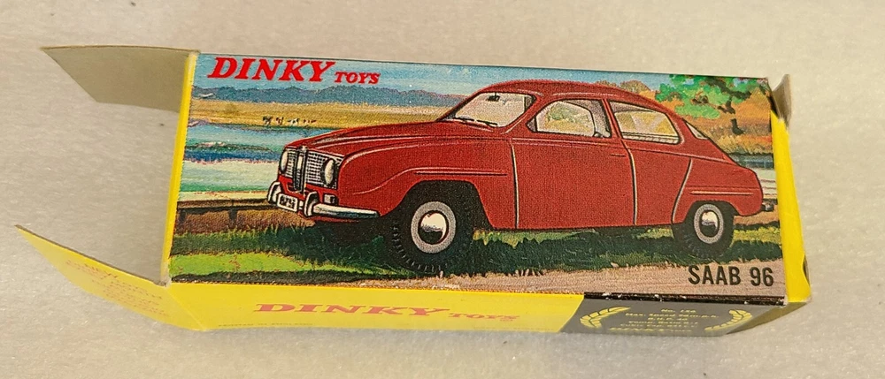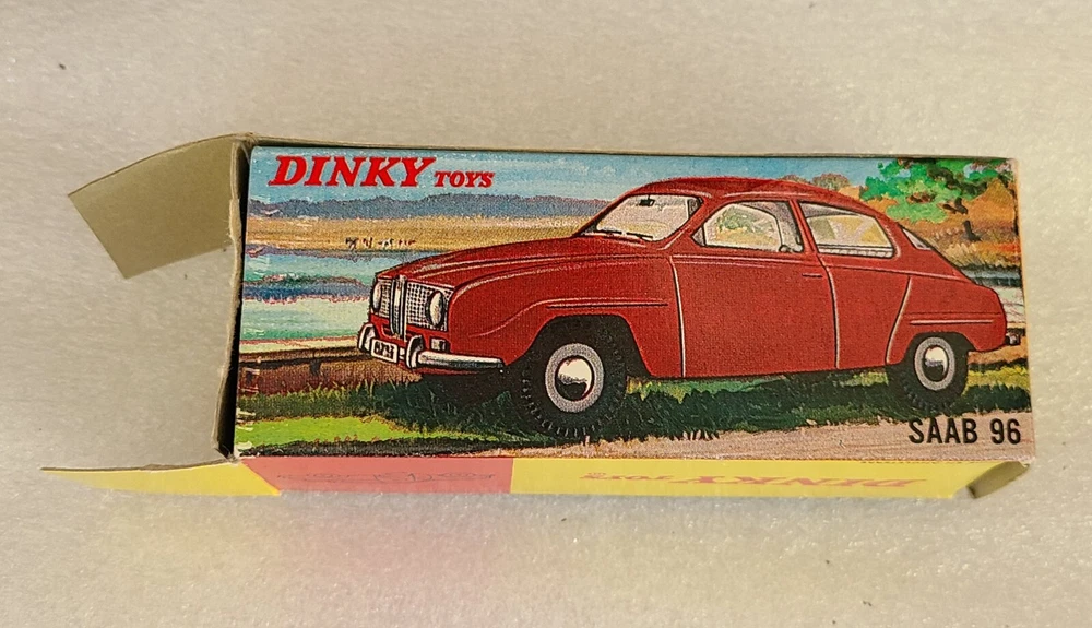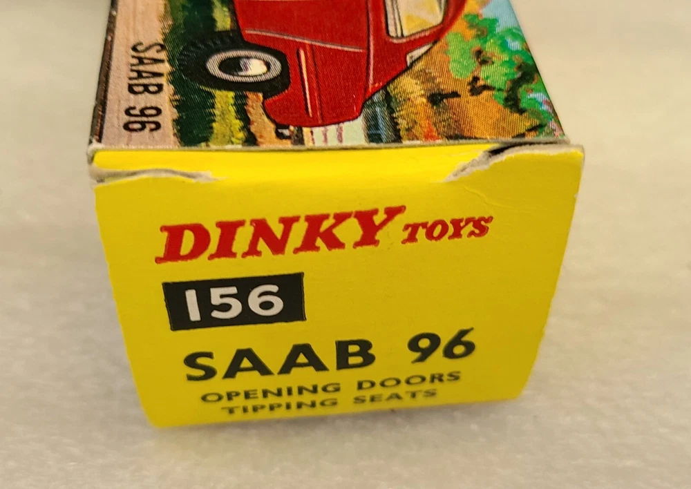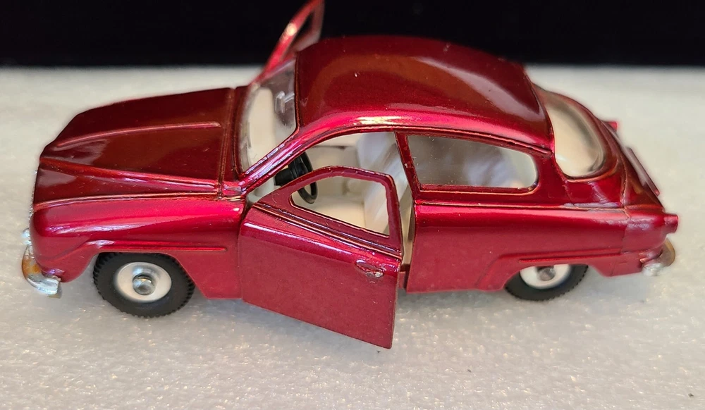 Dinky 95 Saab die cast car, No. I56, with opening front doors and tipping seats. Red paint in very good condition. Original box included.