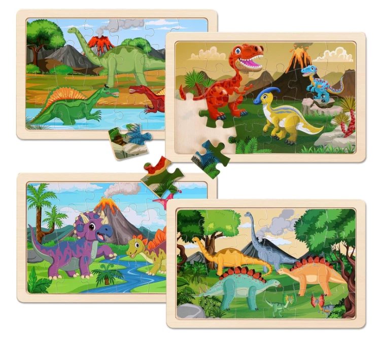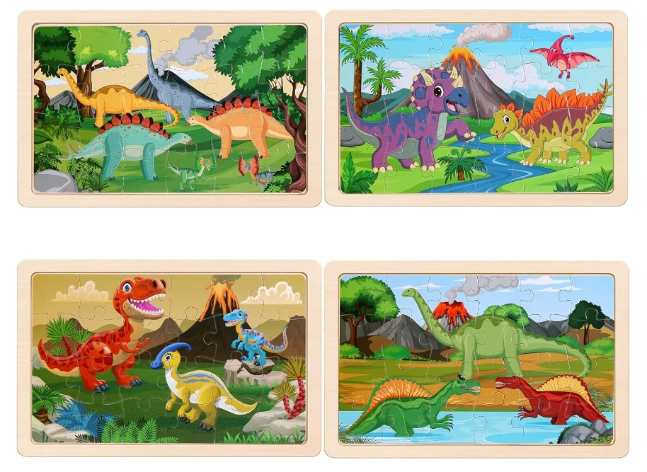 Dino Wooden Puzzles 4-Pack: 24-Piece Sets for Ages 3-6, Educational Toys