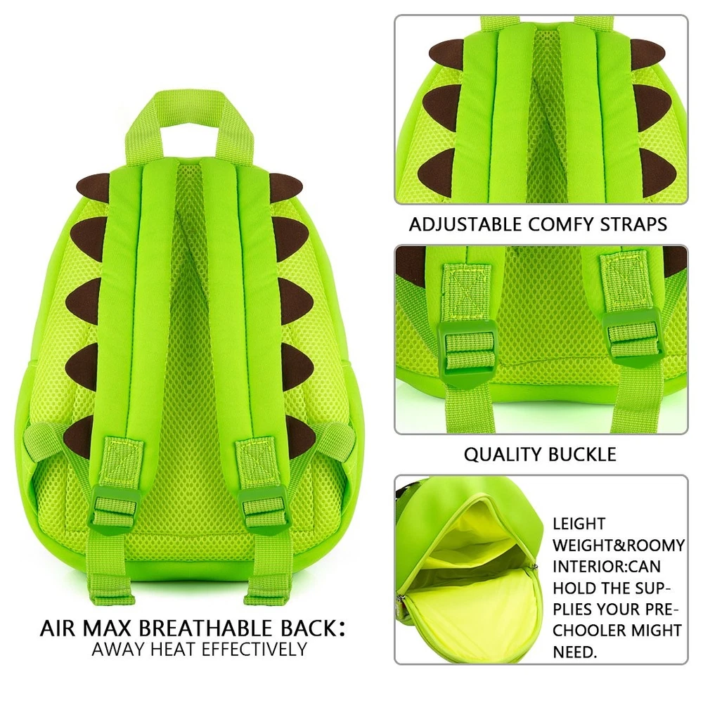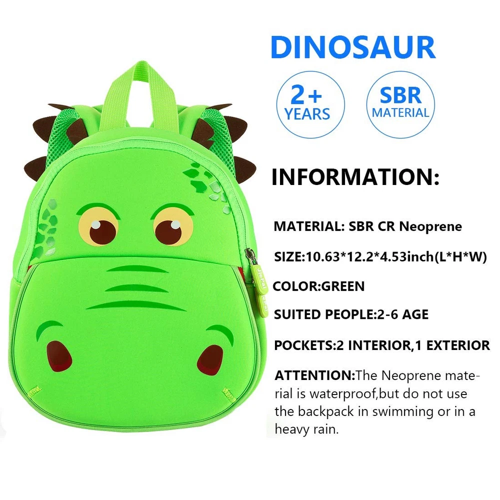 About : This dinosaur backpacks are the best backpacks for toddlers, super cute、creative and functional design.The best gift for toddlers. Features: *Material:waterproof neoprene,soft, durable, elastic, and lightweight. *Adjustable shoulder strap design,keep your safe,the padded straps are shock absorbing and improve comfort. *Open mouth design :The "mouth" of the dinosaur can open up to expose another pocket with zipper for extra storage. *Breathable Back Lining:The lining on the back is mesh so it will allow to circulate and help reduce sweat forming on their back if worn for extended periods. This area has some padding to prevent it digging into your little . *Roomy Main Compartment:The roomy main compartment holds sandwiches, snacks, drinks and more, to meet your preschoolers’ need for a busy day of 'work' and play. *Suit for: 4-6 years old children. *Usage: book bag,Lunch,schoo,travel,hiking,for girls,boys,kindergarten. Specification: Size:10.63*12.2*4.53inch/27x31x11.5cm(L*H*W) weight:380g/13.4OZ *Attention: It will be a little smelly at first use, just open and it. Package includes: 1 * Dinosaur Backpack CUTE,LIGHTWEIGHT AND LARGE CAPACITY -- This dinosaur cute backpack is great gift for ages 4-6 years boys and girls.Perfect for children preschool,travel,hiking and so on. HIGH QUALITY MATERIAL -- The dinosaur backpack made of Safety non-environmental neoprene which is waterproof and durable,held up in the wash and dried it if dirty or smelly. AJUSTABLE COMFY STRAPS -- Adjustable padded shoulder straps are shock absorbing and improve comfort.Smooth zipper and Sturdy top handle. WEIGHT AND SIZE -- Weight:380g/13.4oz.The backpack is light and your is easy to carry around.Size:10.63 x 12.2 x 4.53inch/27 x 31 x 11.5cm(L x W x H)Can't fit an A4 sized book.There is a roomy main compartment and front pockets in the backpack can the small toys,water bottle, diaper and other stuffs. Every little kid wants and need a cute dinosaur backpack, cool animal backpack,fun toys backpack.