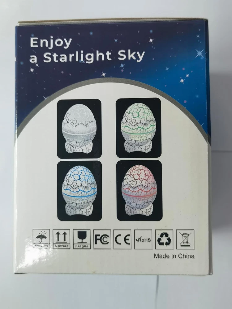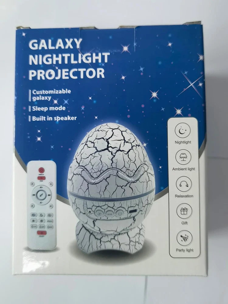✨【 Dinosaur Egg Night Light Projector】: The combination of nebula and starlights can turn on alone or in combination(up to 14 colors), and the projection of nebula flow creates a relaxing atmosphere, 4 speed and brightnesses. The high-definition starry galaxy can be projected onto the wall and ceiling, You will feel like you are travelling in the galaxy 📶【Bluetooth Music Speaker/Player With Dynamic Rhythm】: After Connected the device via Bluetooth to turn it into a music player, play your favorite music. The lights will flash and dance following the music rhythm. We can open a small music party with our kids 💤【Not only night light but also white noise machine】: The White Noise Machine is implanting with 19 music such as Forests, Birds, Bonfire, Train, Rain, Sea and so on. You can choose whichever one you like before your bedtime to help you fall alseep well in the beautiful starry sky ⏰【Timer Function & 2 Modes】: You can set up 1h, 2h & 4h timer via the remote or the buttons in the egg. Remote working range is within 5 meters. After enjoying starry lights, you can put on the shell onto the projector, it will be become a warm night light 💡【Ideal Gift & 100% satisfied After-Sell SERVICES】: Dinosaur Egg Galaxy Star Projector Starry Light is cute design as well as a great gift choice for holidays (Christmas, Valentine's Day, Children's Day, etc.) and birthdays. If you are not satisfied with our Galaxy Star Projector Starry Sky Night Light, any problems with the item, please feel free to contact us, we provide 180 days after sales service. Product Description Dinosaur Egg Galaxy Starry Sky Projector with Wireless Music Player 1 X Dinosaur Egg Galaxy Starry Sky Projector 1 X Remote control 1 X USB C cable 1 X User manual Dinosaur Egg Galaxy Star Projector Night Light The best gift and decoration for children's and adults' bedrooms Materials: ABS LED powder: 6W Power consumption: 7-10W Power supply: USB DC 5V, 2000mA Projection coverage: 20-80sq.m Applied environment: Indoor application Working temperature: -10℃ to 45℃ Night light Wireless music player White noise Fog Timer Remote control Dinosaur Egg Night Light Projector it is powered only via USB DC 5V. With the remote control, you have your hands free to turn the projector on and off. This way we can have more fun with our children and family. Wireless music player We can connect our phone or music player to the light projector via Bluetooth. It becomes a loudspeaker and the light will flash and dance with your music rhythm. White Noise Machine The starry sky projector is implanted with 19 music like forests, birds, campfire, train, rain, sea and so on Timer function You can set the 1-hour, 2-hour and 4-hour timer using the remote control or the buttons on the star projector. Setting the brightness You can adjust the brightness of the star projector with the remote control, with settings of 30%, 50% and 100% brightness 14 light colours set in the Galaxy Star Projector There are green, blue, purple, red, yellow, orange and other colours set. Choose one as your favourite while playing games, having party or sleeping