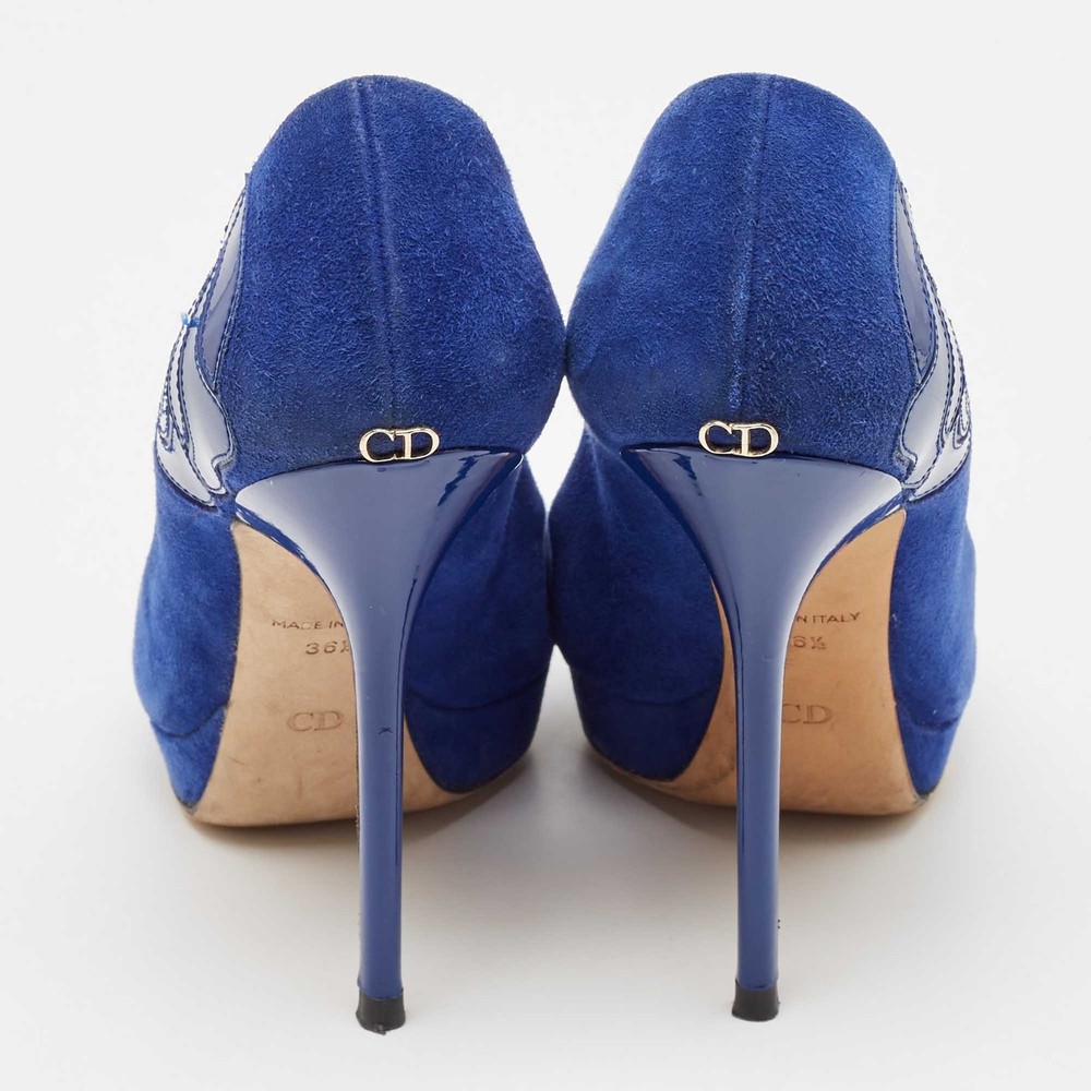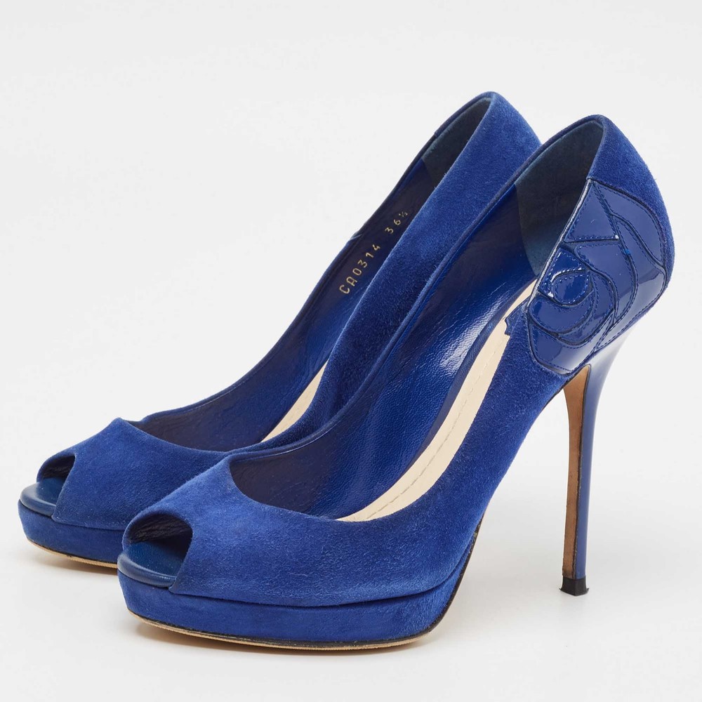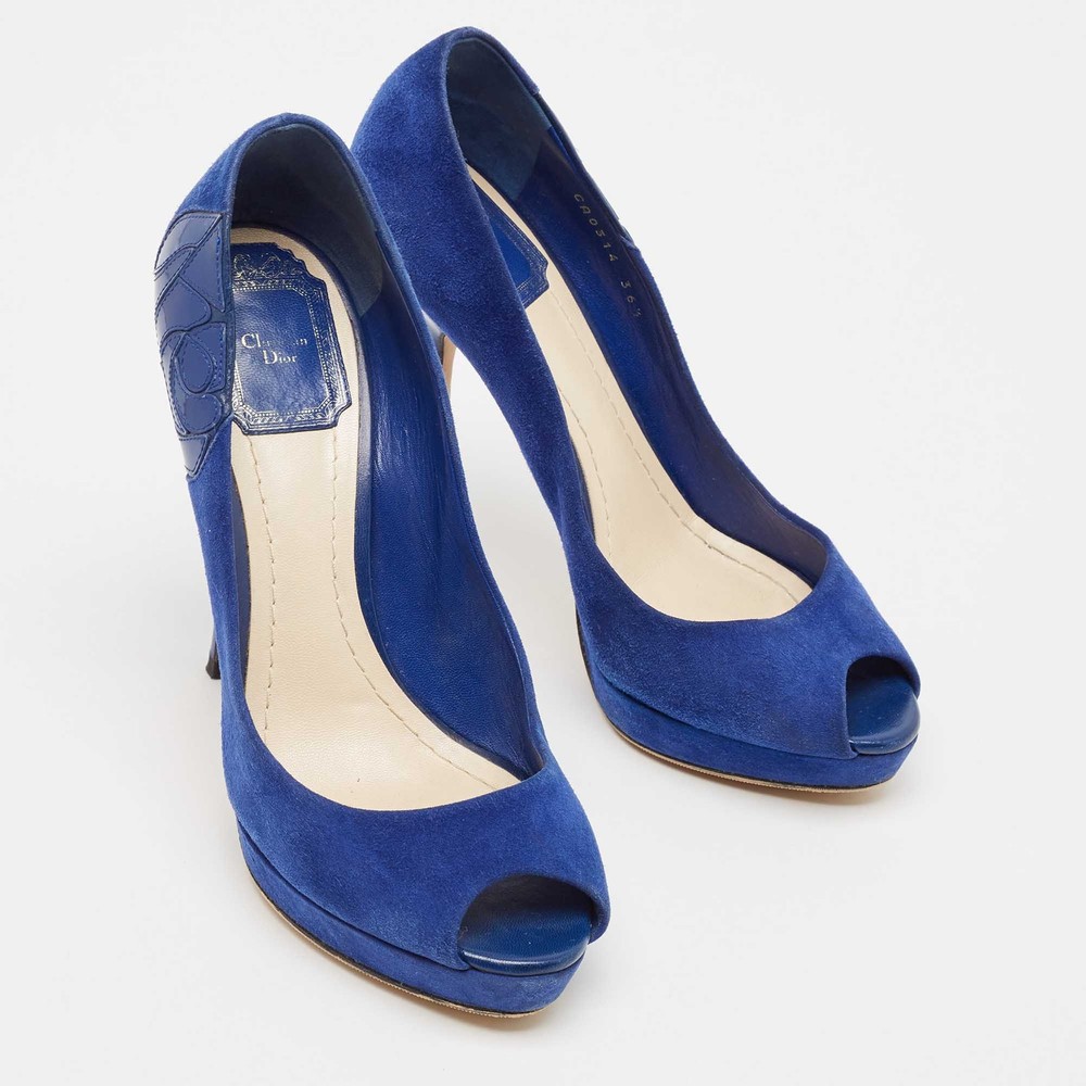 Experience the epitome of elegance with these blue suede peep toe pumps by a renowned French fashion house. Meticulously crafted in Italy, they feature a luxurious suede exterior and a soft leather lining that promises comfort with every step. The smooth leather insole ensures a plush experience, while the slip on design offers effortless sophistication. Perfect for elevating any ensemble, these pumps are a timeless addition to any discerning wardrobe.Certified by The Luxury Closet - This item has gone through a detailed authentication process overseen by our experts. We offer a lifetime guarantee of authenticity on all our items. Import duties, taxes and charges are not included in the item price. These charges are the buyers responsibility. Please check with your country’s customs office to determine what these additional cost will be prior to buying. Our eBay Store About Us Contact Us Add to Favorite Sellers Dior Blue Suede Miss Dior Peep Toe Pumps Size 36.5 $151.8 Experience the epitome of elegance with these blue suede peep toe pumps by a renowned French fashion house. Meticulously crafted in Italy, they feature a luxurious suede exterior and a soft leather lining that promises comfort with every step. The smooth leather insole ensures a plush experience, while the slip on design offers effortless sophistication. Perfect for elevating any ensemble, these pumps are a timeless addition to any discerning wardrobe. Product Details Brand Color Blue Dimensions Material Suede Size 36.5 Outsole Width 8 cm Outsole Length 23 cm Heel Height 13.5 cm Includes The Luxury Closet Packaging Certified by The Luxury Closet This item has gone through a detailed authentication process overseen by our experts. We offer a lifetime guarantee of authenticity on all our items. How We Check The in-house team of experts at The Luxury Closet is highly trained to verify the authenticity and the condition of the luxury products. They ensure that only 100% authentic items are put on sale.The evaluation process is unique with its own mix of assessment criteria and differs according to the category. Each item is evaluated based on the following combination of hallmarks, hardware, stitching, symmetry, material, craftsmanship, stamping, codes, hologram stickers, and packaging. Our authenticators also check if the items have been modified or amended (e.g., aftermarket diamonds, replaced batteries, repaired bags, etc.) International Buyers Import duties, taxes and charges are not included in the item price. These charges are the buyers responsibility. Please check with your country’s customs office to determine what these additional cost will be prior to buying.