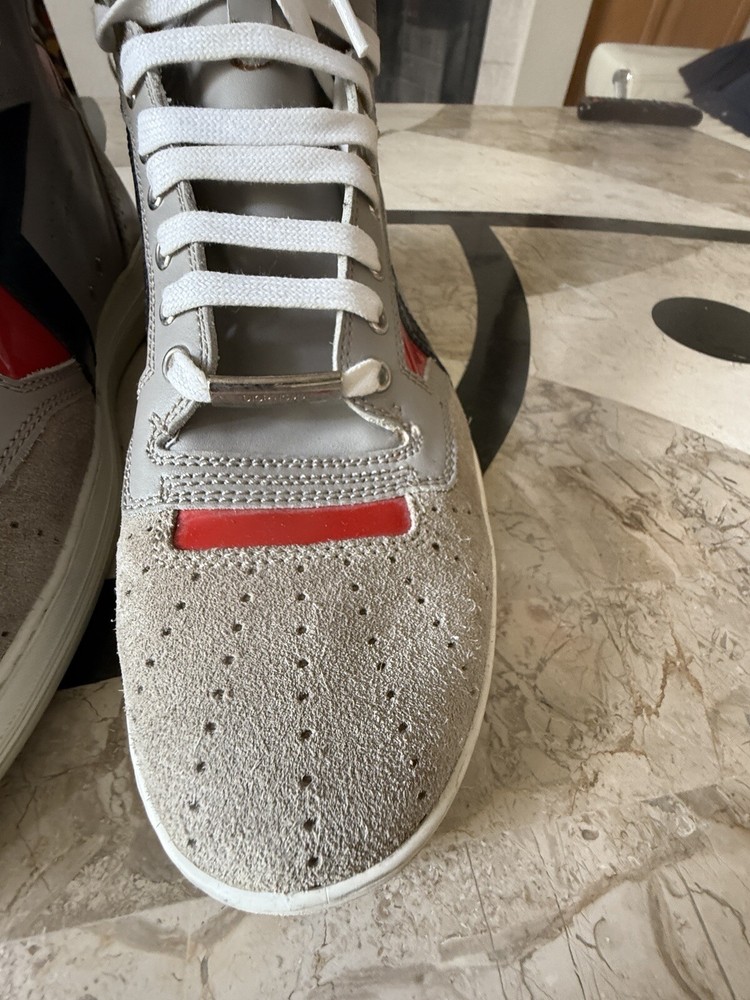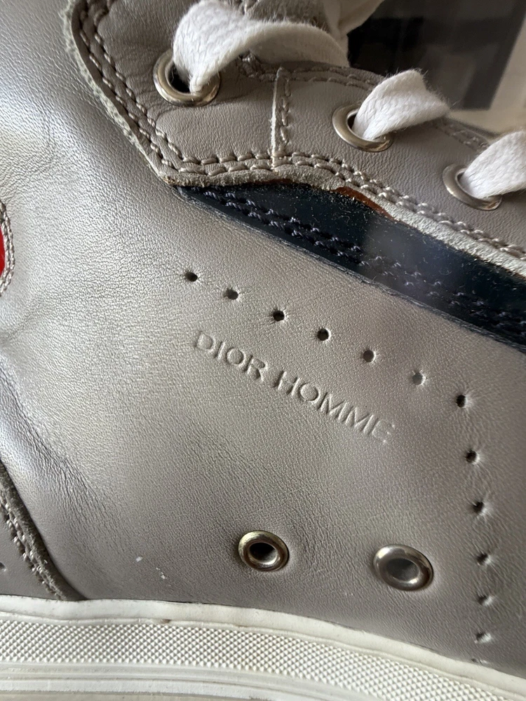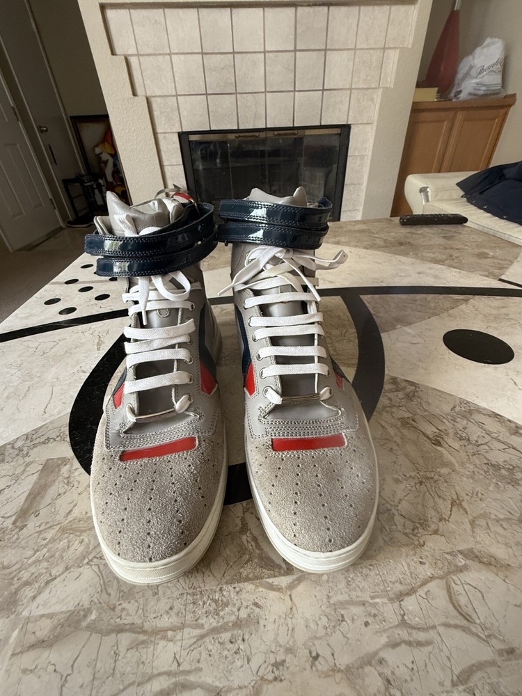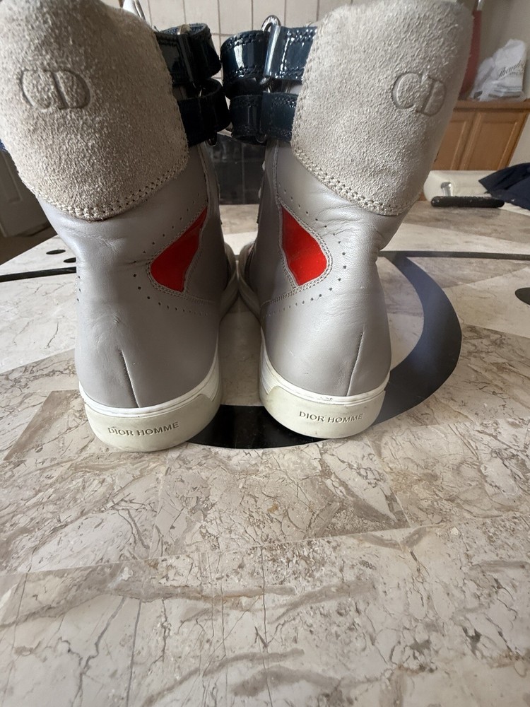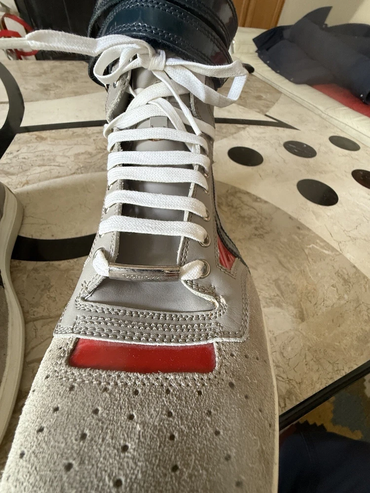 These are high-top sneakers by Christian Dior in gray leather suede. They feature a lace-up closure and a comfortable leather lining. The shoes are in size 45 (equivalent to US 12) and were made in Italy. The design is casual and stylish, suitable for everyday wear. some scuffs on leather and sole , minor dusting on rubber bottom. Velcro straps at top of shoes. please see pics, Free shipping to the US