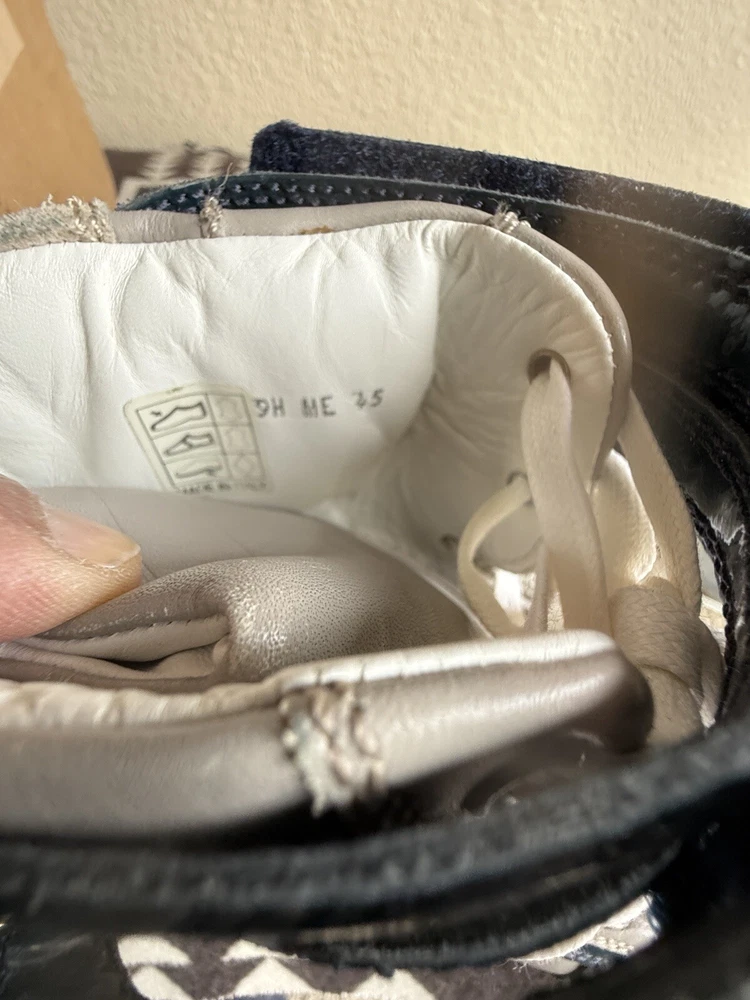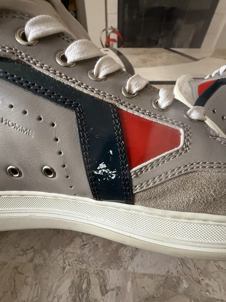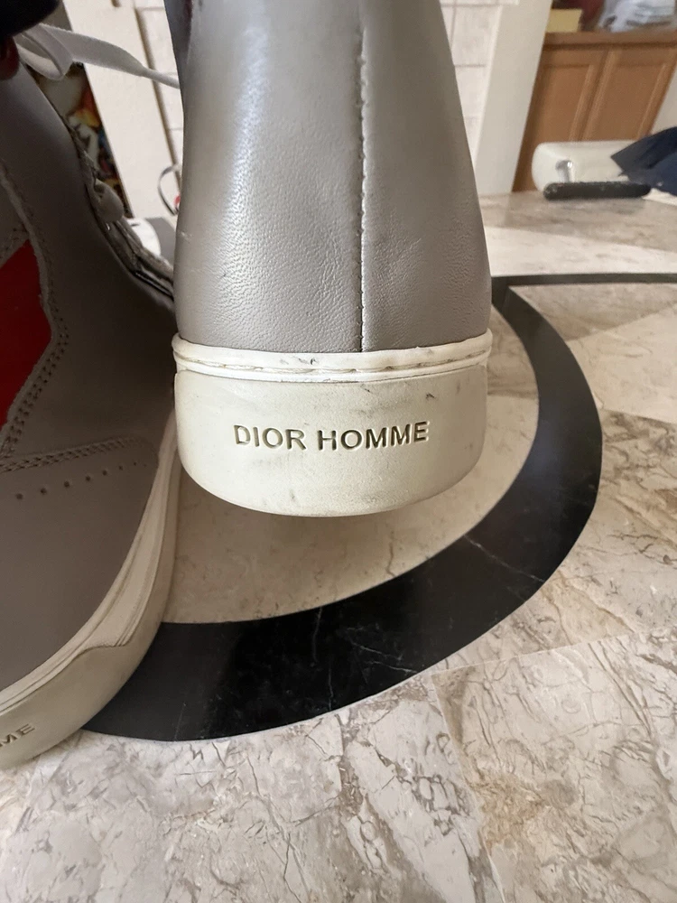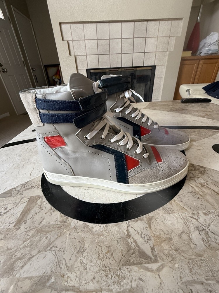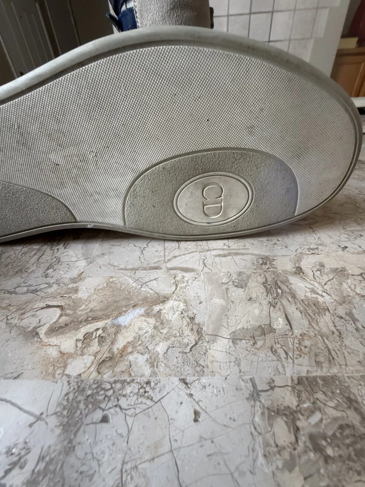 These are high-top sneakers by Christian Dior in gray leather suede. They feature a lace-up closure and a comfortable leather lining. The shoes are in size 45 (equivalent to US 12) and were made in Italy. The design is casual and stylish, suitable for everyday wear. some scuffs on leather and sole , minor dusting on rubber bottom. Velcro straps at top of shoes. please see pics, Free shipping to the US