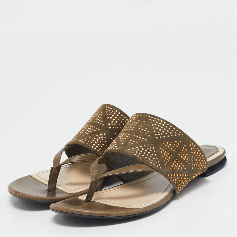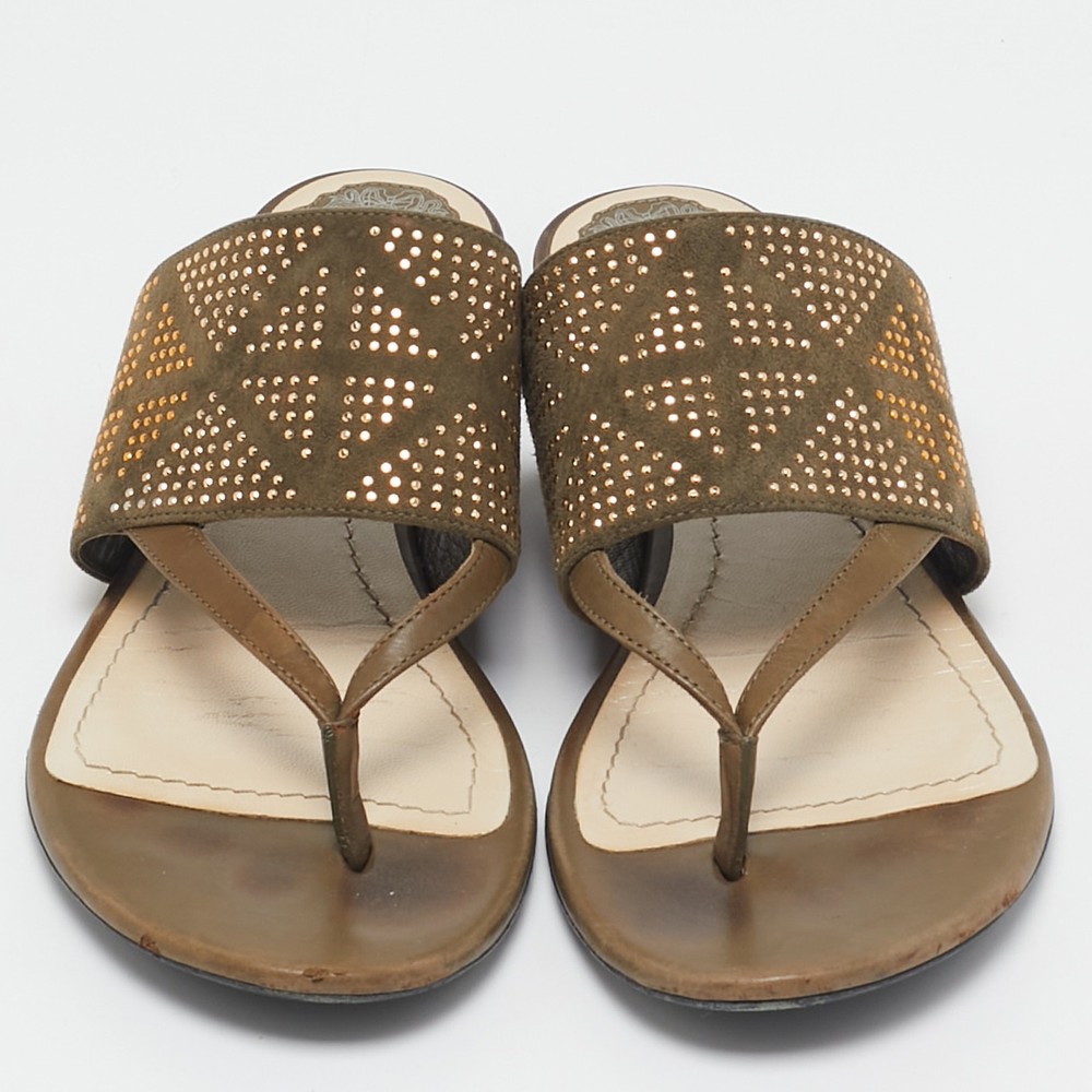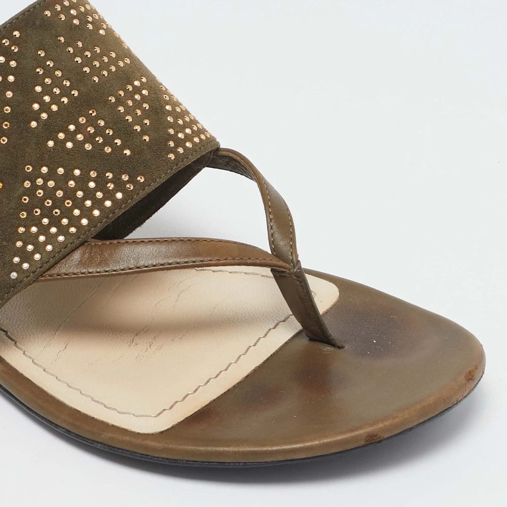 Discover elegance and comfort in these Dior green slip on sandals. Crafted in Italy, they seamlessly blend luxe leather and soft suede for a sophisticated experience.Certified by The Luxury Closet - This item has gone through a detailed authentication process overseen by our experts. We offer a lifetime guarantee of authenticity on all our items. Import duties, taxes and charges are not included in the item price. These charges are the buyers responsibility. Please check with your country’s customs office to determine what these additional cost will be prior to buying. Our eBay Store About Us Contact Us Add to Favorite Sellers Dior Green Leather and Suede Embellished Flat Sandals Size 39 $162.8 Discover elegance and comfort in these Dior green slip on sandals. Crafted in Italy, they seamlessly blend luxe leather and soft suede for a sophisticated experience. Product Details Brand Color Green Dimensions Material Leather, Suede Size 39 Outsole Width 9.5 cm Outsole Length 25.5 cm Heel Height Includes The Luxury Closet Packaging Certified by The Luxury Closet This item has gone through a detailed authentication process overseen by our experts. We offer a lifetime guarantee of authenticity on all our items. How We Check The in-house team of experts at The Luxury Closet is highly trained to verify the authenticity and the condition of the luxury products. They ensure that only 100% authentic items are put on sale.The evaluation process is unique with its own mix of assessment criteria and differs according to the category. Each item is evaluated based on the following combination of hallmarks, hardware, stitching, symmetry, material, craftsmanship, stamping, codes, hologram stickers, and packaging. Our authenticators also check if the items have been modified or amended (e.g., aftermarket diamonds, replaced batteries, repaired bags, etc.) International Buyers Import duties, taxes and charges are not included in the item price. These charges are the buyers responsibility. Please check with your country’s customs office to determine what these additional cost will be prior to buying.