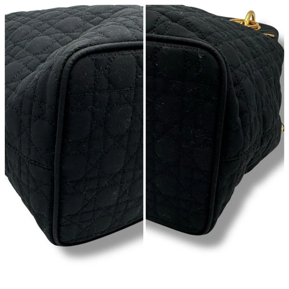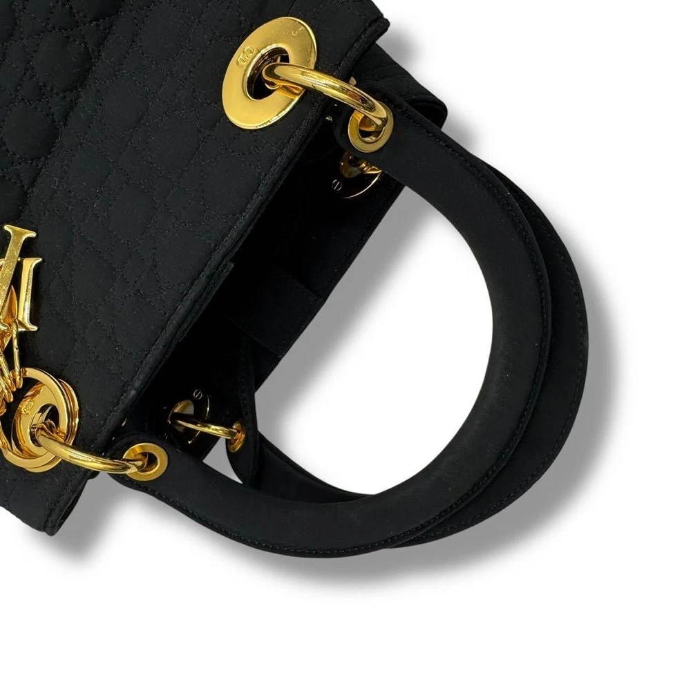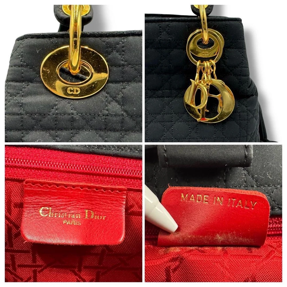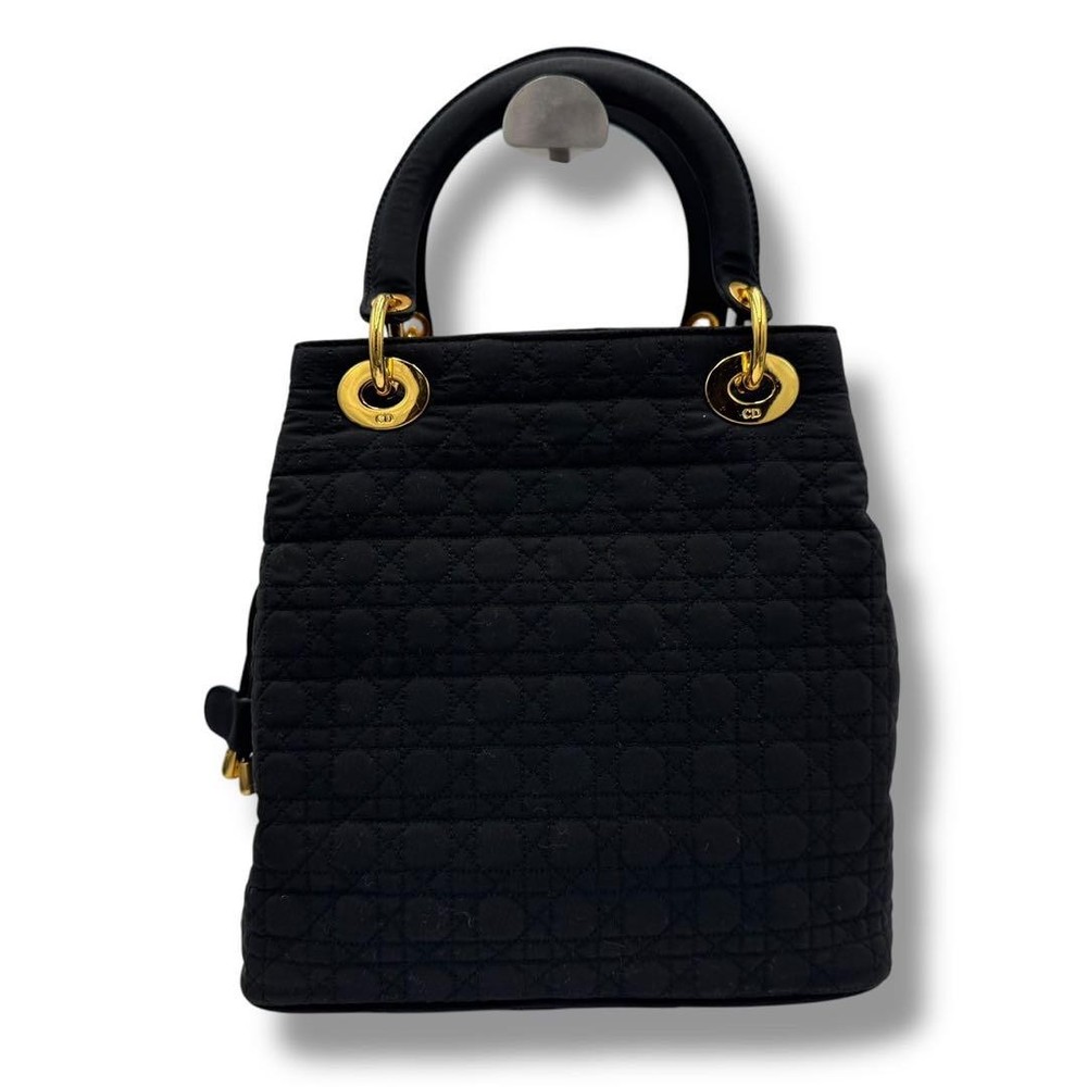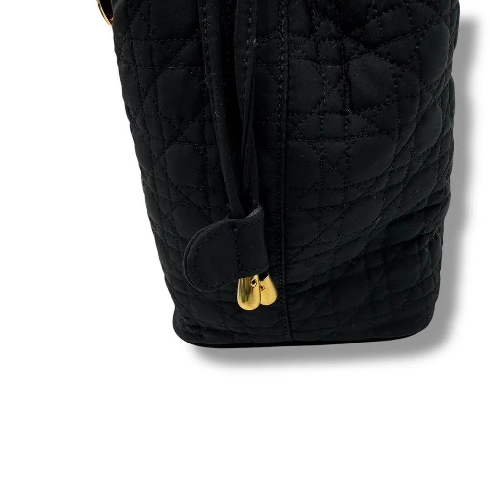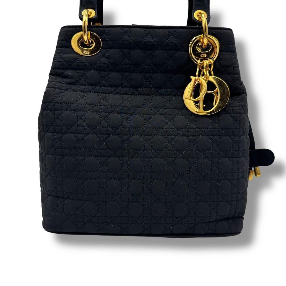 Christian Dior vintage Lady Dior handbag with DIOR logo charm, made in Italy, black quilting canage. This is a rare type that can be tightened like a drawstring at the top. There is some feeling of use as it is a vintage item, but there is no noticeable damage and the condition is good. Size: Approximately 9.84 inches wide x 9.45 inches tall x 5.12 inches deep. Handle: Approximately 11.81 inches. Color: Black. Accessories: None. Material: Nylon. I promise fast shipping via FedEx or DHL as soon as possible! Import duties, taxes and charges are not included in the item price or shipping charges. These charges are the buyer’s responsibility. These charges are normally collected by the delivering freight (shipping) company or when you pick the item up - do not confuse them for additional shipping charges.
