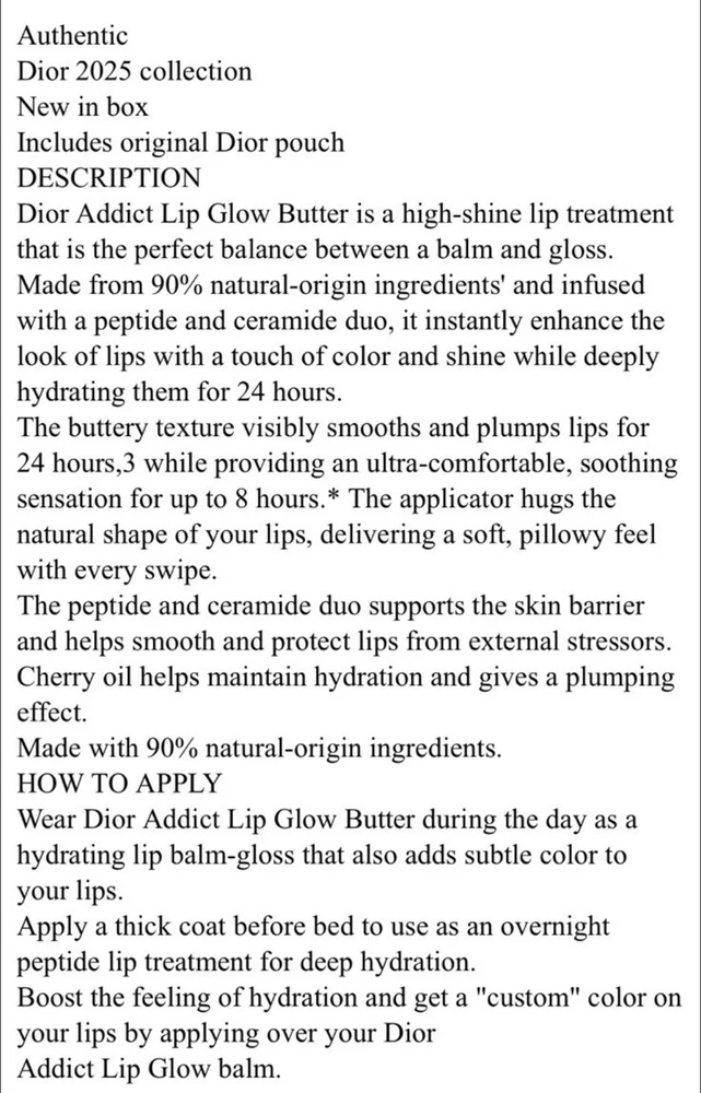 Authentic Dior 2025 collection New in box Includes original Dior pouch DESCRIPTION Dior Addict Lip Glow Butter is a high-shine lip treatment that is the perfect balance between a balm and gloss. Made from 90% natural-origin ingredients' and infused with a peptide and ceramide duo, it instantly enhance the look of lips with a touch of color and shine while deeply hydrating them for 24 hours. The buttery texture visibly smooths and plumps lips for 24 hours,3 while providing an ultra-comfortable, soothing sensation for up to 8 hours. * The applicator hugs the natural shape of your lips, delivering a soft, pillowy feel with every swipe. The peptide and ceramide duo supports the skin barrier and helps smooth and protect lips from external stressors. Cherry oil helps maintain hydration and gives a plumping effect. Made with 90% natural-origin ingredients. HOW TO APPLY Wear Dior Addict Lip Glow Butter during the day as a hydrating lip balm-gloss that also adds subtle color to your lips. Apply a thick coat before bed to use as an overnight peptide lip treatment for deep hydration. Boost the feeling of hydration and get a "custom" color on your lips by applying over your Dior Addict Lip Glow balm.