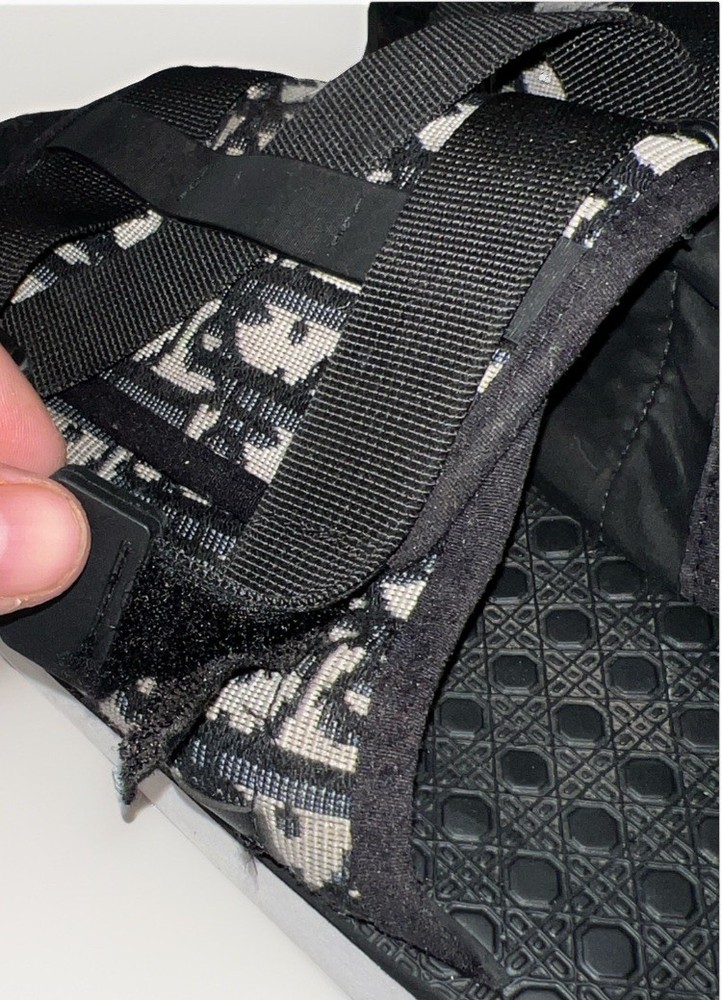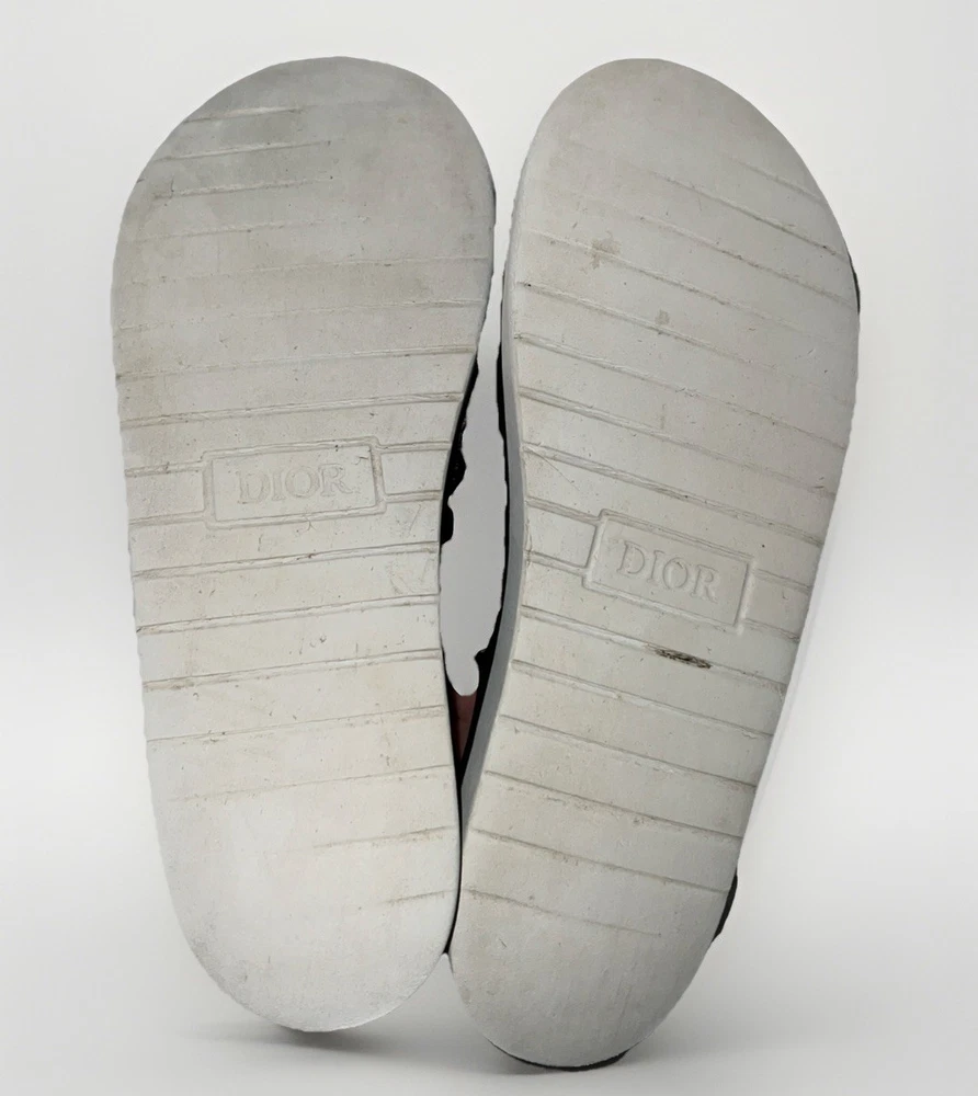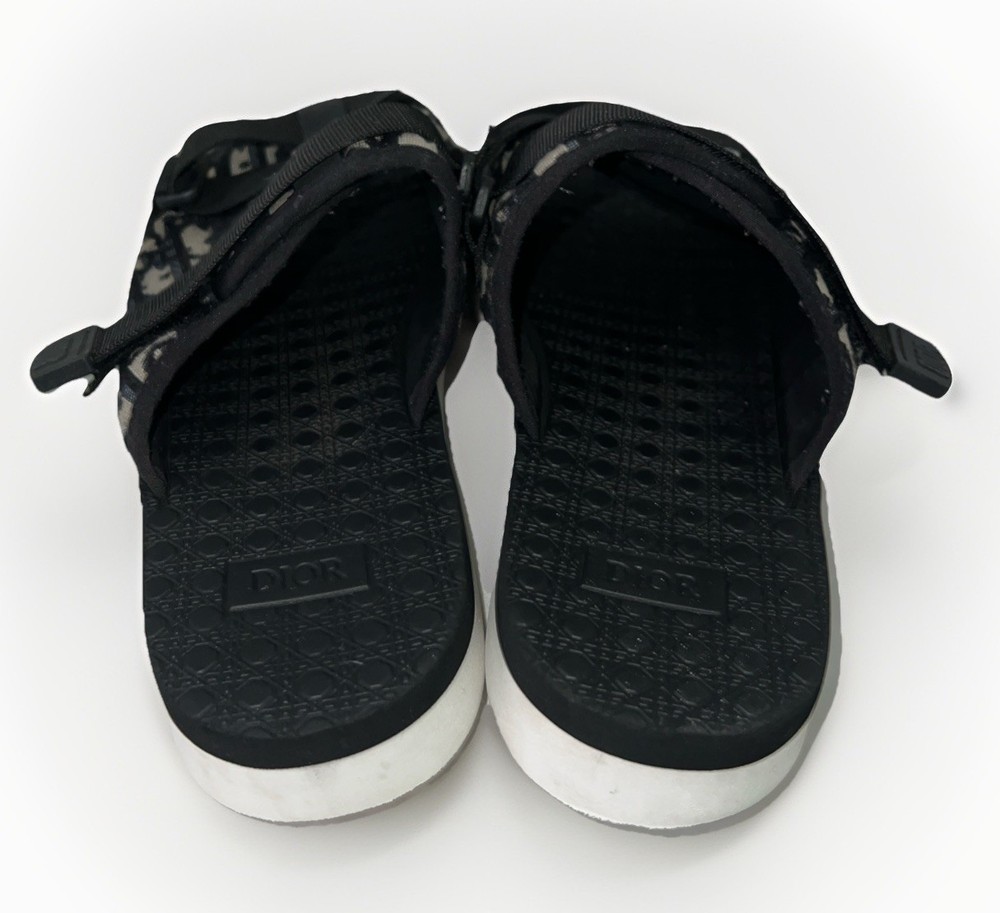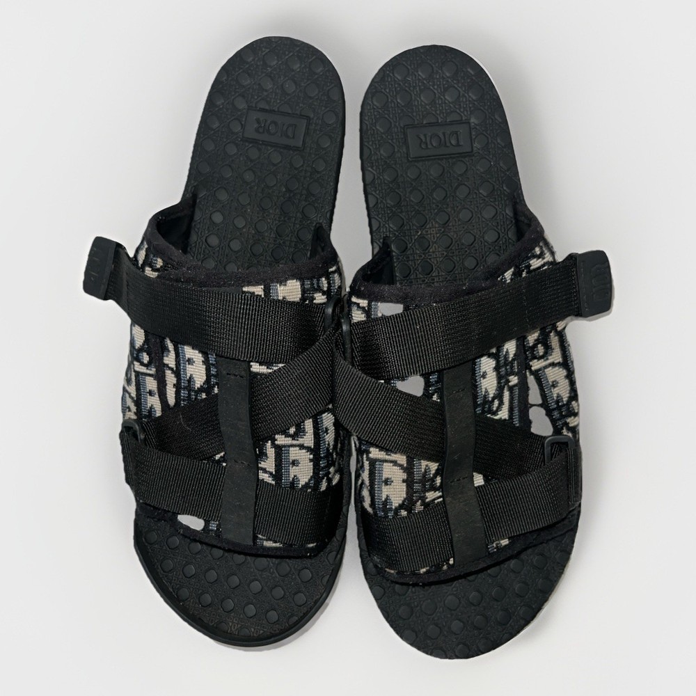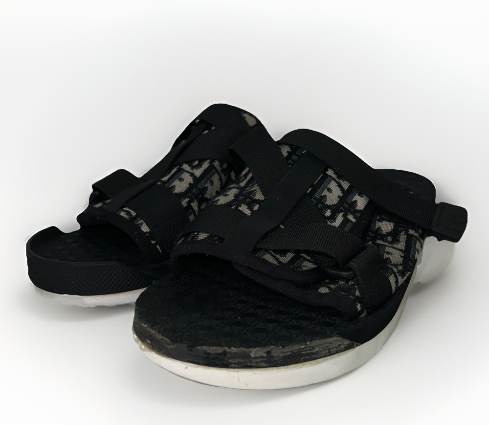 See photos for signs of wear! The Dior Men Alpha Sandal in Beige and Black is a stylish and versatile slide featuring the iconic Oblique Jacquard Logo. This size 9/42 sandal is perfect for casual and business occasions, with a comfortable and adjustable buckle closure. The outsole is made of cotton with a cushioned and slip-resistant design, making it suitable for year-round wear. The black color and lace accents add a touch of sophistication to this Christian Dior creation, crafted in Italy with high-quality materials. Perfect for any fashion-forward man looking to make a statement.