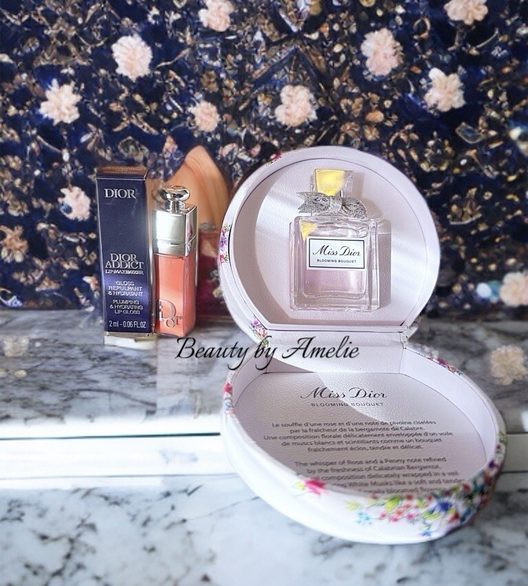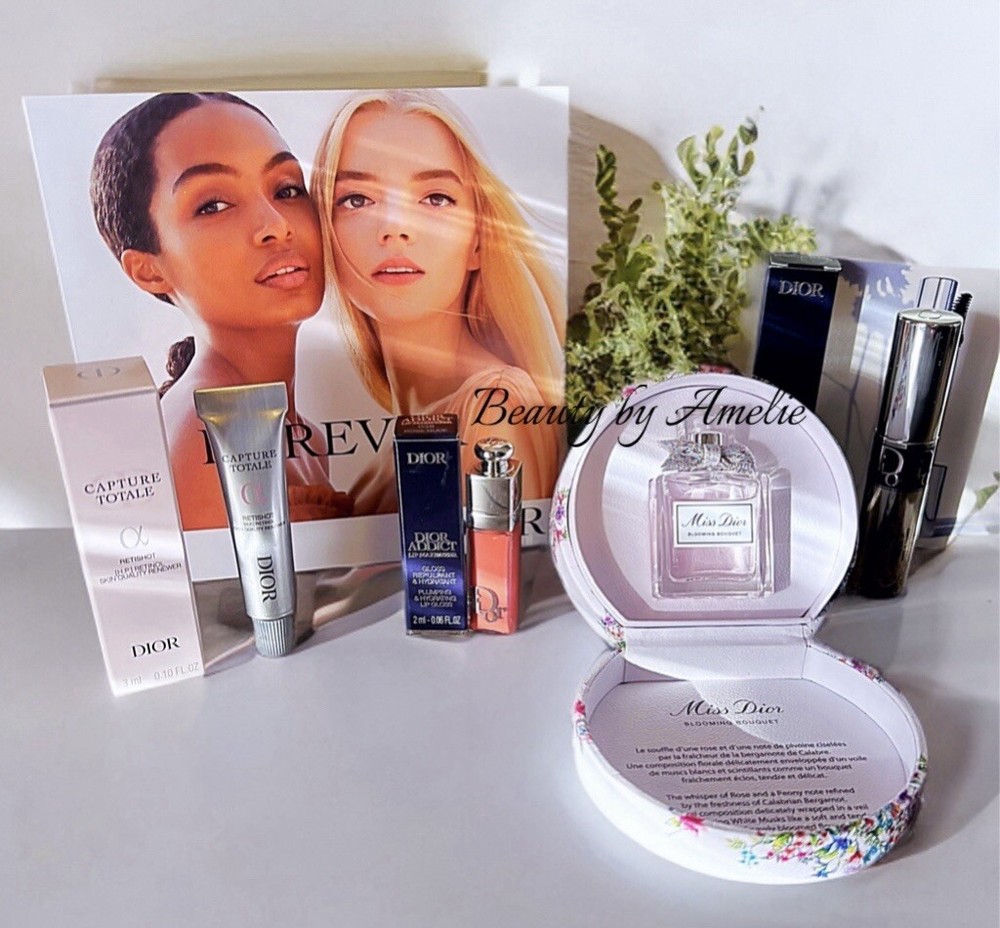 Dior Cosmetics Gift Set Dior Christian Dior Case & Beauty Travel Lip Gloss NEW travel sizes Dior lip, maximizer Gloss in rose nude (travel size) Blooming bouquet EDT Sample foundation Dior mascara Retishot