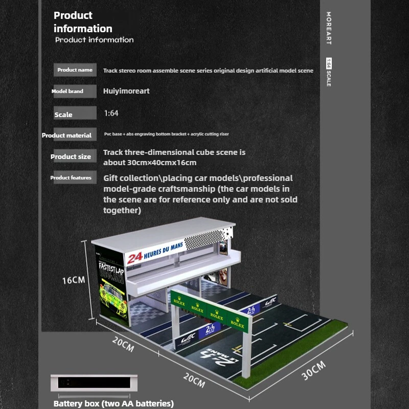 Product Description Note: This product is a battery box, the product does not contain batteries, buyers need to prepare two AA batteries. ** Vehicle and figure models are not included, pictures are for reference only***. We highly recommend this product for use with our other Diorama Scene Model products. It can also be used with vehicle models and figure models. Playability is very high. We look forward to your combinations and uses! We have shown some combination results in the product images for reference~. Product Specifications: Fully handmade, the production process is time-consuming [Except vehicles and dolls in the picture]. Material: PVC base + ABS bottom bracket + acrylic cutting riser Model Condition: Brand New Size: As shown in the picture Attention You need to assemble it by yourself. This product can be assembled in minutes without glue or scissors. Package Includes 1 Set of Scene Models On Nov 22, 2024 at 06:01:10 PST, seller added the following information: