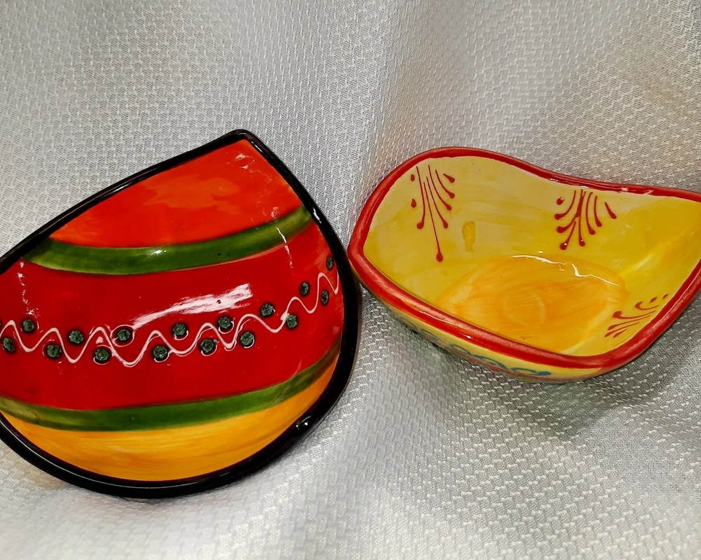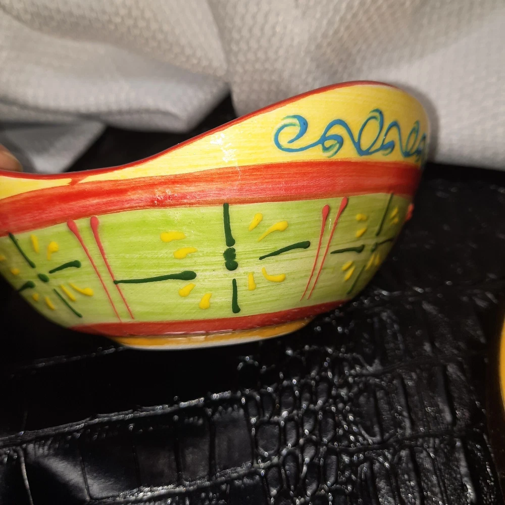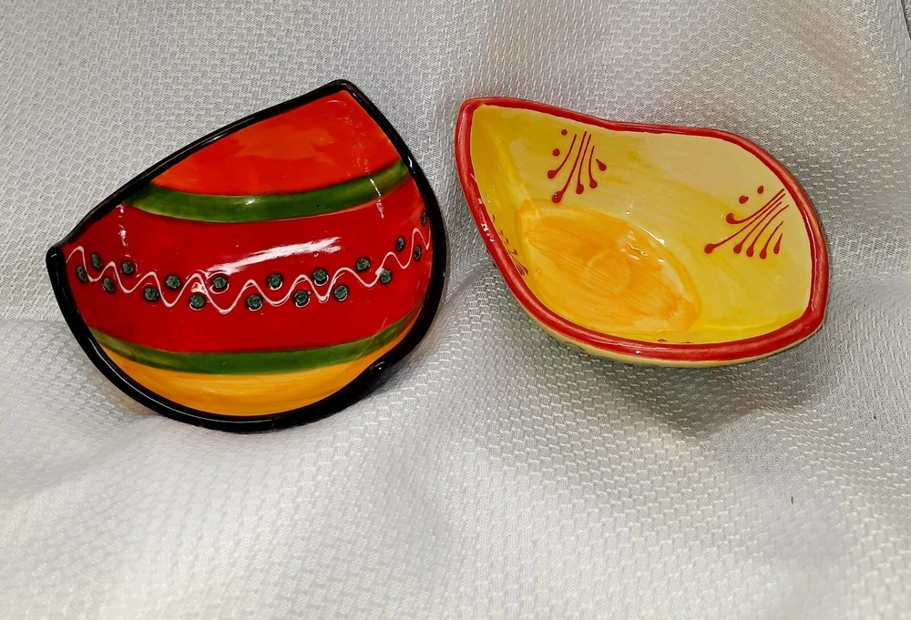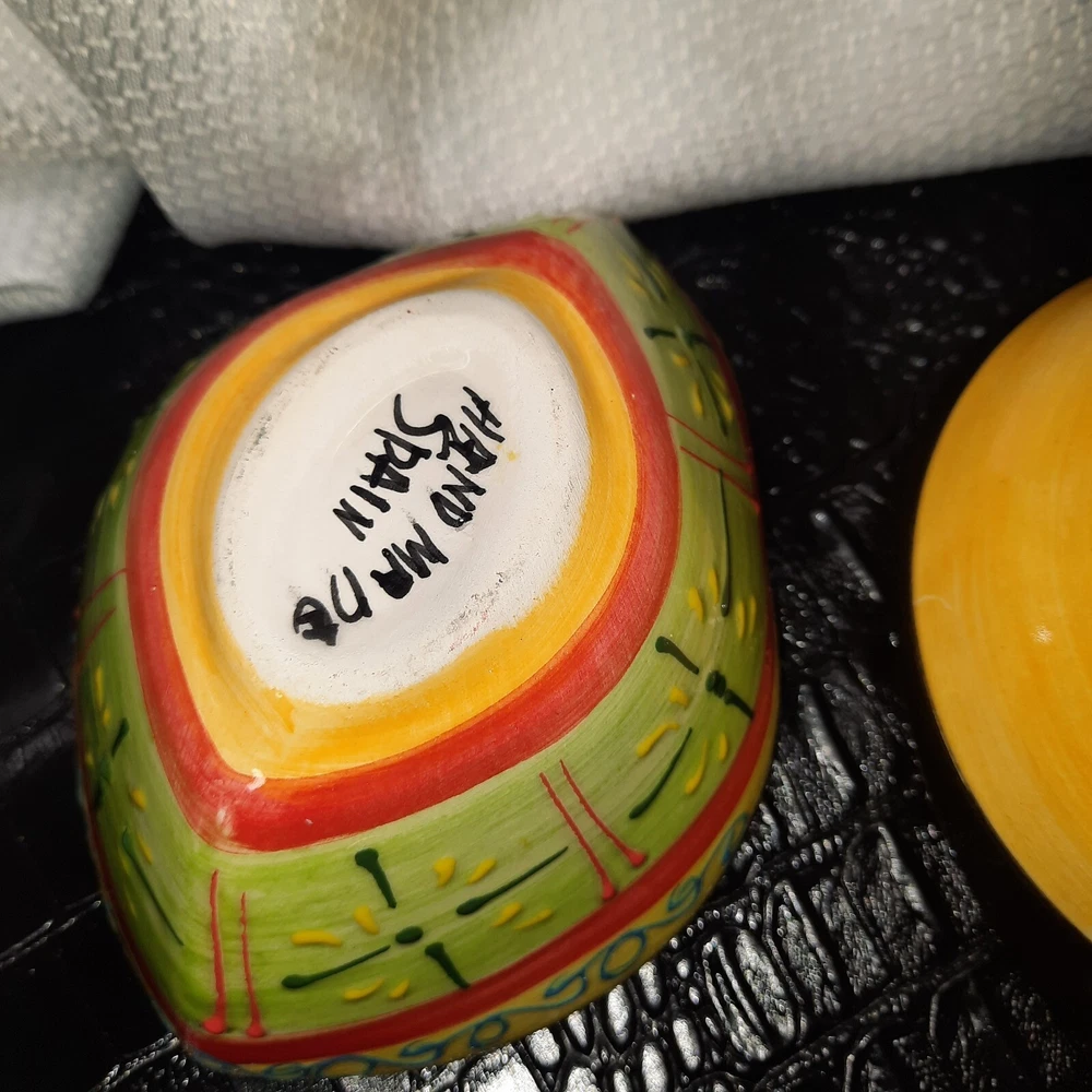 Item Height:2 inMaterial:CeramicBrand:Delrio SaldagoNumber of Items in Set:Two-PieceType:Dipping BowlsCountry/Region of Manufacture:SpainColor:MulticolorItem Weight:1lbTheme:Food/KitchenOriginal/Reproduction:OriginalPattern:festiveOccasion:All OccasionsShape:GeometricStyle:Art DecoDepartment:AdultsFinish:Shiny