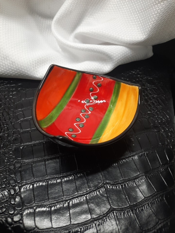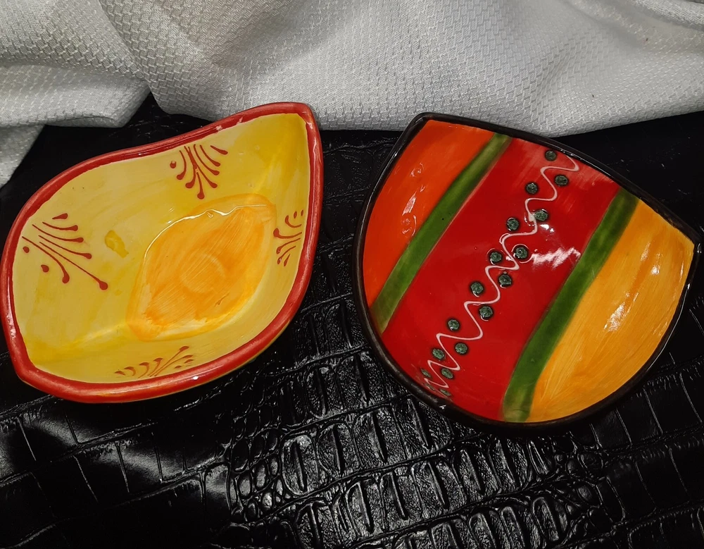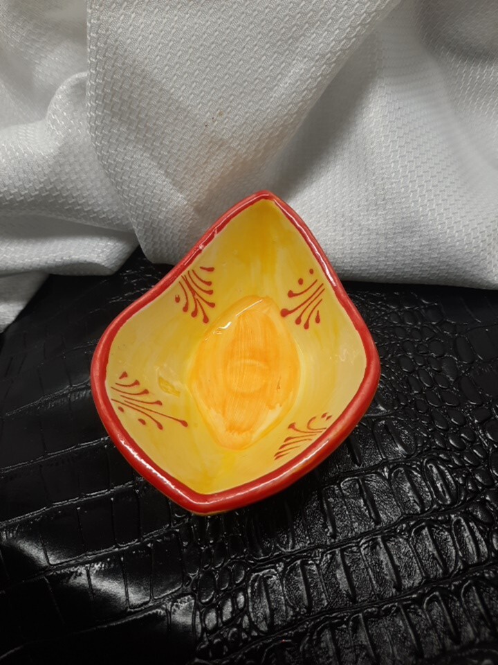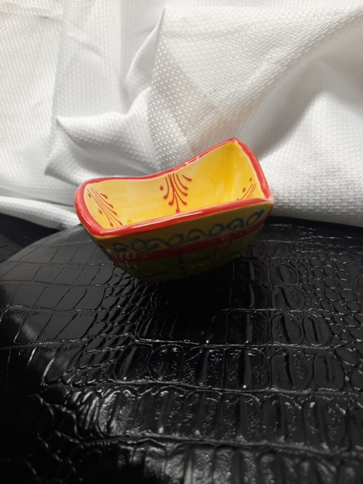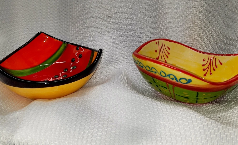 Item Height:2 inMaterial:CeramicBrand:Delrio SaldagoNumber of Items in Set:Two-PieceType:Dipping BowlsCountry/Region of Manufacture:SpainColor:MulticolorItem Weight:1lbTheme:Food/KitchenOriginal/Reproduction:OriginalPattern:festiveOccasion:All OccasionsShape:GeometricStyle:Art DecoDepartment:AdultsFinish:Shiny