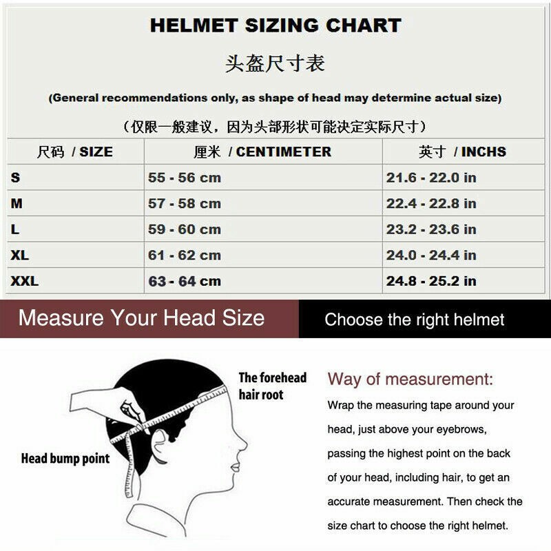 Lightweight advanced ABS shell Lightweight, durable thermoplastic shell Air intake and exhaust scoops for controlled air flow DOT approved Removable sun visor HELMET SIZING CHART (General recommendations only, as shape of head may determine actual size) SIZE CENTIMETER INCHES S 55 - 56 cm 21.6 - 22.0 in M 57 - 58 cm 22.4 - 22.8 in L 59 - 60 cm 23.2 - 23.6 in XL 61 - 62 cm 24.0 - 24.4 in XXL 63 - 64 cm 24.8 - 25.2 in
