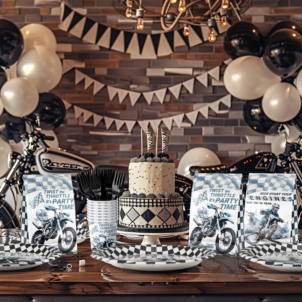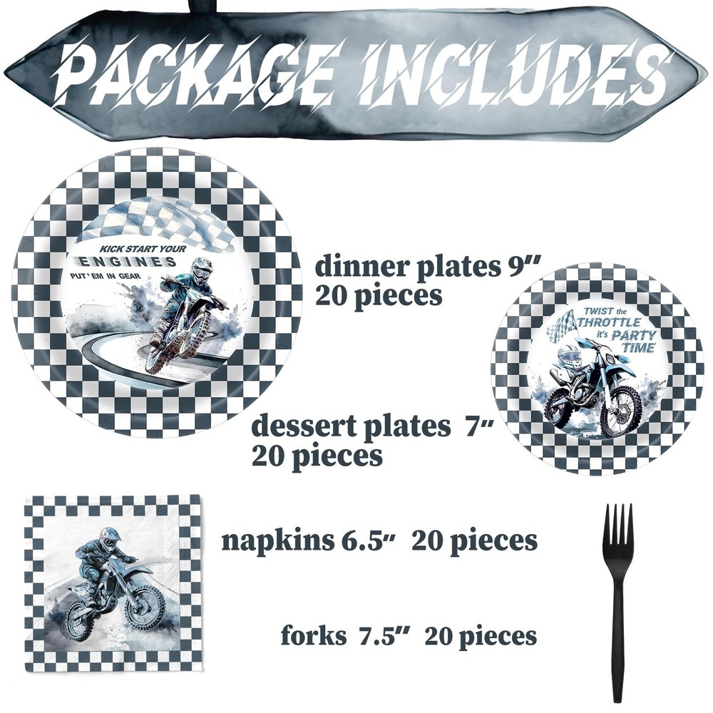 Dirt Bike Party Plates and Napkins - Dirt Bike Party Decorations - Dirt Bike Party Tableware - Dirt Bike Party Favors - Dirt Bike Party Supplies Serves 20 Guests Comprehensive Dirt Bike Tableware Set: Our Dirt Bike party decorations package includes everything you need to serve 20 guests. It features 20 dirt bike party paper dinner plates (9''), 20 dessert plates (7''), 20 cool dirt bike-themed napkins (6.5''), and 20 sets of sturdy plastic forks. This complete party kit ensures a seamless and exciting dining experience. Premium Quality Assurance: Crafted from high-quality paper, our dirt bike decor plates and napkins are not only visually striking but also non-toxic, odorless, and incredibly durable. The vibrant dirt bike patterns and colors are fade-resistant, creating an energetic and adventurous atmosphere for your event. Exciting Dirt Bike Decor: Bring the thrill of motocross to your party with dynamic dirt bike-themed decorations. Each item is designed to capture the fast-paced spirit of motocross, adding energy and excitement to your celebration. Kids and adults alike will be captivated by the bold dirt bike graphics, filling your event with fun and anticipation. Effortless Enjoyment: Hosting a memorable dirt bike-themed party has never been easier. Our thoughtfully arranged party set allows you to focus on celebrating with friends and family, as post-party cleanup is quick and hassle-free. Enjoy every moment without the worry of extensive cleanup afterward. Versatile Event Appeal: Whether it's a birthday, motocross-themed gathering, or any other special occasion, our dirt bike-themed party supplies are versatile and perfect for a range of events. Give your guests an unforgettable experience with this lively dirt bike party ensemble, making your celebration a standout event.