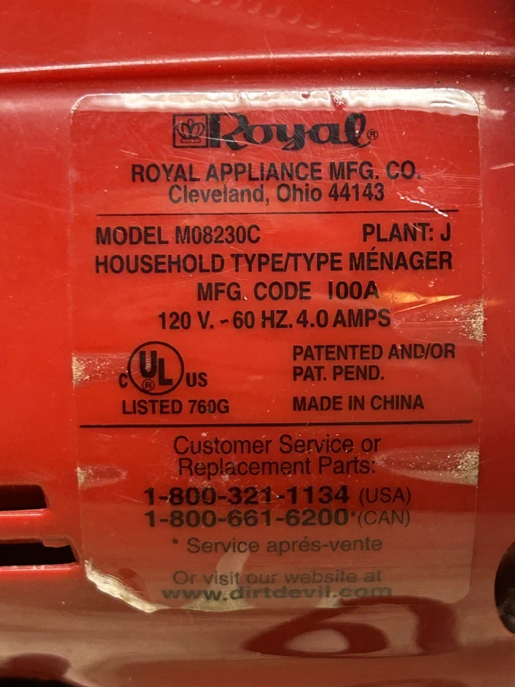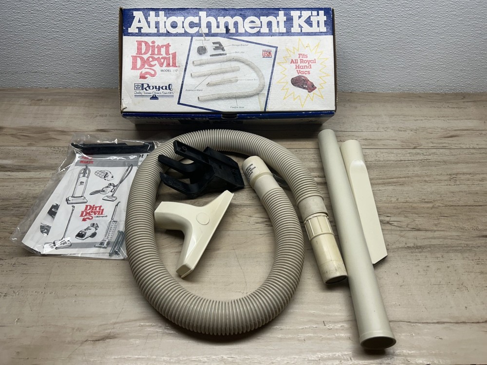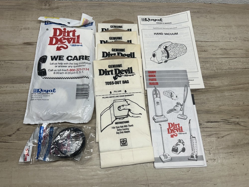 Dirt Devil Royal Ultra Portable Corded Bagged Hand Vacuum W/ Accessories M08230C.Fully tested and everything works great.It comes with attachment kit,extra belt and 7 extra bags.All items have normal signs of age and use-PLEASE see all pictures for details.No cracks,no chips,no broken or missing parts