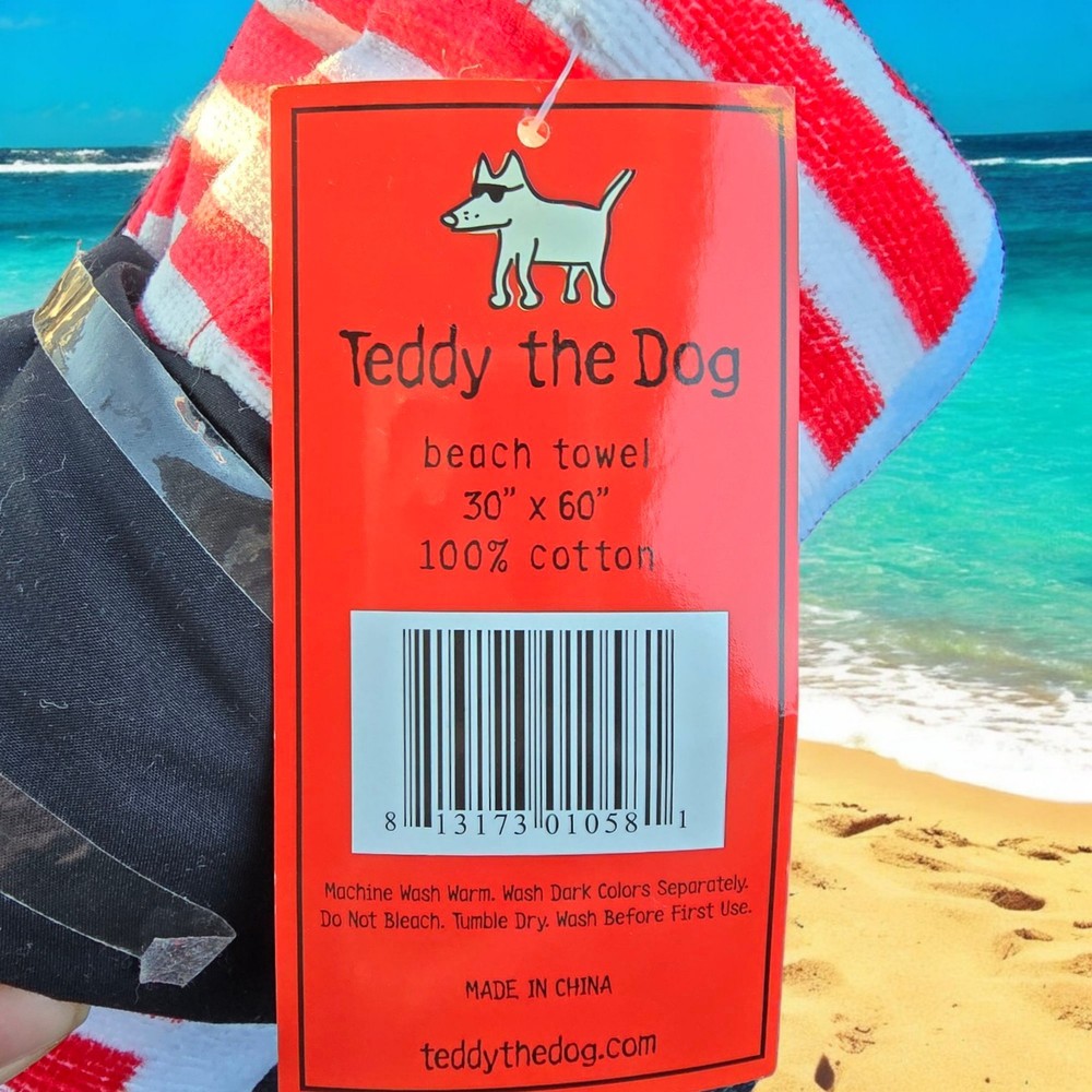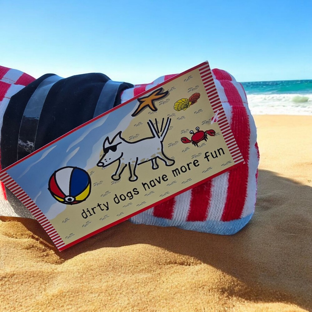 This is a Teddy the Dog beach towel, measuring 30 inches by 60 inches in size. It features a colorful design with the theme of "Dirty Dogs Have More Fun." Made from 100% cotton, this towel is suitable for adults and can be used in various rooms such as the bathroom, porch, lounge, or patio. Perfect for beach days or lounging by the pool, this towel adds a fun and playful touch to your indoor or outdoor space.
