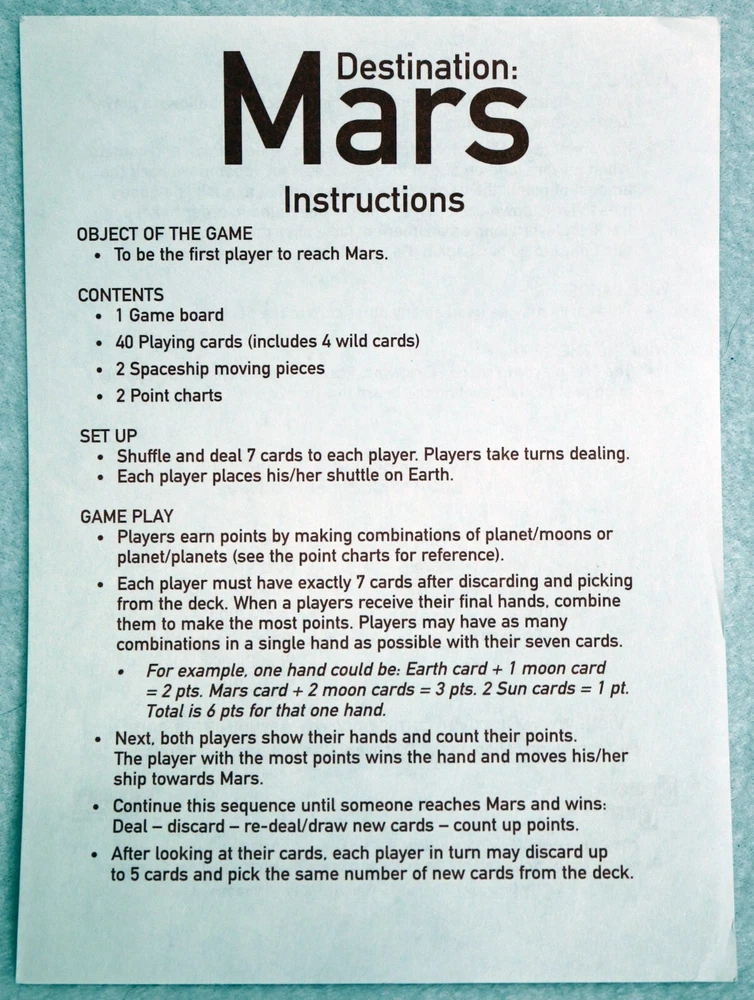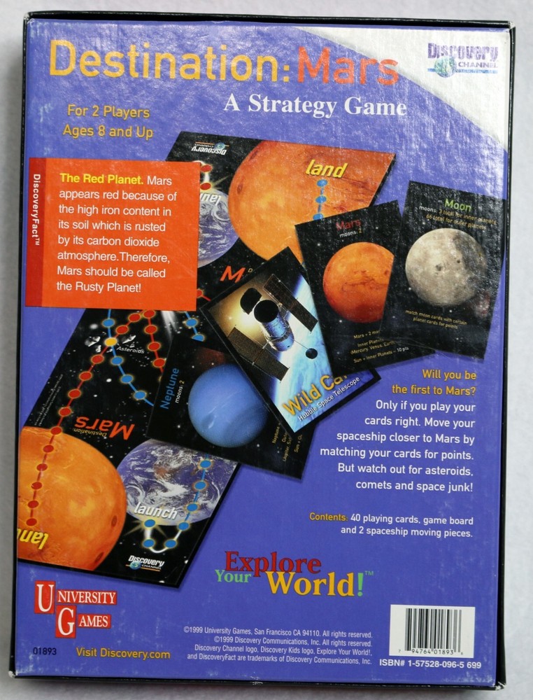 Explore the solar system and conquer the planets with DESTINATION: MARS - A Strategy Game. This complete game by University Games is perfect for two players only , ages 8 and up, who love strategy and space exploration. The game was released in 1999. The game includes a game board, playing pieces, cards, and instructions to make it easy to start playing right away. The players will take on the role of space explorers and will to compete in order to achieve their goal of landing on Mars. With its unique theme and challenging gameplay, DESTINATION: MARS is a must-have for any game enthusiast. Each item we ship is carefully packaged to prevent any damage and is shipped immediately with tracking.