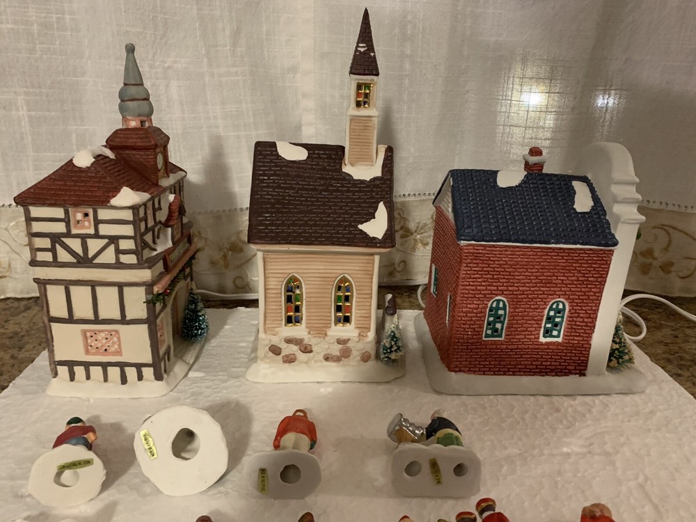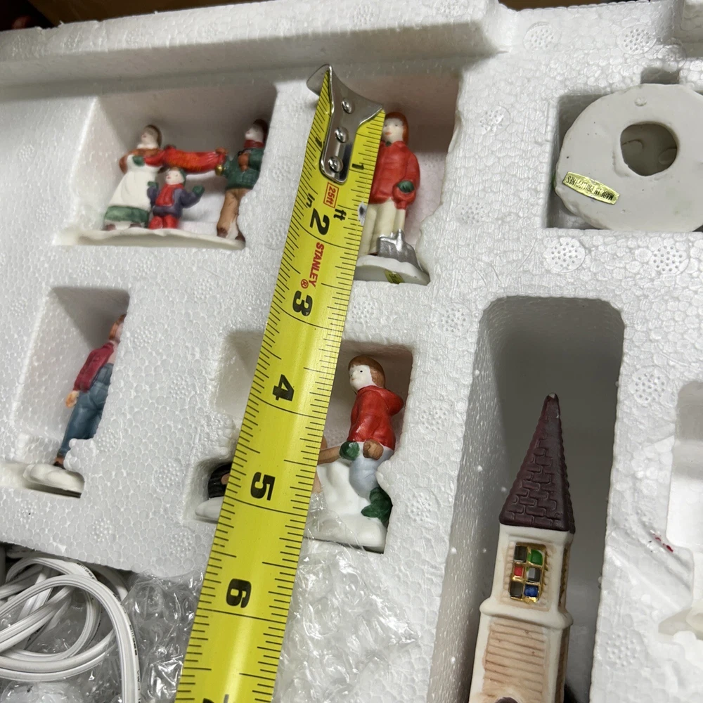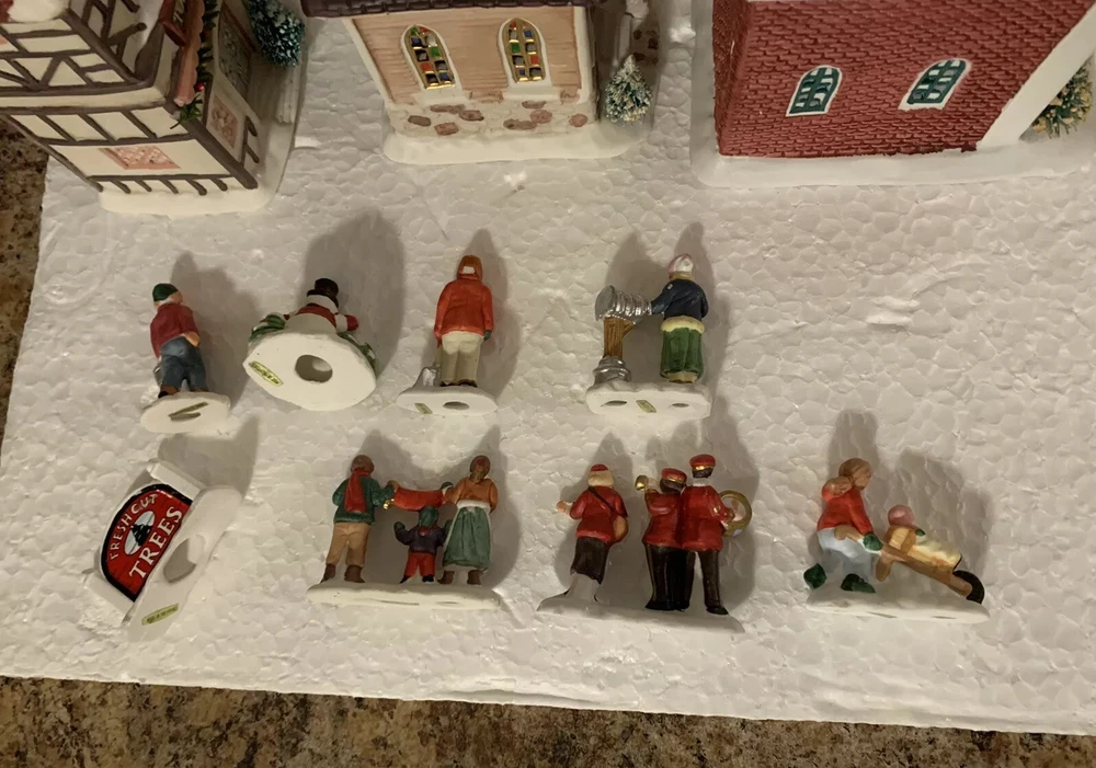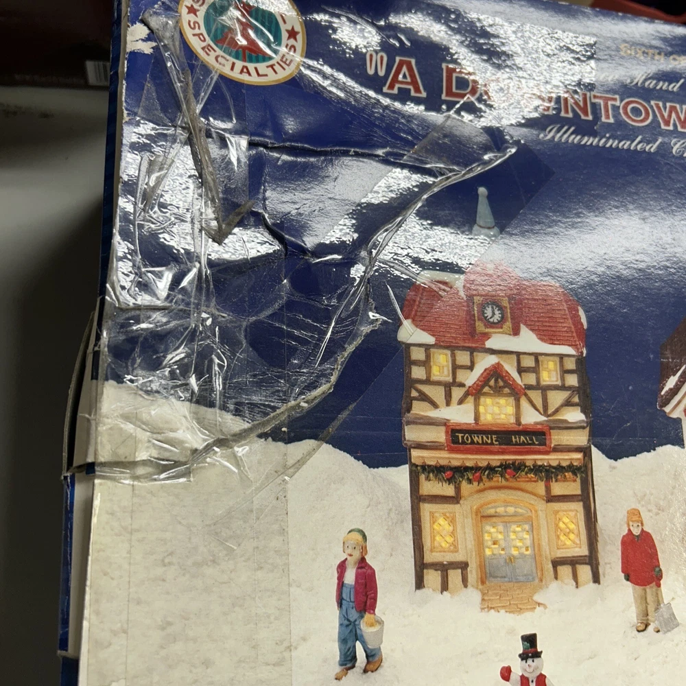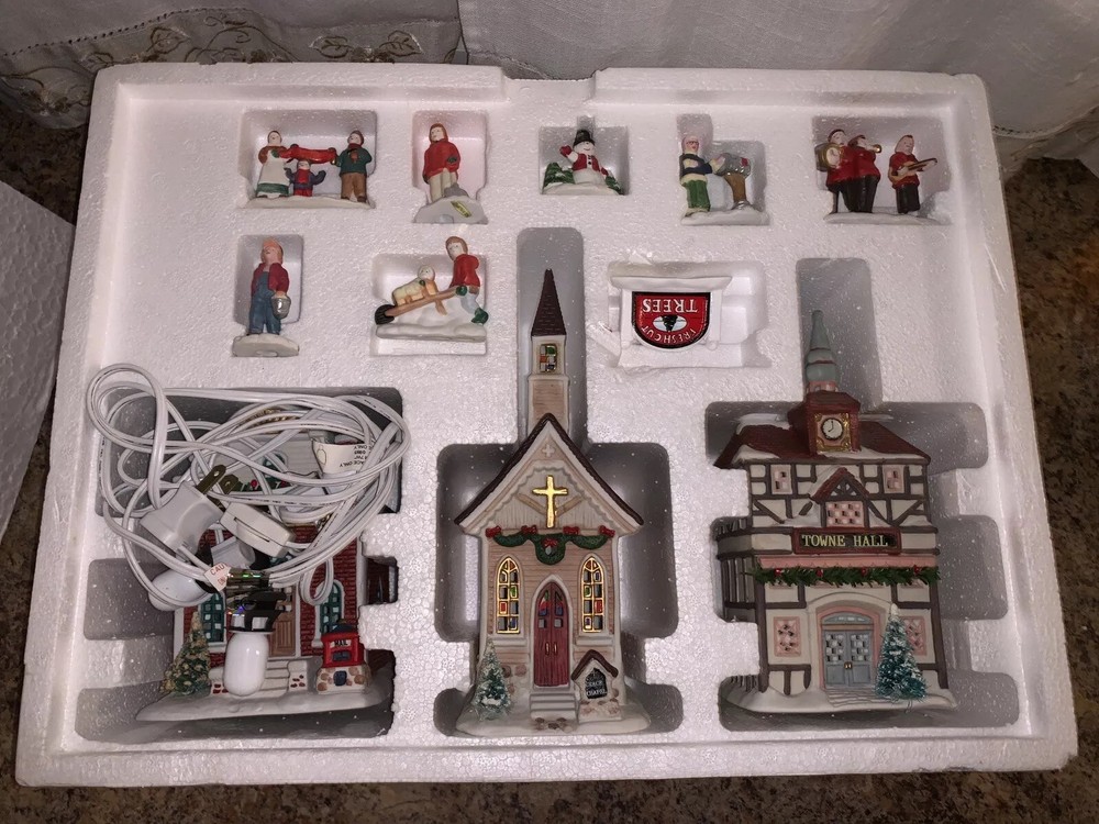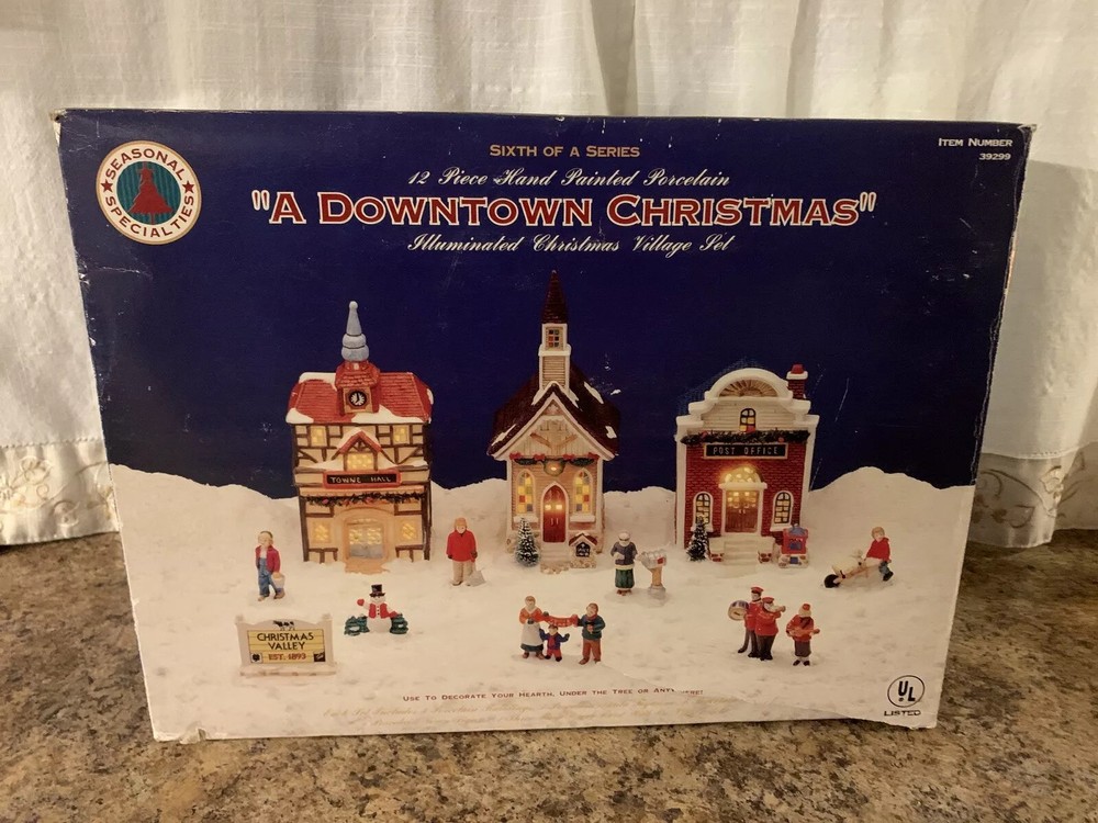 Up for sale is seasonal specialties a downtown Christmas. 12 piece hand-painted porcelain illuminated Christmas village set. What you see in the photos is what you will be receiving the lights do work as seen in photos. This is a vintage porcelain set that has normal wear from over the years there was some paint loss, the church at the very top Has a very tiny chip that is not very nice noticeable may be able to be touched up. Some figurines I have paint loss. Comes with original box and Styrofoam, the box does have wear, it is torn and taped together. Please see all photos for details and conditioners set will be sold as is thank you Boxed BW
