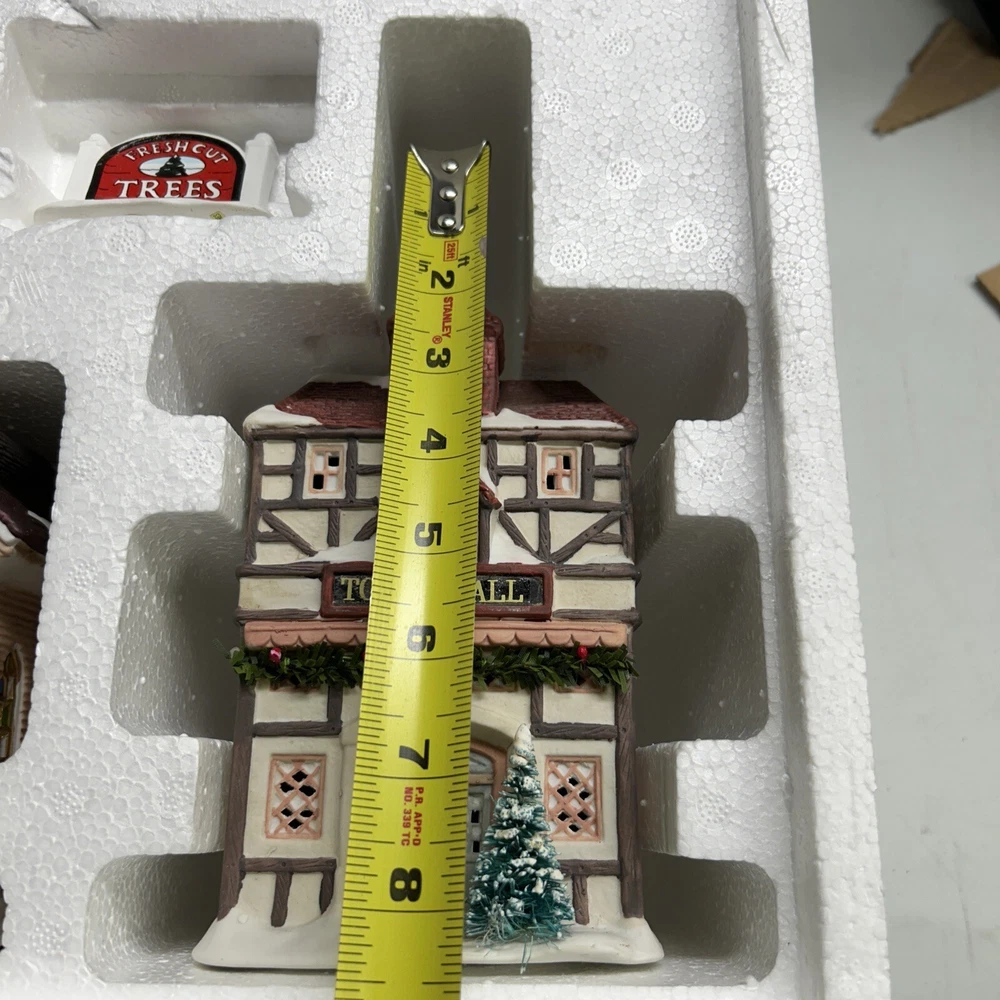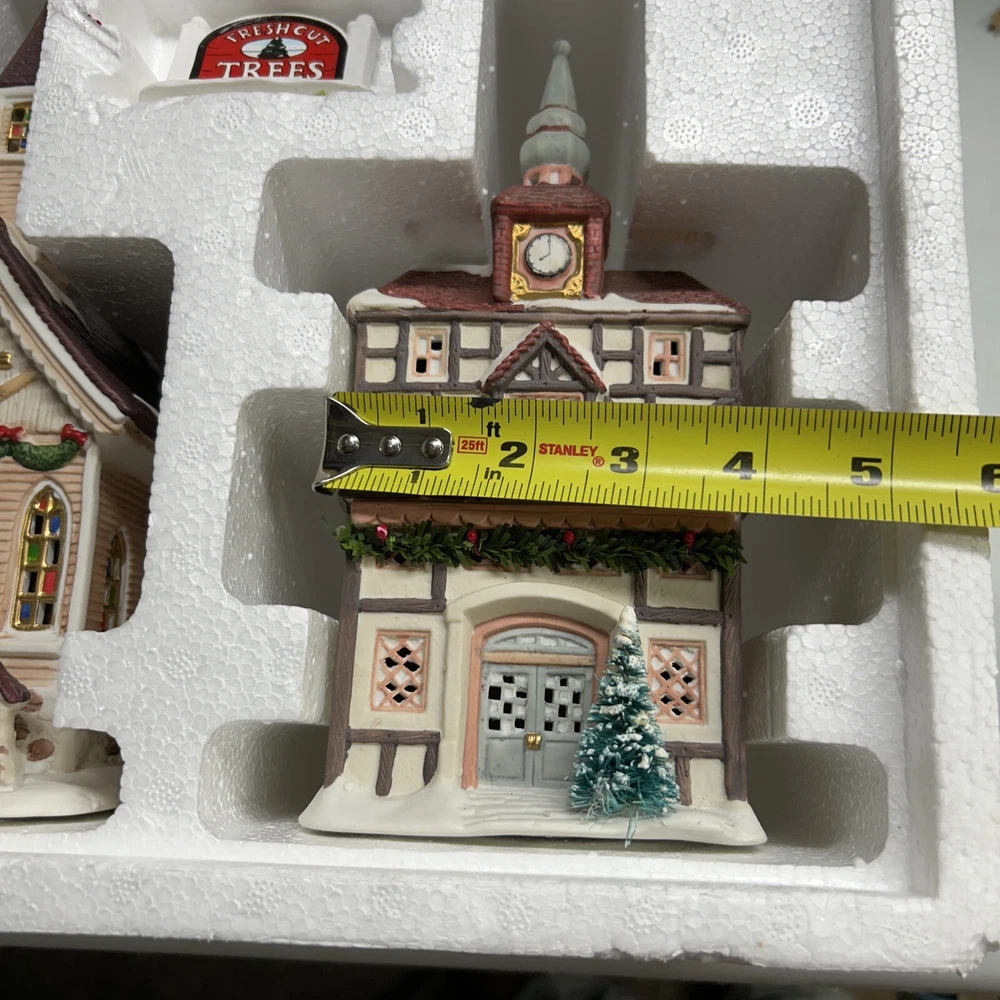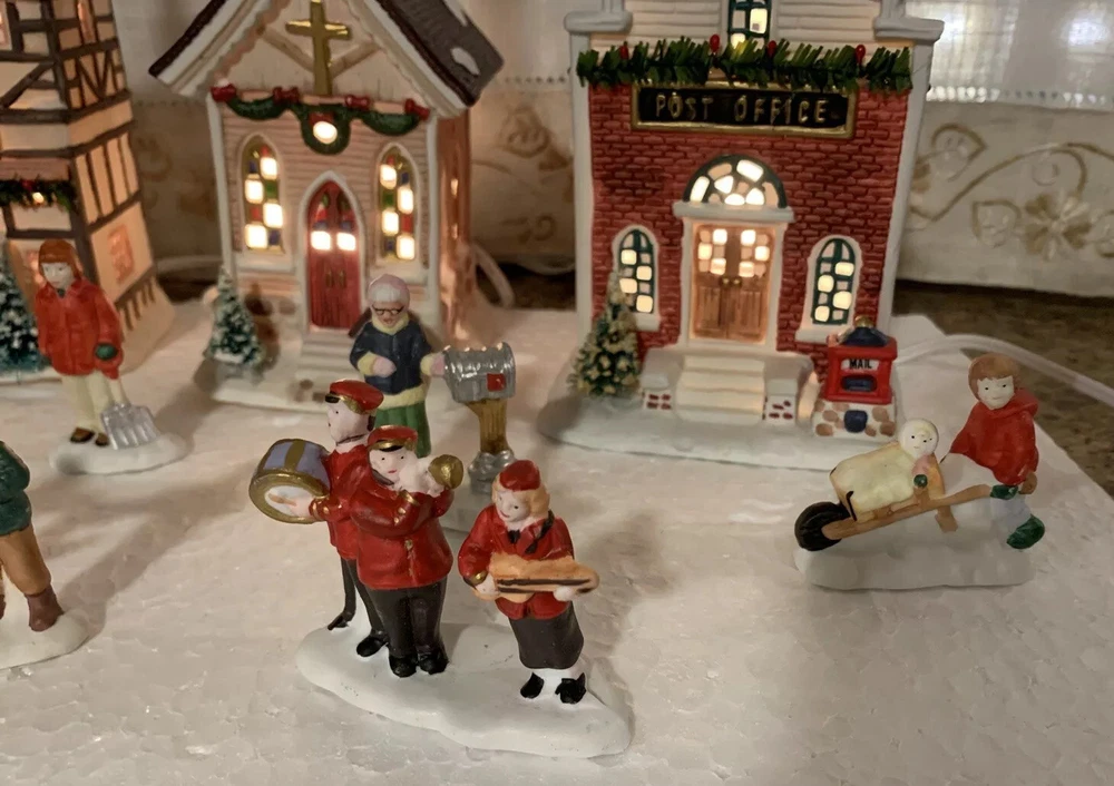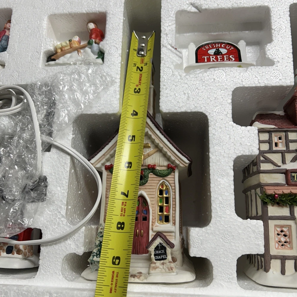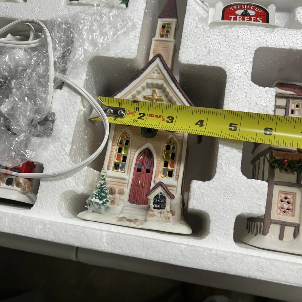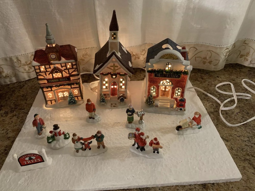 Up for sale is seasonal specialties a downtown Christmas. 12 piece hand-painted porcelain illuminated Christmas village set. What you see in the photos is what you will be receiving the lights do work as seen in photos. This is a vintage porcelain set that has normal wear from over the years there was some paint loss, the church at the very top Has a very tiny chip that is not very nice noticeable may be able to be touched up. Some figurines I have paint loss. Comes with original box and Styrofoam, the box does have wear, it is torn and taped together. Please see all photos for details and conditioners set will be sold as is thank you Boxed BW