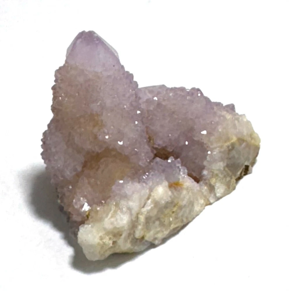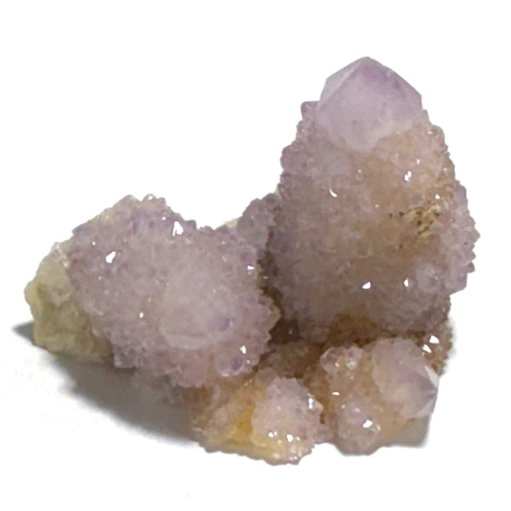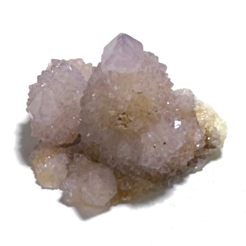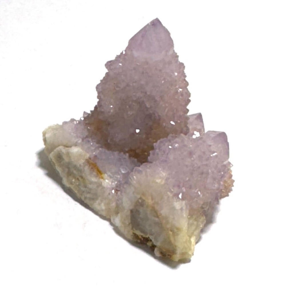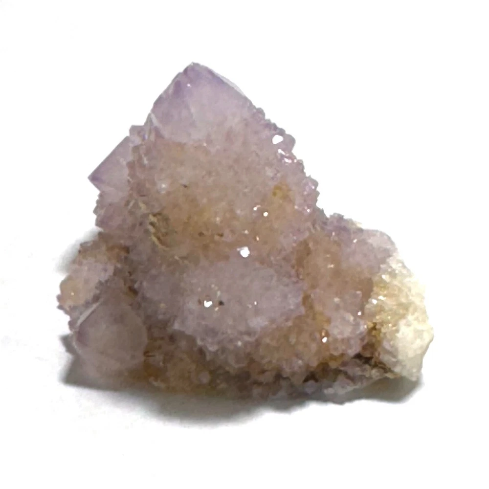 Cactus Quartz or Spirit Quartz Size Approximately 3.5 cm x 4.5 cm x 3.5 cm 33.8 g View My Other Items For Sale Visit My eBay Store Add me to your Favorite Sellers A cactus or spirit quartz is a quartz crystal that is encrusted by a second generation of smaller crystals grown on its prism faces. These crystals were first discovered in 1986 in the Magaliesberg Mountain Range near Pretoria, South Africa. It occurs as quartz, citrine and amethyst, and comes in a wide range of colors, including purple amethyst, violet amethyst, smoky, milky clear and golden citrine. FAQ/Tips Crystals are priced by quality, color and size. Purple amethyst is more highly prized and will cost more for a smaller lesser quality crystal. Lavender is the most common color and where you will find the best quality/value for price Crystals change colors with changes in type angle and intensity of light. Color may also vary between monitors. Pictures were taken in bright natural light. We do our best to give you many views so you can judge the quality of the given crystals. If you have questions please ask before bidding or buying. Many of the crystals have special color properties: Many have phantoms, not just the ones we?ve indicated. Some have ?floating? purple tips. The placement of darker purple against purple or white crystals appears to change as the crystal is turned. Many are a mixture of citrine and amethyst. The ones called ?Golden Healers? or ?Sunshine? have a rainbow effect on crystal faces. We value your feedback please contact us with problems. Items are returnable. Track Page Views With Auctiva's FREE Counter