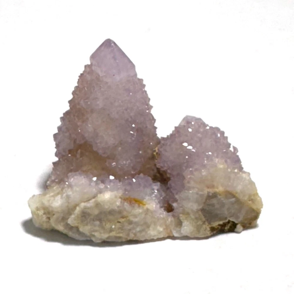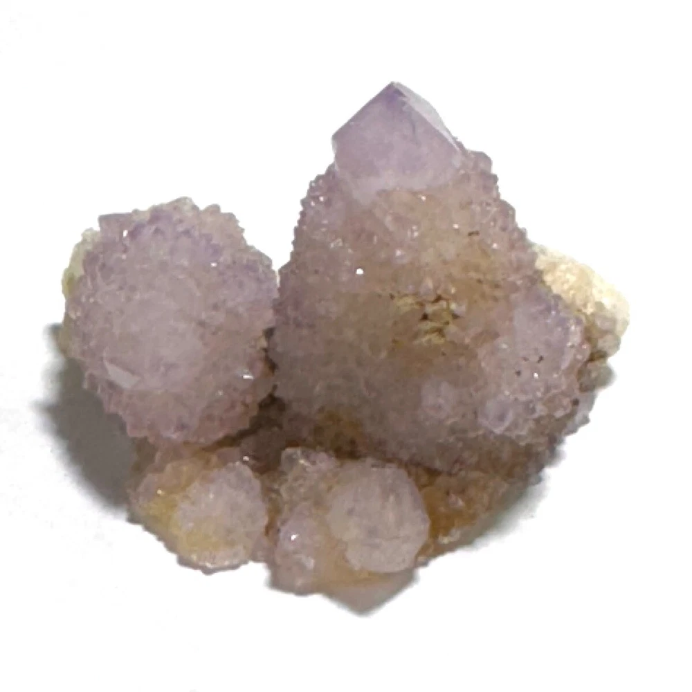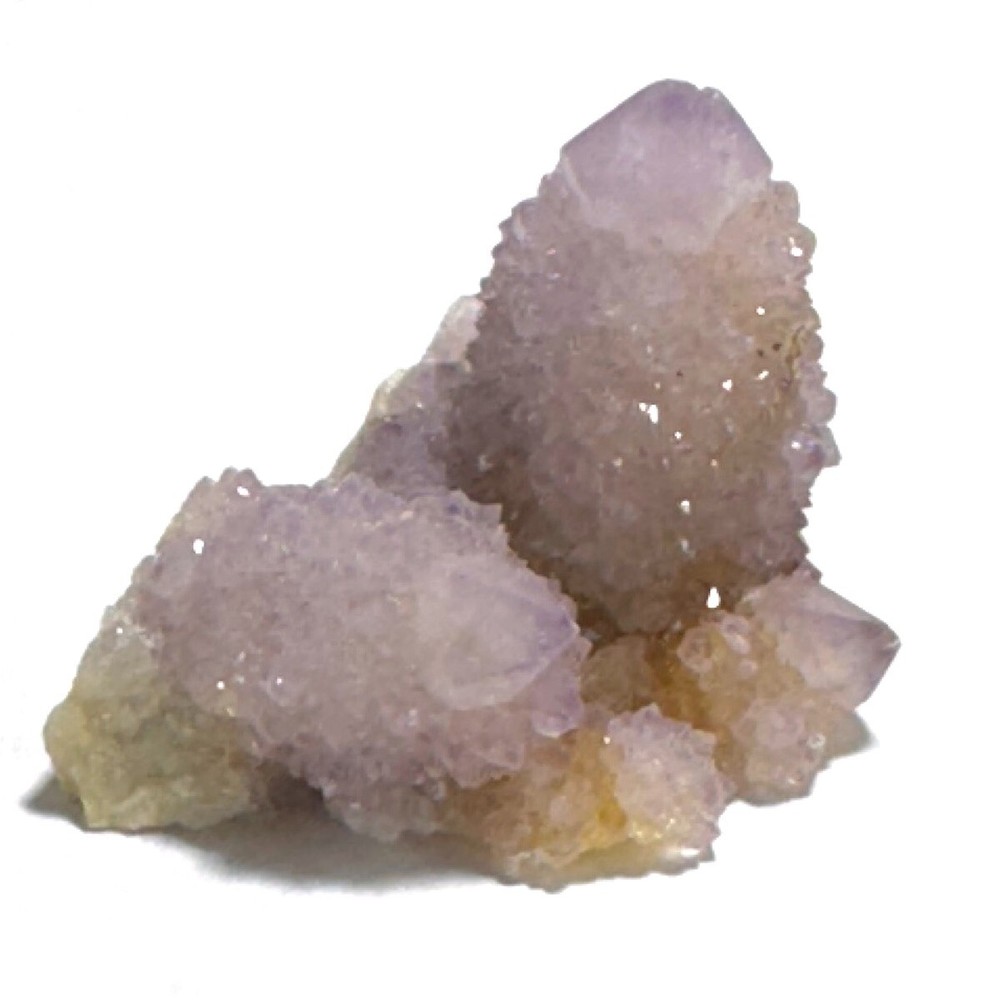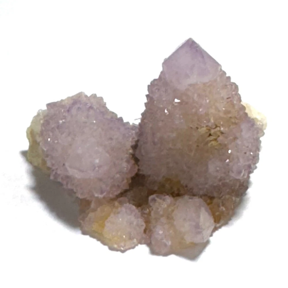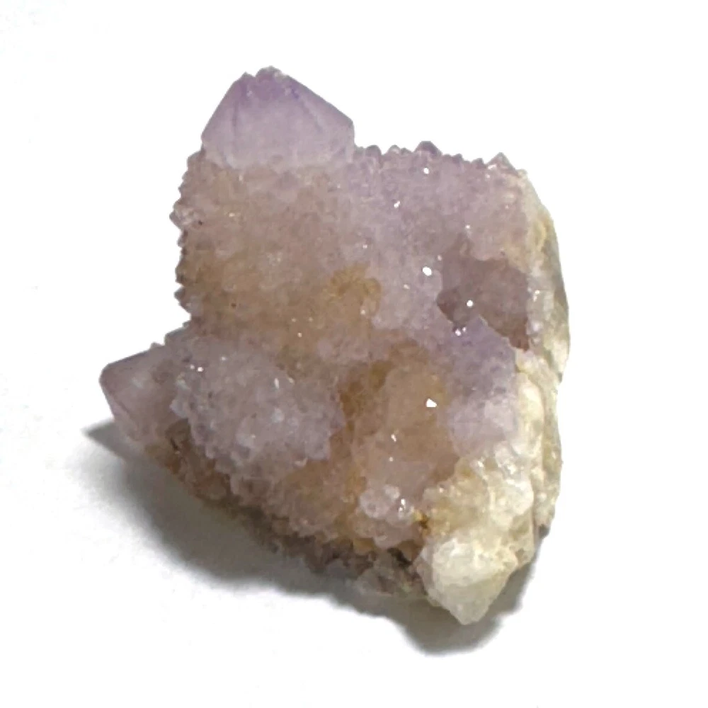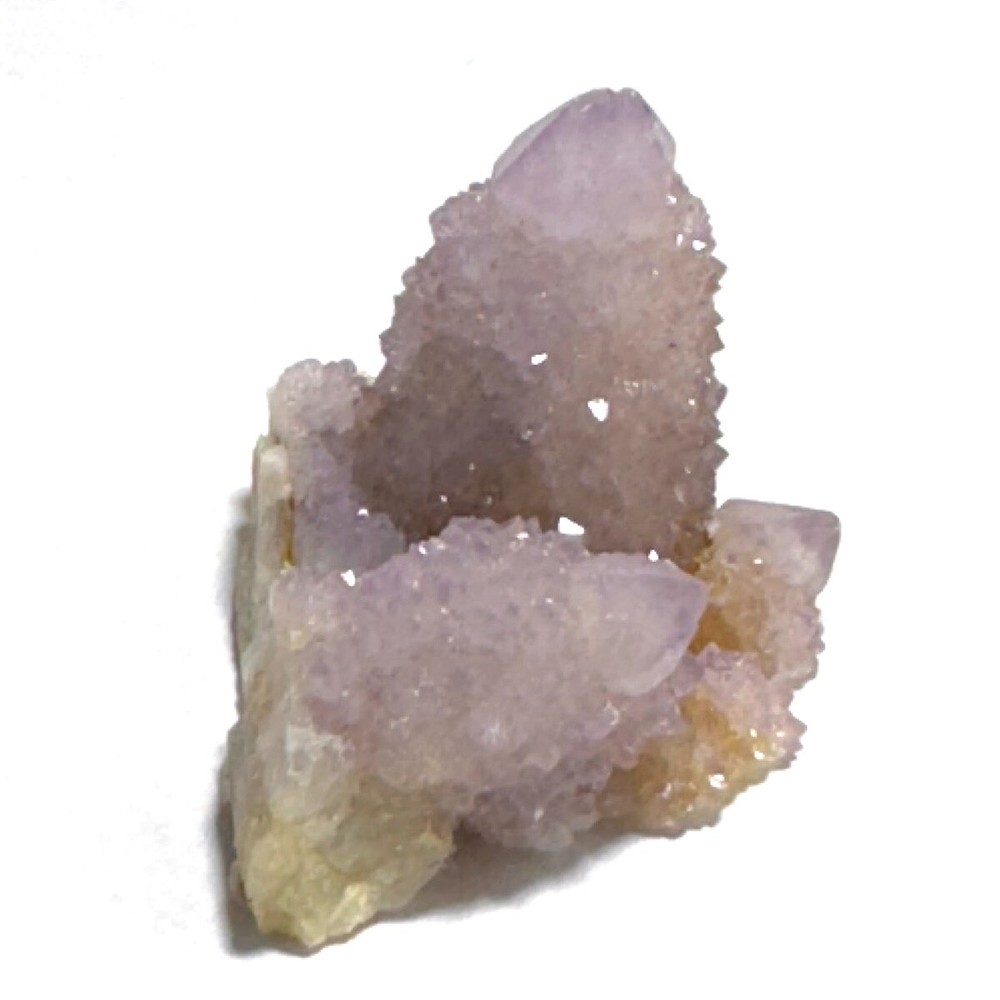 Cactus Quartz or Spirit Quartz Size Approximately 3.5 cm x 4.5 cm x 3.5 cm 33.8 g View My Other Items For Sale Visit My eBay Store Add me to your Favorite Sellers A cactus or spirit quartz is a quartz crystal that is encrusted by a second generation of smaller crystals grown on its prism faces. These crystals were first discovered in 1986 in the Magaliesberg Mountain Range near Pretoria, South Africa. It occurs as quartz, citrine and amethyst, and comes in a wide range of colors, including purple amethyst, violet amethyst, smoky, milky clear and golden citrine. FAQ/Tips Crystals are priced by quality, color and size. Purple amethyst is more highly prized and will cost more for a smaller lesser quality crystal. Lavender is the most common color and where you will find the best quality/value for price Crystals change colors with changes in type angle and intensity of light. Color may also vary between monitors. Pictures were taken in bright natural light. We do our best to give you many views so you can judge the quality of the given crystals. If you have questions please ask before bidding or buying. Many of the crystals have special color properties: Many have phantoms, not just the ones we?ve indicated. Some have ?floating? purple tips. The placement of darker purple against purple or white crystals appears to change as the crystal is turned. Many are a mixture of citrine and amethyst. The ones called ?Golden Healers? or ?Sunshine? have a rainbow effect on crystal faces. We value your feedback please contact us with problems. Items are returnable. Track Page Views With Auctiva's FREE Counter