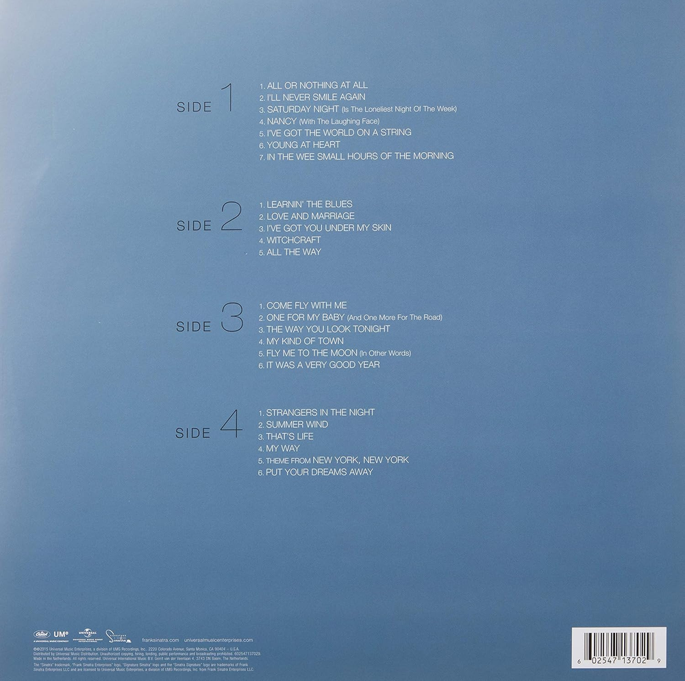 The defining voice of the 20th century, Frank Sinatra enjoyed a legendary recording career that spanned six decades, beginning with his earliest session in 1939 and culminating with his last in 1993, for his world-renowned, multi-platinum Duets and Duets II albums. Ultimate Sinatra presents key recordings spanning the Chairman of the Board s recordings for Columbia, Capitol and Reprise, together for the first time. Ultimate Sinatra's 180-gram 2LP version brims with 24 stellar recordings representing a cross-section of Sinatra's unparalleled recording career. Led by 'All Or Nothing At All,' this collection is stacked with standouts, including 'I'll Never Smile Again' (1940), 'I've Got The World On A String' (1953), 'In The Wee Small Hours Of The Morning' (1955), 'I've Got You Under My Skin' (1956), 'Come Fly With Me' (1957), 'The Way You Look Tonight' (1964), 'Fly Me To The Moon (In Other Words)' (1964), 'Strangers In The Night' (1966), 'My Way' (1968), and 'Theme From New York, New York' (1979), among many more.