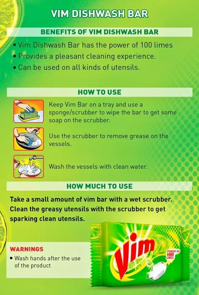Vim Dish Wash Bar Fresh Lemon . Product Overview: Brand: Vim Type: Dishwash Bar (100g) Fragrance: Fresh Lemon Key Features: Contains real lemon juice Removes tough stains, especially burned food stains Gives a pleasant cleaning experience with a refreshing lime fragrance Cleans oil and grease effectively Skin-friendly pH and aluminium-safe Unique plastic coating to prevent sagging, making it last longer Removes odor How to Use: Wet a scrubber, take a small amount of Vim bar, and use it to clean dirty vessels for sparkling clean utensils. Shipping Information: Ships within 1 - 5 business days from Sri Lanka to the buyer's eBay registered address. Buyer is responsible for any import duties or taxes. Return Policy: Returns accepted only if the product is damaged or not as described. Notify within 30 days after receiving the item, with the buyer covering return shipping costs. Additional Notes: Positive feedback is greatly appreciated! Is there anything specific you'd like help with regarding this product or more details on?