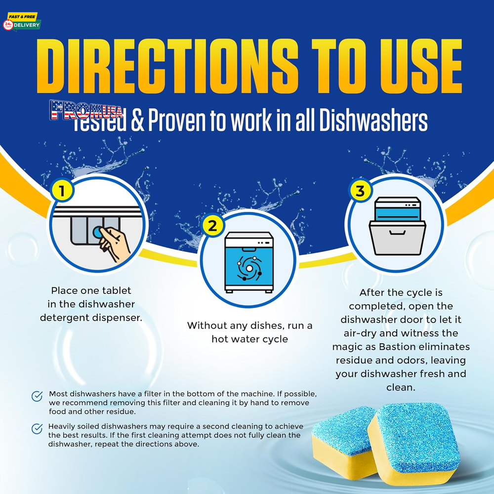 Menu Other Items Feedbacks About Us Contact Us Add To Favorites Dishwasher Cleaner Tablets - 24 Tablets (1-Year Supply) Lemon-Scented, Heavy Duty Cleaning Descaler Pods for Dish Washer, Deep Cleans & Maintains Your Dishwashing Machine for Optimal Performance 12-Month Supply for Continuous Cleaning: Get a full year of heavy-duty cleaning with 24 powerful tablets, perfect for keeping your dishwasher running smoothly month after month. Lemon Fresh Scent: Experience a burst of freshness with every cycle! Bastion Dishwasher Cleaner Tablets are infused with a delightful lemon scent, leaving your dishwasher smelling clean and fresh. Deep Cleaning Action for a Spotless Dishwasher: Effectively removes grease, grime, limescale, and buildup, ensuring your dishwasher operates at peak performance and stays sparkling clean. Easy to use: Just place one tablet in the dishwasher's detergent compartment and run a normal wash cycle. No mess, no hassle – just an incredibly clean dishwasher ready for your next load. Protects and Extends Dishwasher Lifespan: Regular use helps prevent clogs, buildup, and unpleasant odors, extending the lifespan of your dishwasher and ensuring it continues to function optimally. Ideal for all major dishwasher brands. Product description Discover More From Bastion Add to Cart Add to Cart Add to Cart Add to Cart Add to Cart Add to Cart Customer Reviews 4.5 out of 5 stars 1,625 4.0 out of 5 stars 109 4.5 out of 5 stars 205 4.5 out of 5 stars 3,850 — 4.3 out of 5 stars 612 4.4 out of 5 stars 1,500 Price $9.99 $ 9 . 99 $16.95 $ 16 . 95 $17.95 $ 17 . 95 $9.99 $ 9 . 99 — $19.95 $ 19 . 95 $23.95 $ 23 . 95 Intended Use: Dishwasher Garbage Disposal Coffee Machine Washing Machine Multi-Use Toilet Tank Garbage Disposal Contents: 24 Tablets 24 Tablets 24 Tablets 24 Tablets 7 oz of Power Gel 6 Packets 24 Packets Form: Tablet Tablet Tablet Tablet Gel Powder Packet Scent: Lemon Citrus Unscented Unscented Unscented Unscented Citrus Cleans: ✔ ✔ ✔ ✔ ✔ ✔ ✔ Descales: ✔ ✘ ✔ ✔ ✘ ✔ ✘ Maintains: ✔ ✔ ✔ ✔ ✔ ✔ ✔ Item Specification Item model number RBDWC24 Item Form Tablet Brand Bastion Package Dimensions 7.17 x 6.57 x 0.67 inches; 3.53 ounces Material Feature Biodegradable, Cruelty Free, Vegan Scent Citrus, Lemon Specific Uses For Product Dishwasher Manufacturer Rutledge Brands Dimensions Shipping Returns Additional Info Product Dimensions: 6.57 inches x 7.17 inches x 0.67 inches. Weight: 3.53 oz Fast shipping is very important for us. Our standard shipping service is FREE. Your order will be shipped within 1-3 business days upon full payment received. Most items are delivered within 3-5 business days, however, please allow 3-10 business days. We are shipping only to USA. We only ship to the confirmed Paypal address. We reserve the right to cancel any order for any reason at any time. We are not responsible for undeliverable addresses. We offer a 30 day return policy from checkout winning date. Your satisfaction is guaranteed! If for any reason you are unhappy with your item, just return it within 30 days for a full refund, minus shipping cost. Please contact us prior to initiating a return so that we can issue you a refund authorization. Items defective upon receipt must be packaged in their retail packaging as if new and returned with a detailed description of the problem. Return shipping fees are not refundable. We reserve the right to decline any returns if the above guidelines are not followed. All of our items, unless otherwise stated, will only run on 120 volts. Please check to make sure your country complies with these specifications. If you have a problem or question regarding your transaction please contact us before leaving any type of feedback. We will work with you to resolve any problem you may have.