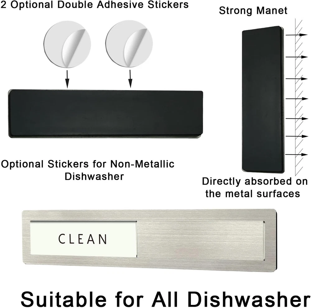 Dishwashing Made Easy: The dishwasher magnet is a great reminder tool. We can know whether the dishes are clean without opening the dishwasher, making it perfect for busy offices or homes. 'Is it dirty or clean?' Now, we can stop the guessing game High-Quality Stainless Steel: Dishwasher magnet clean dirty sign is made of 304-grade stainless steel, featuring high strength, corrosion resistance, ease of cleaning, resistance to deformation, and color retention. The stylish modern design perfectly complements your dishwasher, making it look like a part of the appliance Upgrated High-Quality: The Clean dirty magnet for dishwasher made with expert craftsmanship, the polished edges are smooth and free of burrs, both ends of the stainless steel slider have raised portions, making it easier to slide, strong magnet on the back for easy installation. The "CLEAN-DIRTY" sign has high-contrast colors for clear and easy readability Suitable For All Dishwashers: Size 7 "x 1.6". The dirty clean dishwasher magnet uses strong, scratch-free magnets that easily attach to the magnetic dishwasher door. If your dishwasher has a non-magnetic surface, please use two additional adhesive stickers Unique Gift Ideas: Dishwasher clean dirty sign is an essential item for every kitchen and makes a great gift for Christmas, Mother's Day, housewarming, and weddings. It is an excellent tool for cultivating good habits and promoting a harmonious family atmosphere. Our magnet packaging is modern and stylish, making it the perfect gift for family, friends, and colleagues Maintenance: Please remove this sign weekly and clean the back magnet with a clean cloth (included with the product) to prevent the accumulation of kitchen water stains and oil stains from affecting the product's lifespan Product Description Why every kitchen needs it? It's a simple visual aid to answer the age old question: Are the dishes in the dishwasher dirty or clean? Is this dishwasher magnet suitable for all dishwashers? Yes, the magnets adhere firmly to the metal dishwasher surface, extra self-adhesive stickers is included in the package for you to use on any non-magnetic dishwasher surface. Will it leave marks or damage my dishwasher? No, the non-scratch design ensures that the magnet will not leave marks or cause any damage to the surface of your dishwasher. Is it good quality? The premium 304 stainless steel frame and acrylic lettering are waterproof and durable, 1 mm thick soft magnet is magnetically strong, great quality and nice looking. How to maintain it? Remove this sign weekly and clean the magnet with a clean cloth (included with the product) to prevent the accumulation of kitchen water stains and oil stains.
