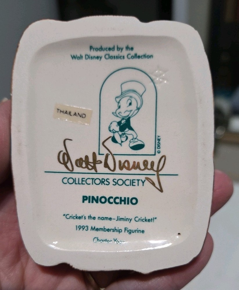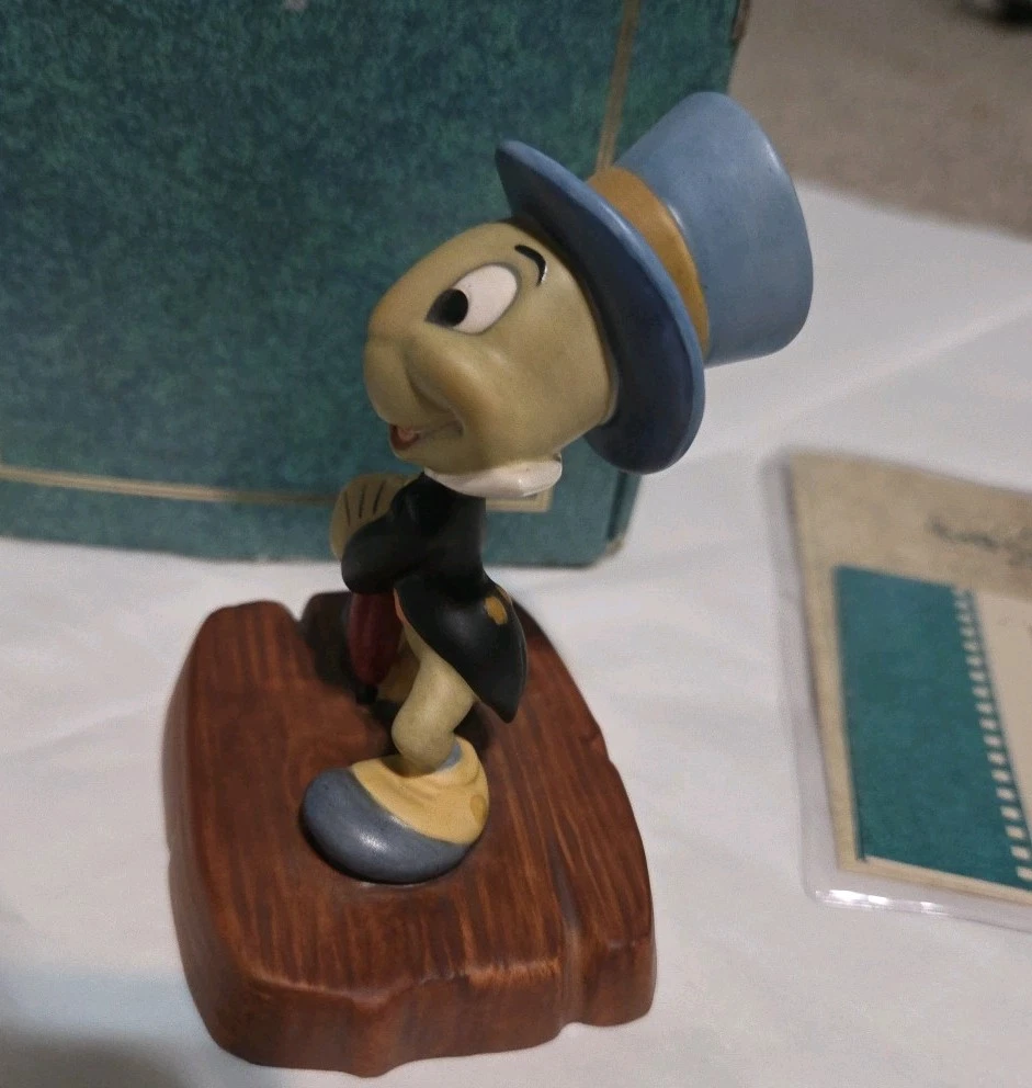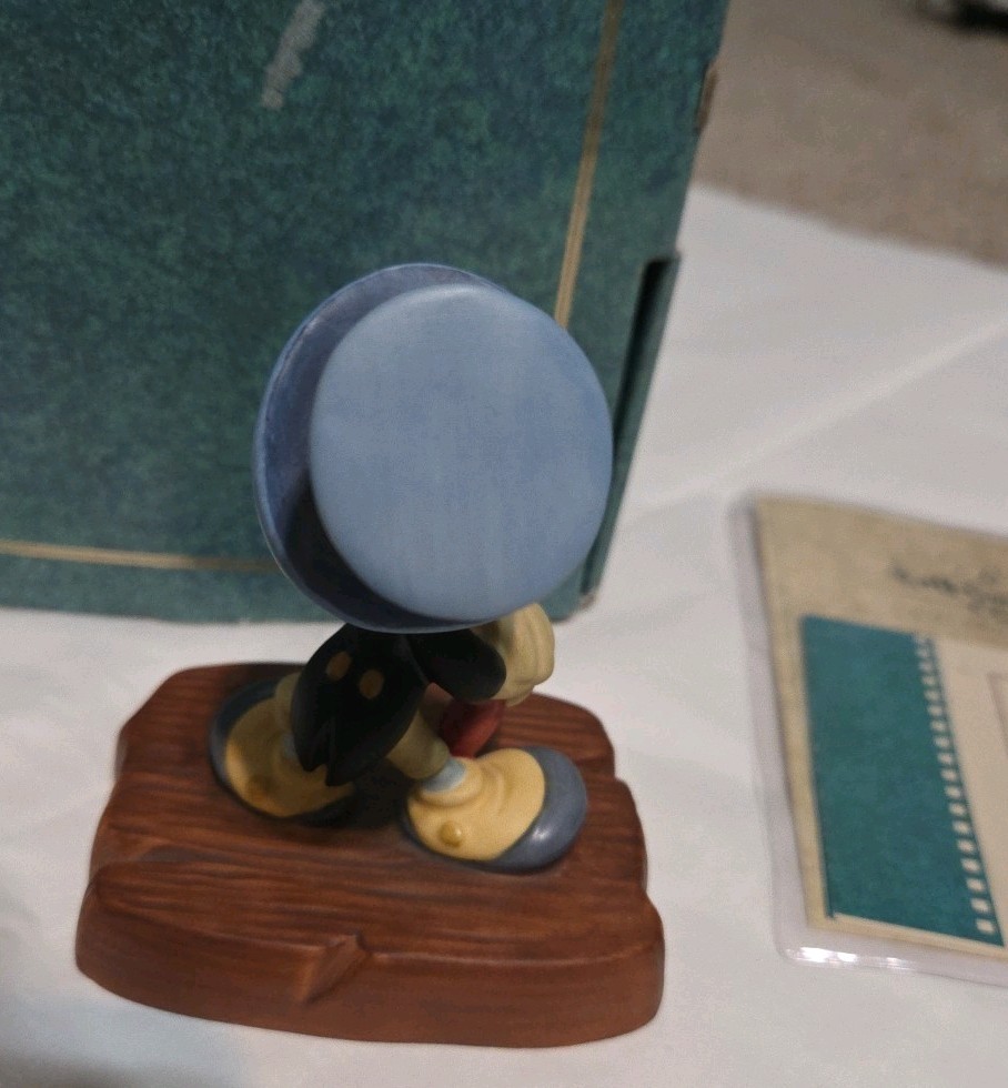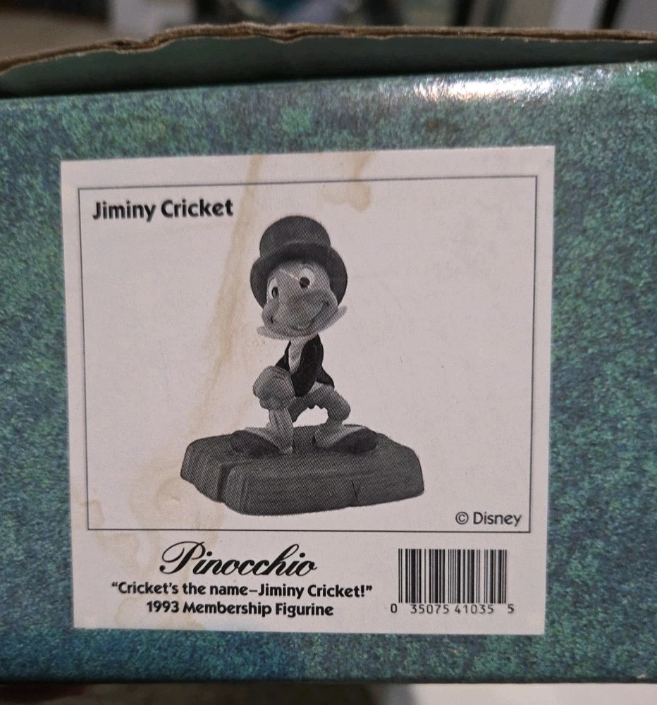 The product is a Disney 1993 WDCC Pinocchio's Jiminy Cricket membership figurine with a pin and certificate of authenticity. This figurine, standing at 3 3/4 inches tall, was manufactured in Thailand as part of the WDCC franchise. It is a collectible item that celebrates the Disney character Jiminy Cricket and is a part of Disneyana, making it a sought-after piece for fans and collectors alike. The figurine and pin are in like new condition. the box shows signs of storage wear - a stain on the side, a mark on the top, lightly warped cardboard as shown in photos.