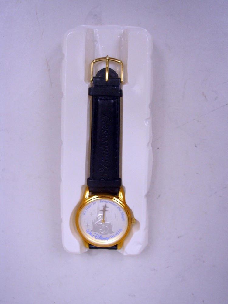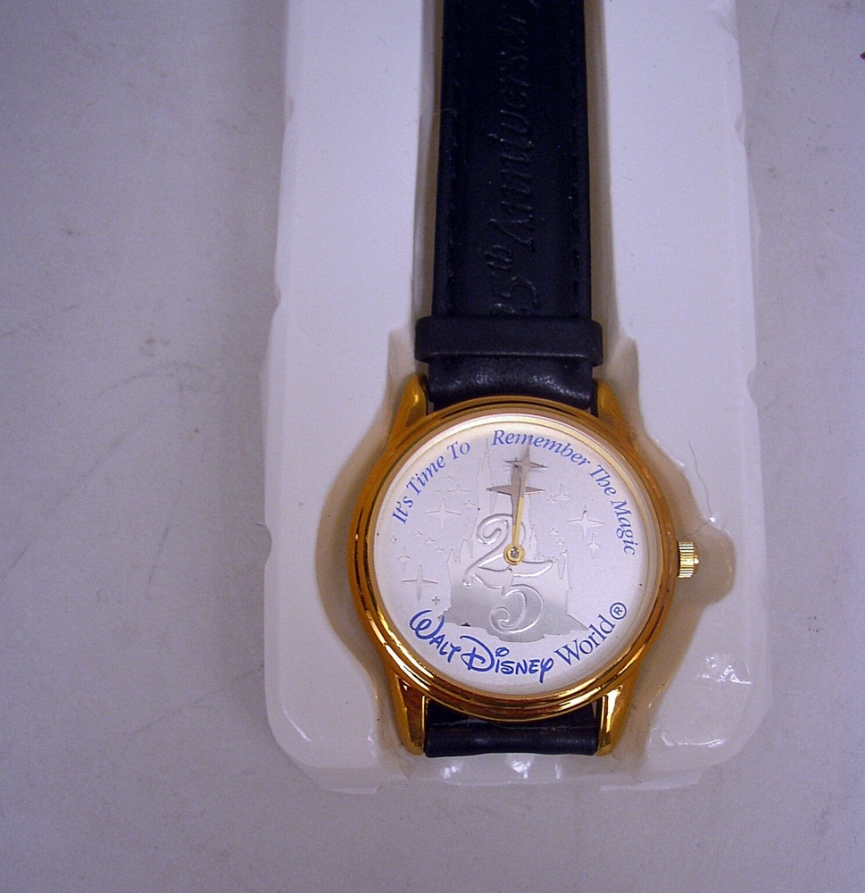 Welcome To My Dolly Dearest on eBay.....an experience in collecting! 1997 Disney 25th Anniversary Watch by Eastman Kodak Disney 25th Anniversary Watch designed and manufactured by Eastman Kodak in 1997. The dial is silver and features Cinderella's castle with 25 in the center. Around the perimeter of the dial is says "Walt Disney World" & "It's Time To Remember The Magic" and "Walt Disney World®". The watch has a black leather band that is imprinted on the band "25th Anniversary" and "Walt Disney World". There is a star on the end of each hand. It comes packed in it's original box (shows storage wear and crushing but has protected the watch), still in the original liner, and has never been used. It will need a new battery and band. Being sold "AS IS". PLEASE NOTE: Due to the age of the watch, where the band connects to the watch has disintegrated. The band will need to be repaired. * * * * * * * * * * * * Shipping for this item is $7.50 in the lower 48 states and includes tracking Additional Shipping Charge To Alaska & Hawaii * * *PLEASE NOTE: * * * Due to the alarming high rate of non-paying bidders, payment is required immediately after purchase. Every item is described in detail and each item is sold "as is" with no implied or inferred warranties or claims. Many items sold are vintage, used, or old store stock and may not be perfect. It may not be known if items are smoke or pet free and do our best to point out any defects or flaws. If something is not in the picture, do not assume it is included unless stated in the description. If in doubt, please send us a message through ebay's "contact seller" link. eBay is powered by feedback and we are very proud of our 100% positive feedback rating. In the event you are not completely satisfied with your purchase, please contact us DIRECTLY before opening a case with eBay or leaving negative or neutral feedback. We will do our best to make this a good experience for you on eBay.